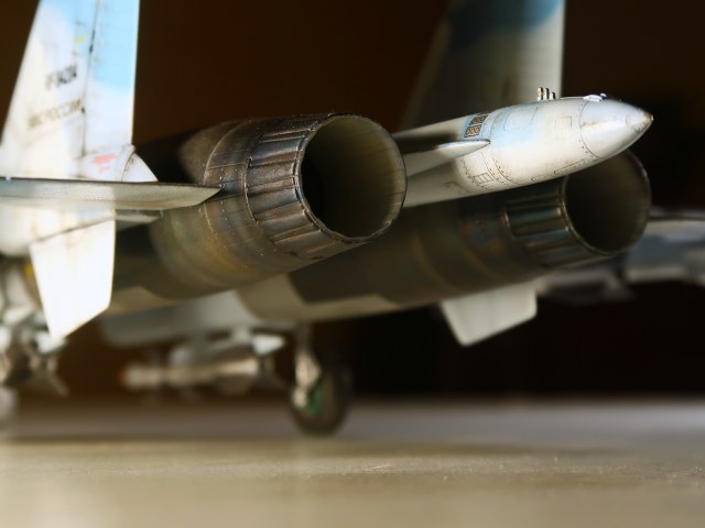 килей (не очень понятно по какой ТАКОЙ причине они покрашены именно в белый?), в/з в основании правого киля (должен быть в цвет РПО на киле), стаб с какого-то снизу камуфлирован, ГСН Р-27Р покрашены зачем-то красным (на имитацию защитных красных колпаков никак не тянет). Антенны на задней кромке левого киля (под РП законцовками), включая хвостовой огонь (!) также красным покрашены, хотя по факту бакелитовая только вторая, а верхняя - рогатина АФС "Пион" цвета металла. А на правом киле вторая с цвет РПО.