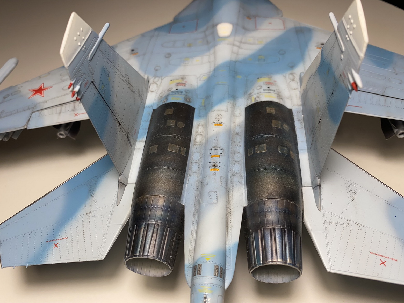 Кстати говоря , немного удивляет и вызывает сомнение граница белого с камуфляжем на килях , верхушки килей , радиопразрачный с голубым , и что еще более , так это расположение тепловых ловушек на хвостовой балке . Я такого не видел раньше . Если это дано в инструкции , то скорее всего косяк . Хотя не буду утверждать .