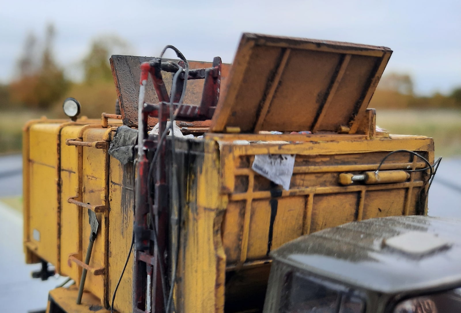 Представляю Вашему вниманию свою очередную работу.Масштаб 1.43 Модель ЗиЛ-130 от "автоистории".Модель полностью была разобрана,снята заводская краска.Кабина загрунтована и покрашена с балона "kudo" Доработан салон:на полу линолиум,на сидениях накидки,магнитик с путёвкой на торпеде,канистра,добавлены педали,ручка заменена на проволоку 0.3мм.Выпилил отверстие под открытый лючок.Дворники и зеркала из фототравления.Заменена полностью вся оптика,добавлены доп фары.Бункер распилен,имитированы открытые стаорки,на манипуляторе из проволоки сделаны гидрошланги.Задняя оптика с подложками,проводками.Добавлена нижняя балка.Резинас дисками также заменены.Подставка из фанеры,Баки из метала,с имитацией вмятин.Описывать можно бесконечно,поэтому весь подробный процесс создания можно посмотреть в альбоме на моей странице вконтакте.