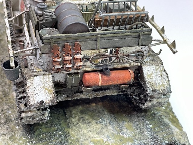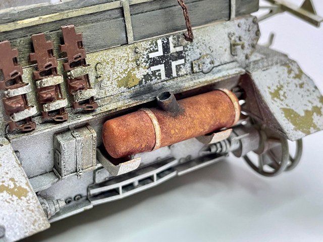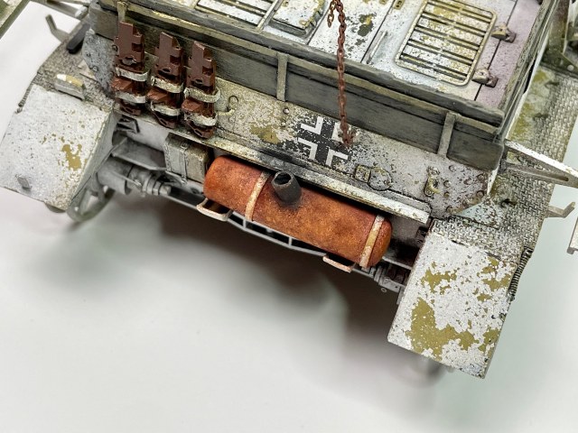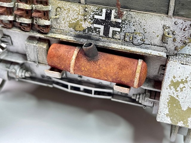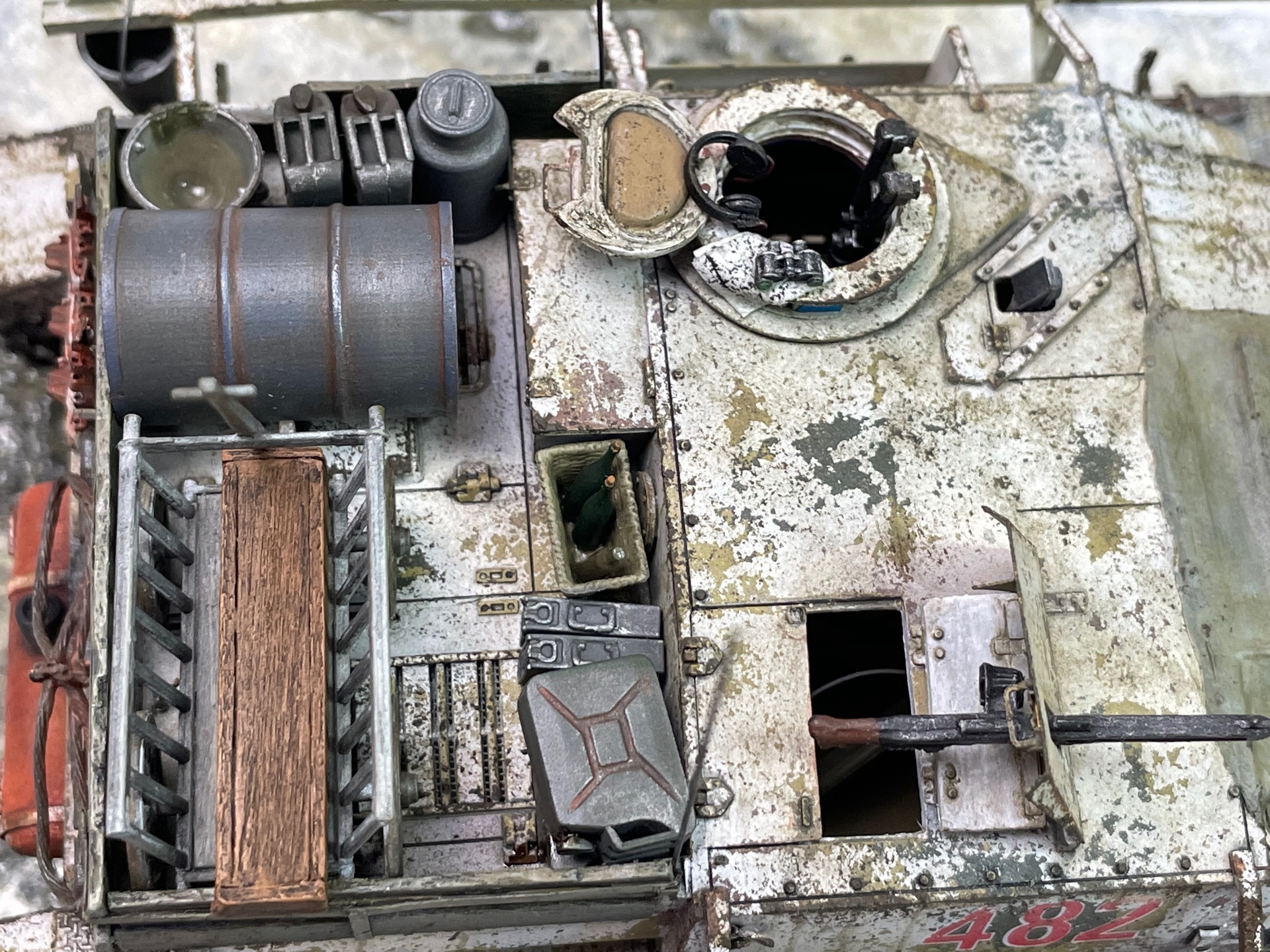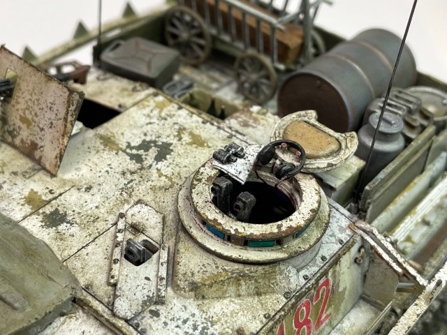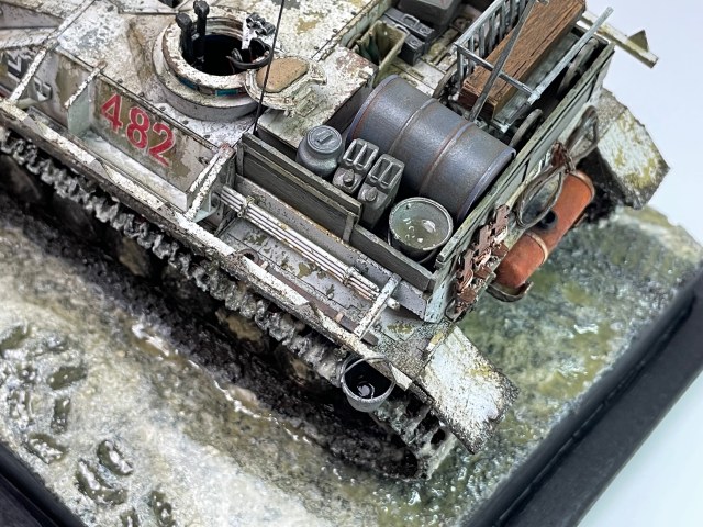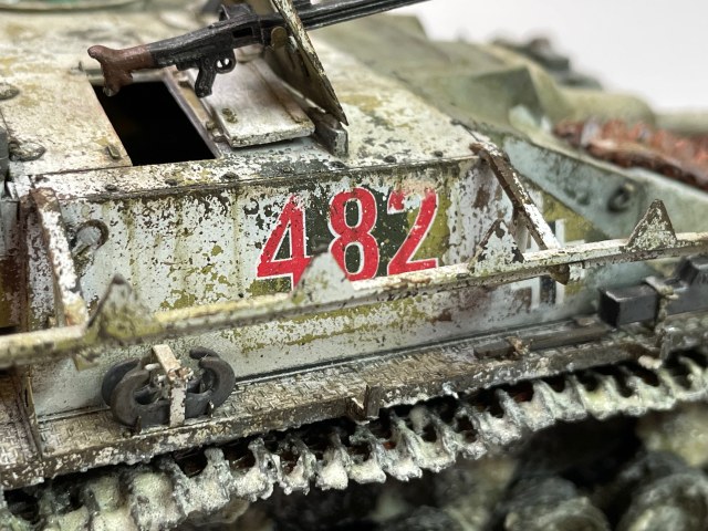 При нанесении основного камуфляжа использовались краски фирмы Tamiya XF-64 (красно-коричневая) и XF-58 (оливково-зеленая) с применением жидкости для создания эффекта облезания краски от AK INTERACTIVE AK089 (экспериментировал), после чего были нанесены декали и покрыт слой сатинового лака от AMMO A.MIG-2052.