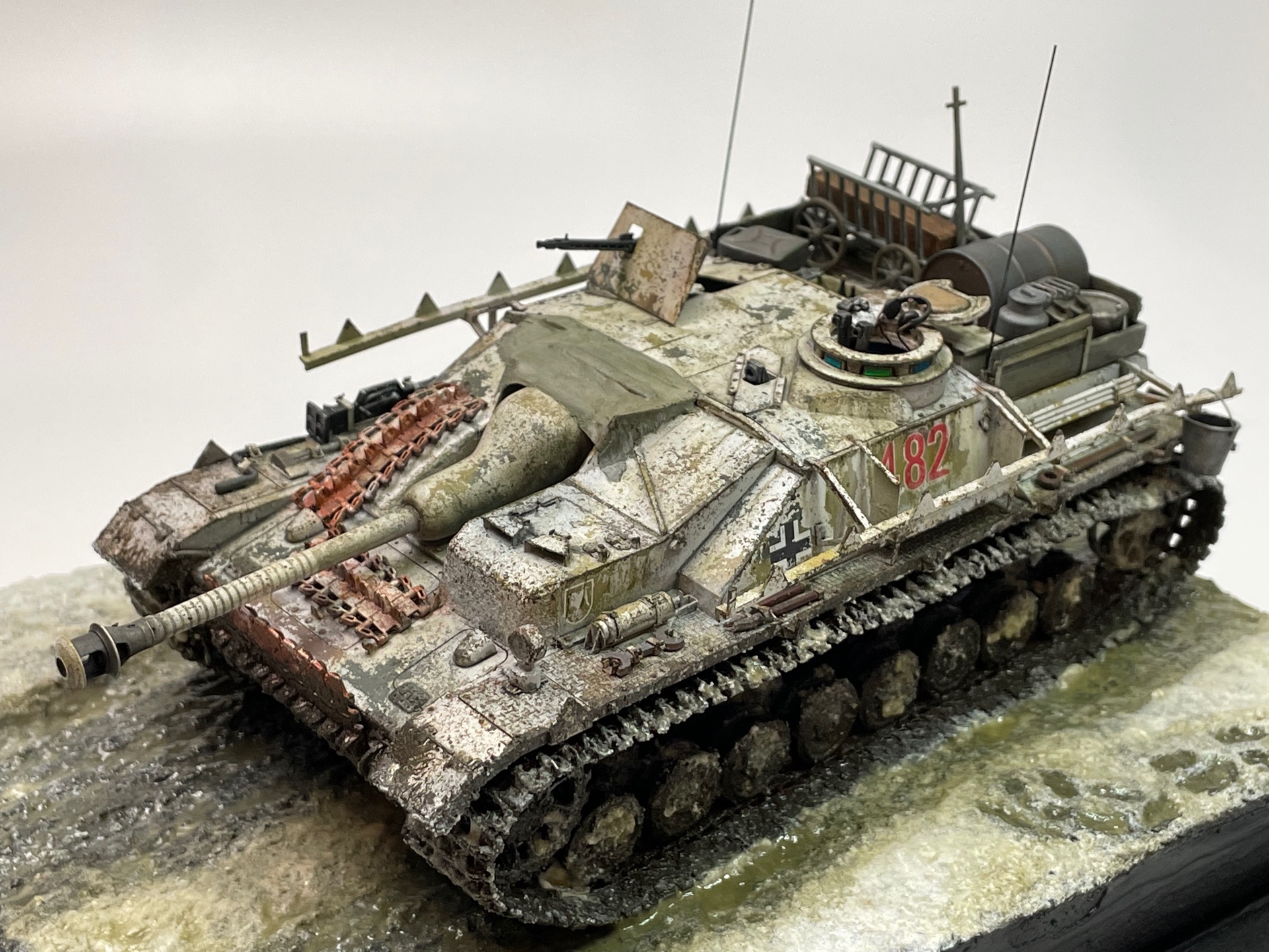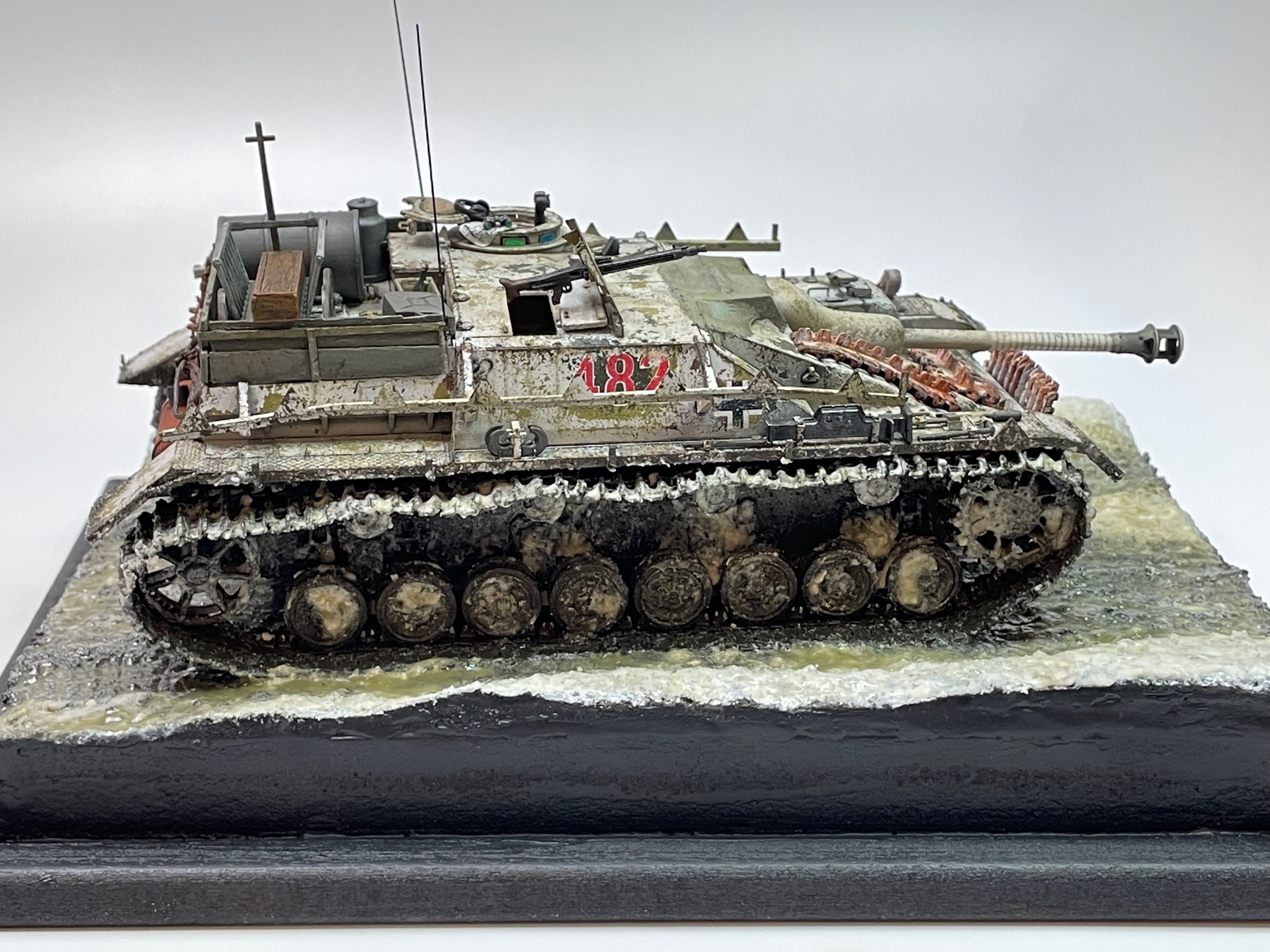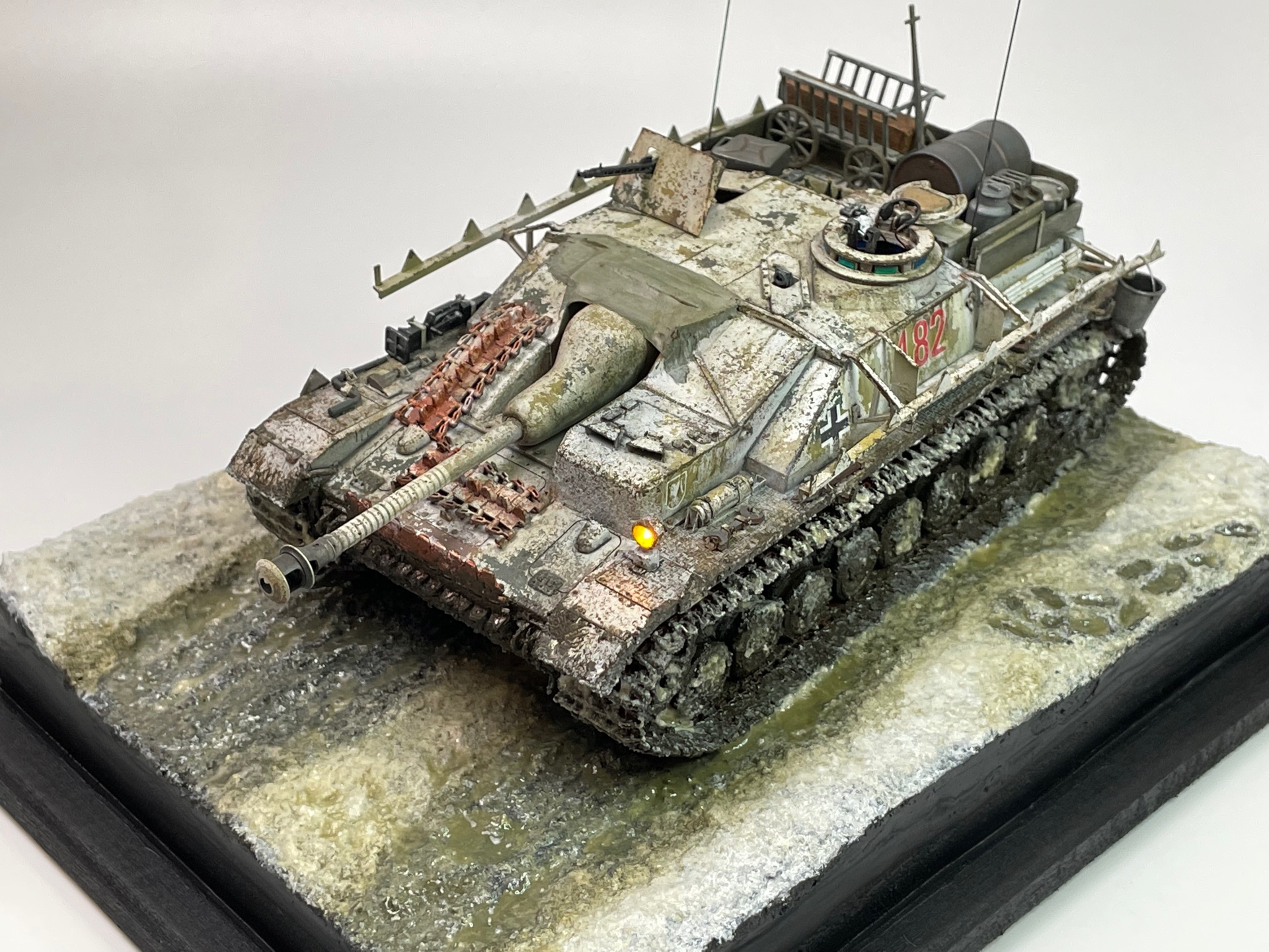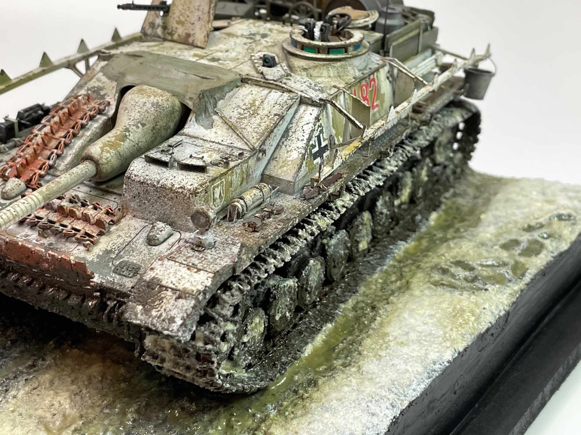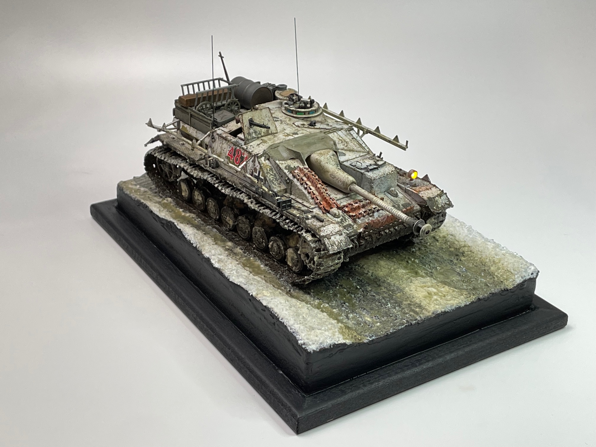 Своим результатом по доработке и сборке модели доволен. По задумке данная самоходка принадлежит 279-ой бригаде штурмовых орудий (Stg.Brig.279). Время действия - конец марта 1945 года, где-то на пути к Инстербургу и Кенигсбергу, где после, в апреле 1945 года, данная часть была уничтожена, а ее остатки сдались в мае советским войскам.