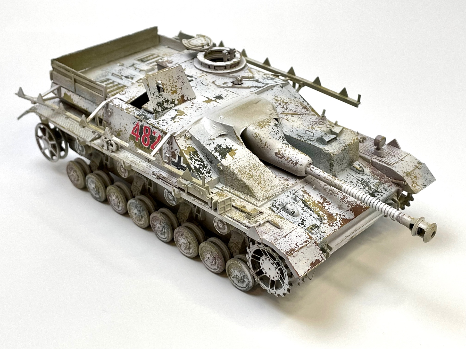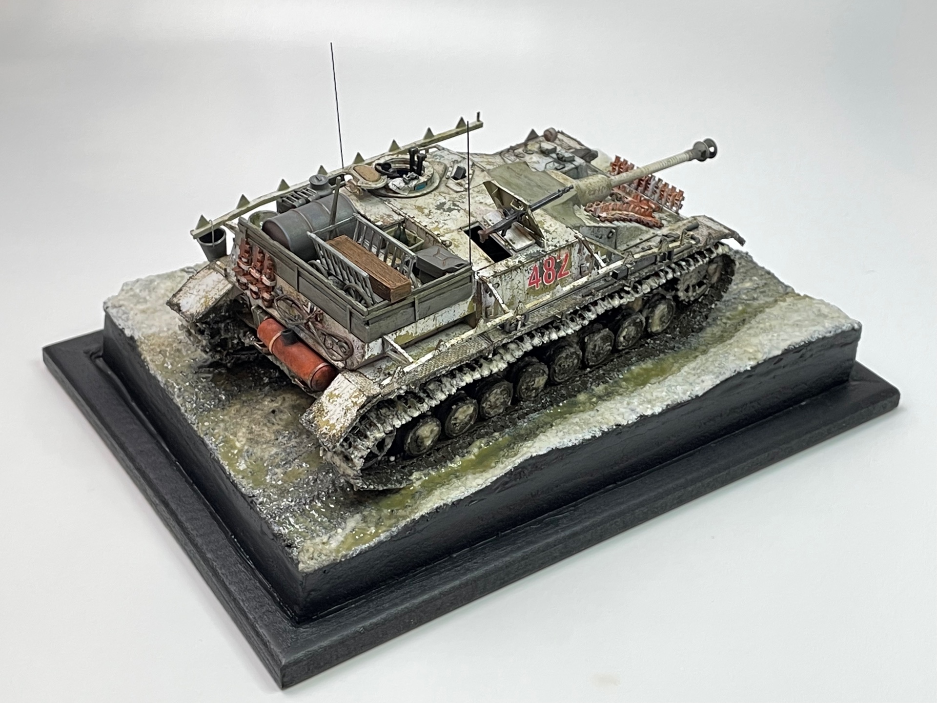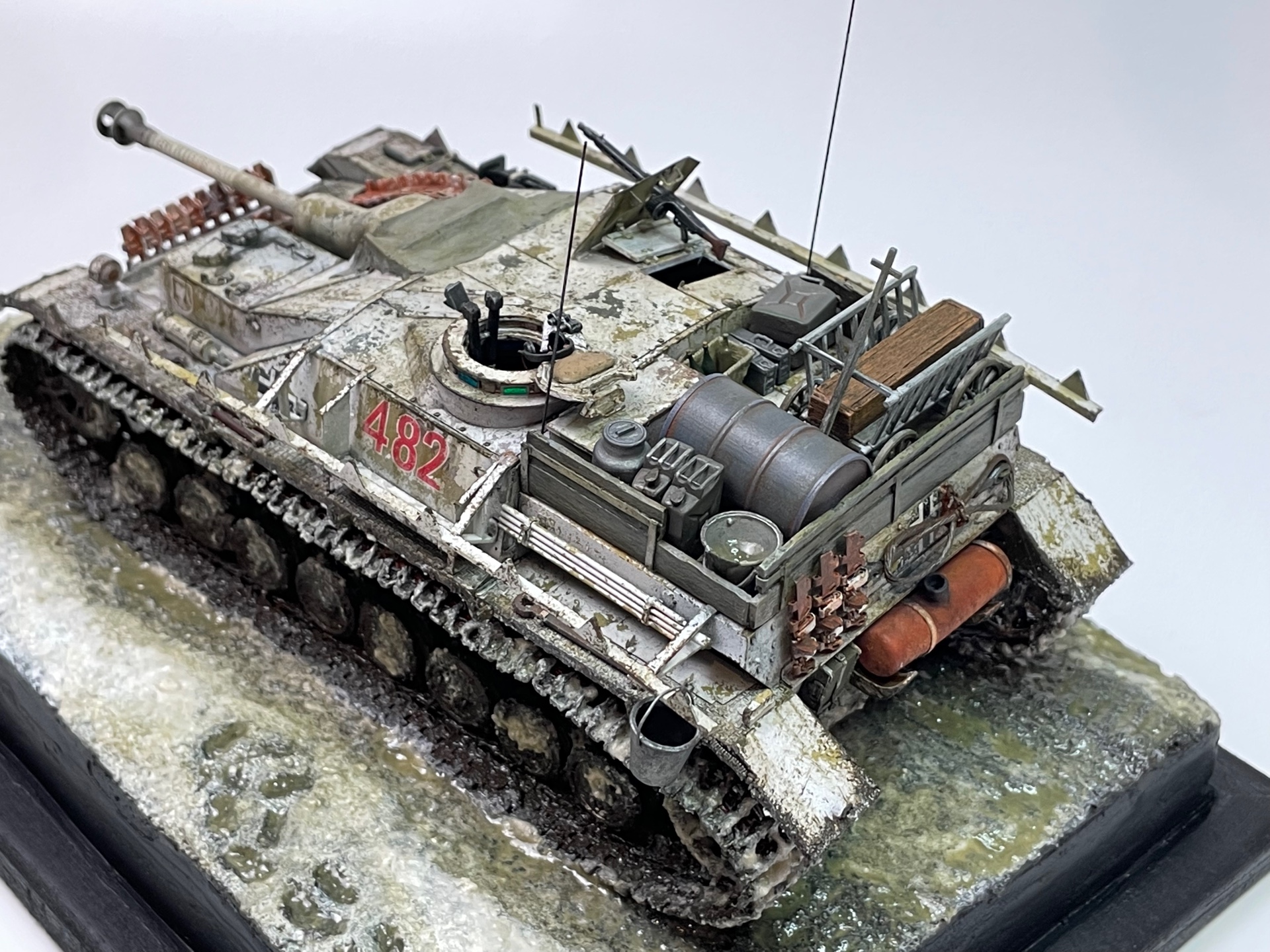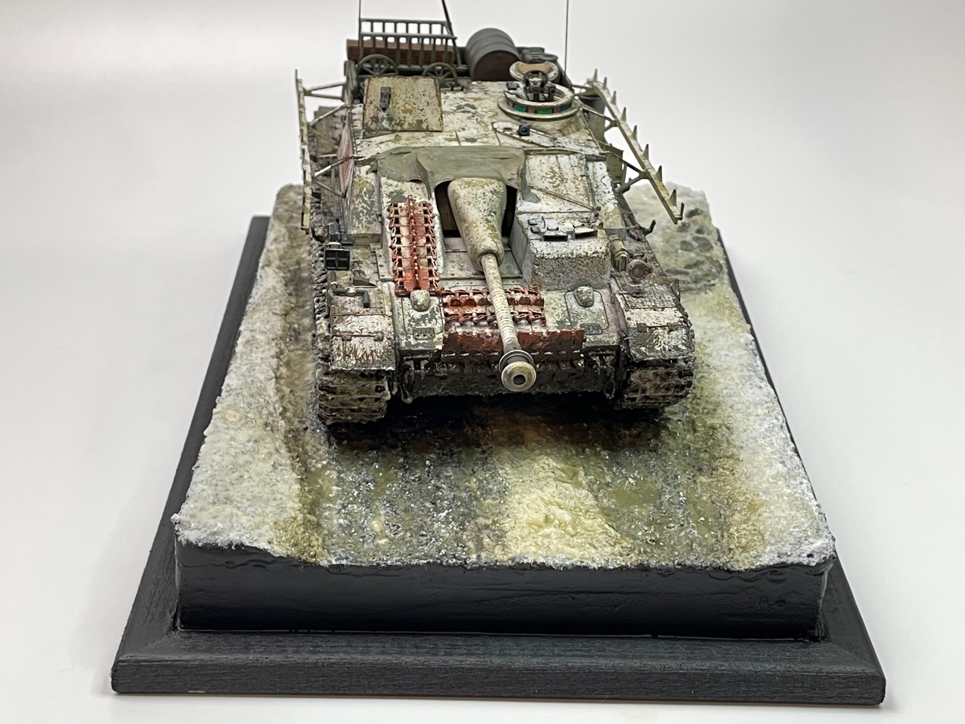 Своим результатом по доработке и сборке модели доволен. По задумке данная самоходка принадлежит 279-ой бригаде штурмовых орудий (Stg.Brig.279). Время действия - конец марта 1945 года, где-то на пути к Инстербургу и Кенигсбергу, где после, в апреле 1945 года, данная часть была уничтожена, а ее остатки сдались в мае советским войскам.