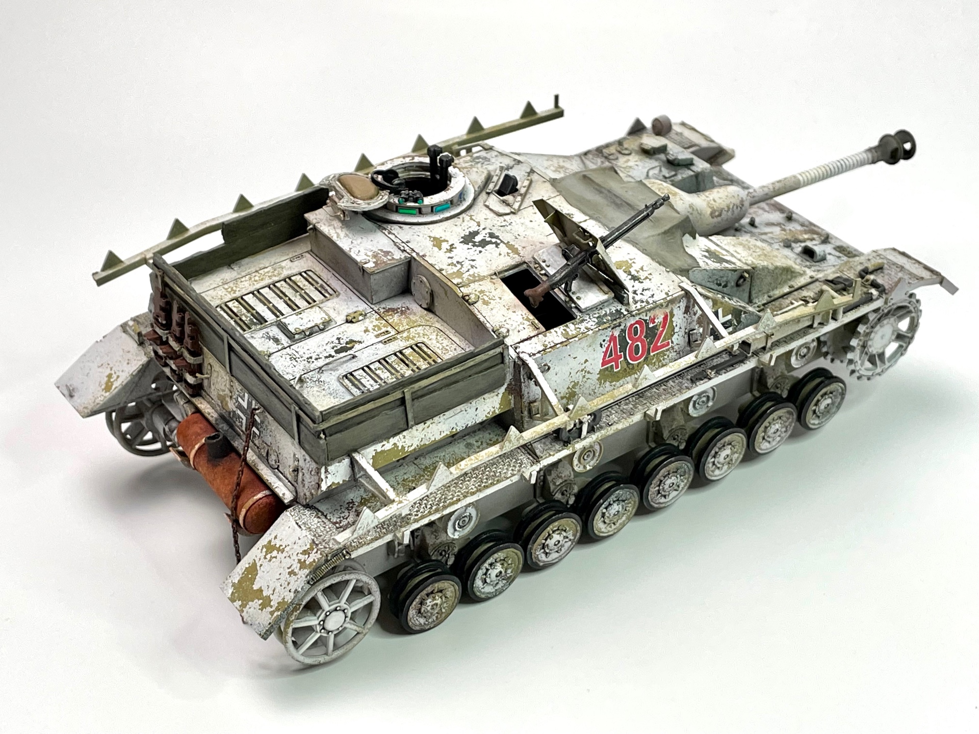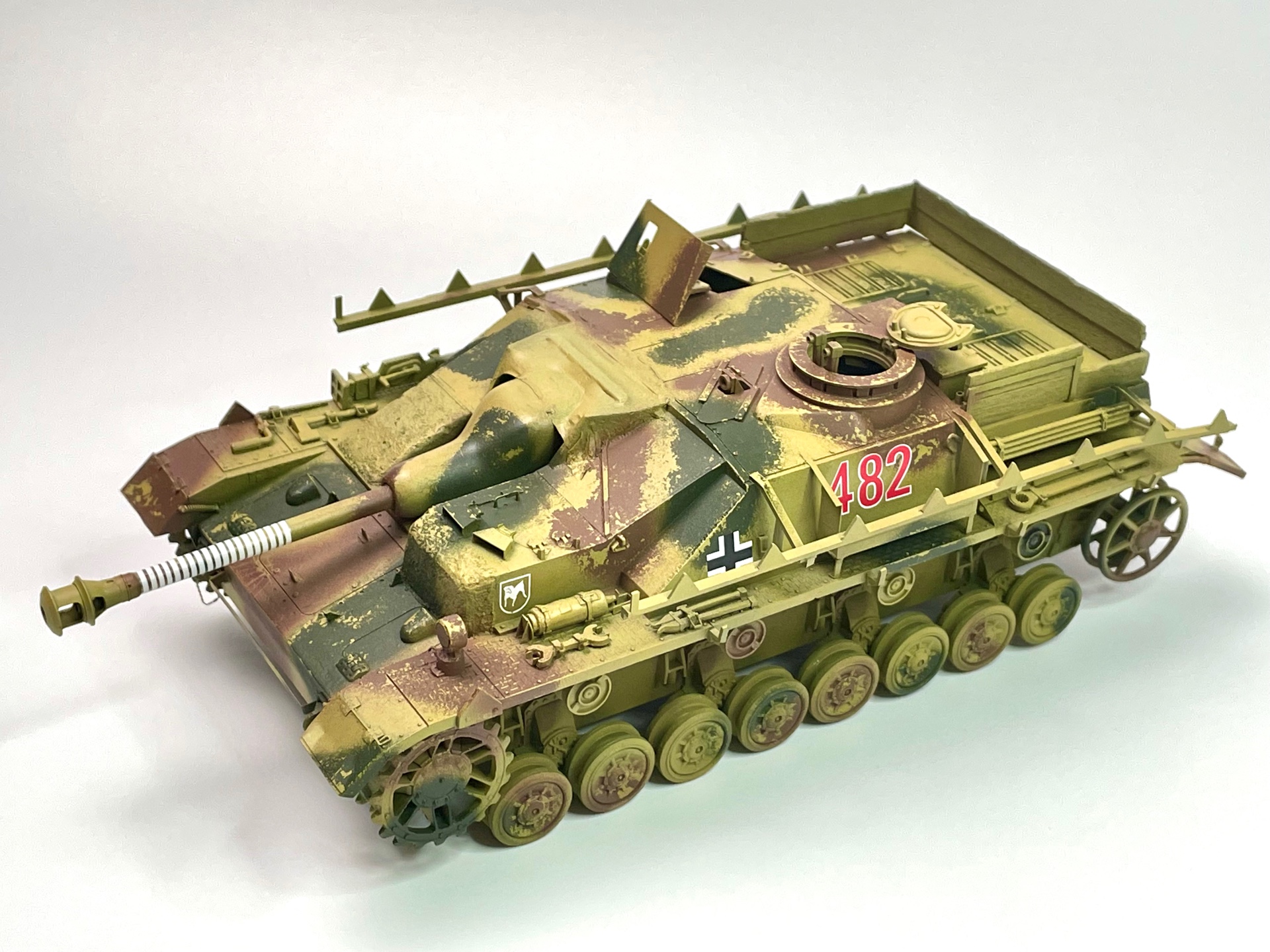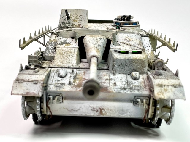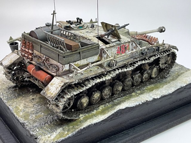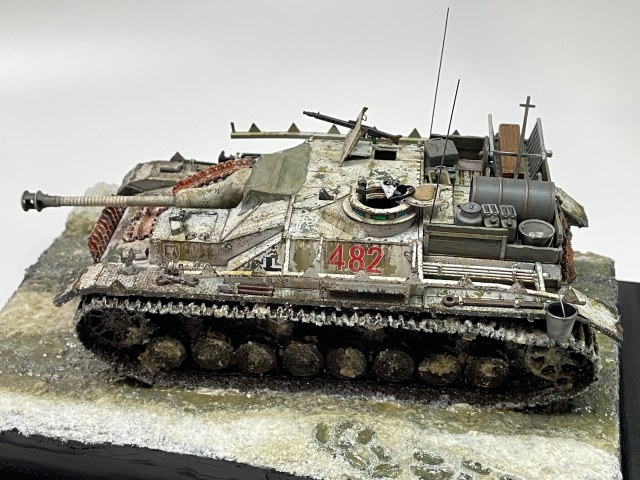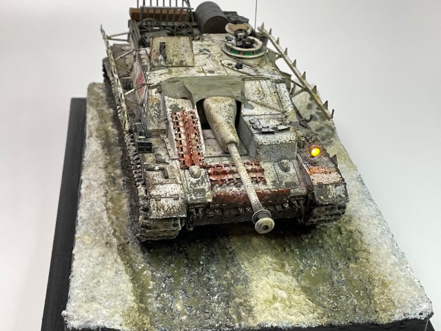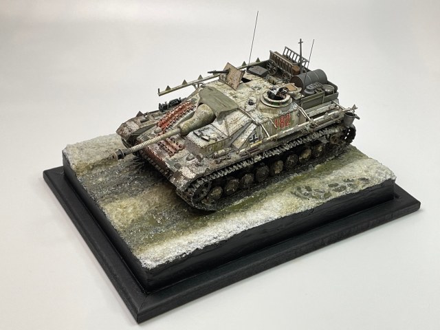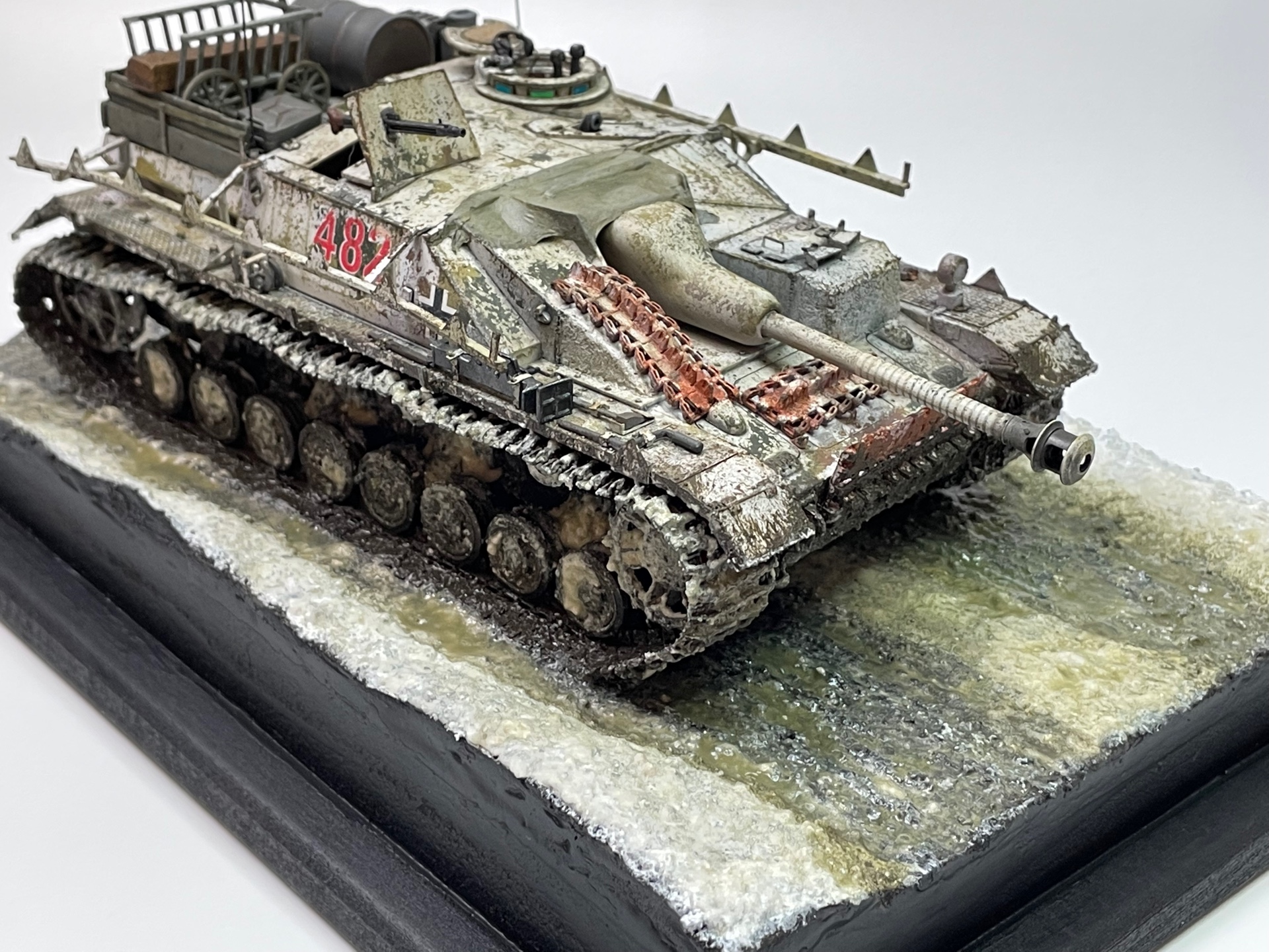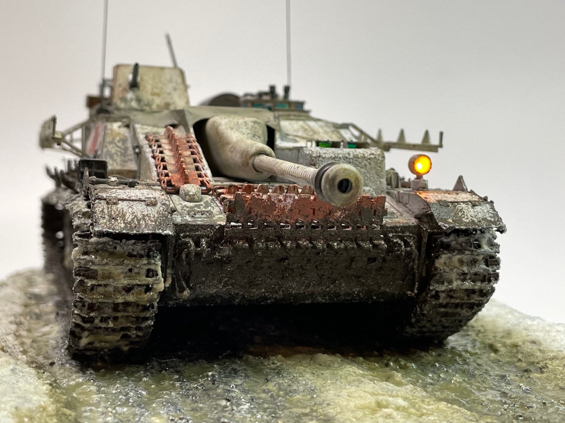 Своим результатом по доработке и сборке модели доволен. По задумке данная самоходка принадлежит 279-ой бригаде штурмовых орудий (Stg.Brig.279). Время действия - конец марта 1945 года, где-то на пути к Инстербургу и Кенигсбергу, где после, в апреле 1945 года, данная часть была уничтожена, а ее остатки сдались в мае советским войскам.