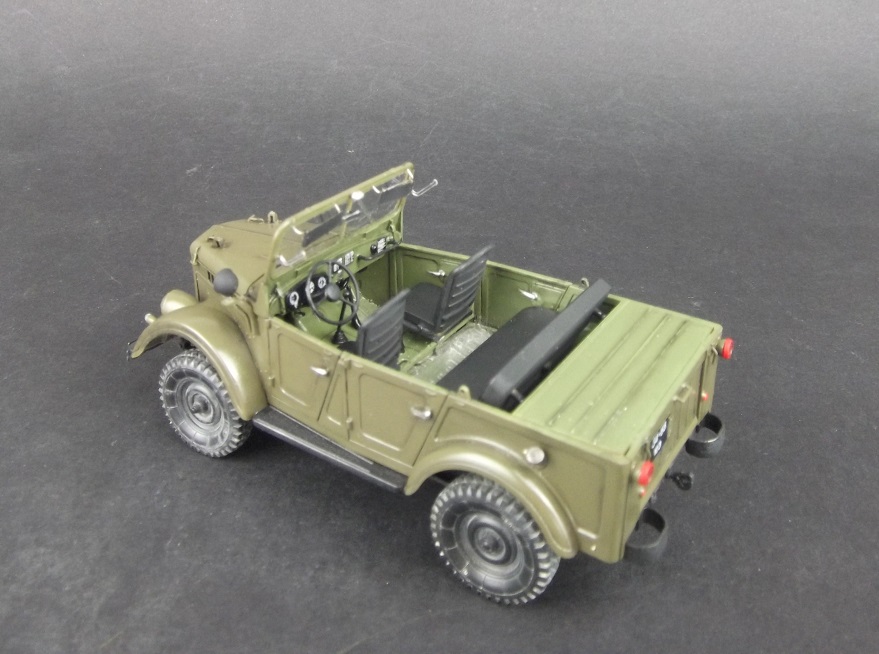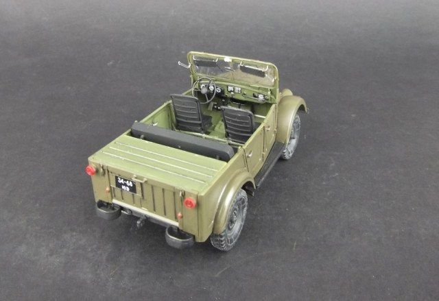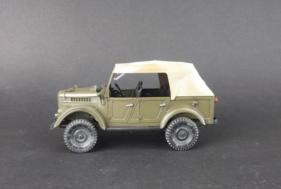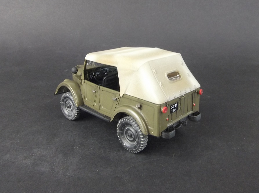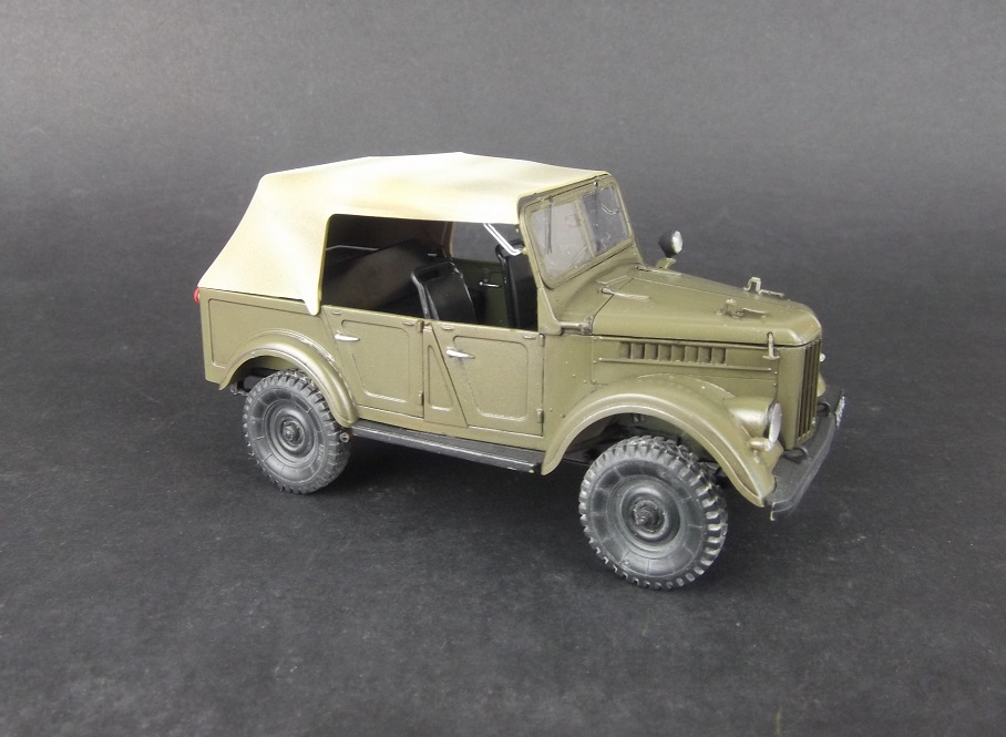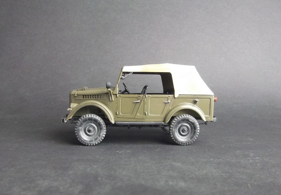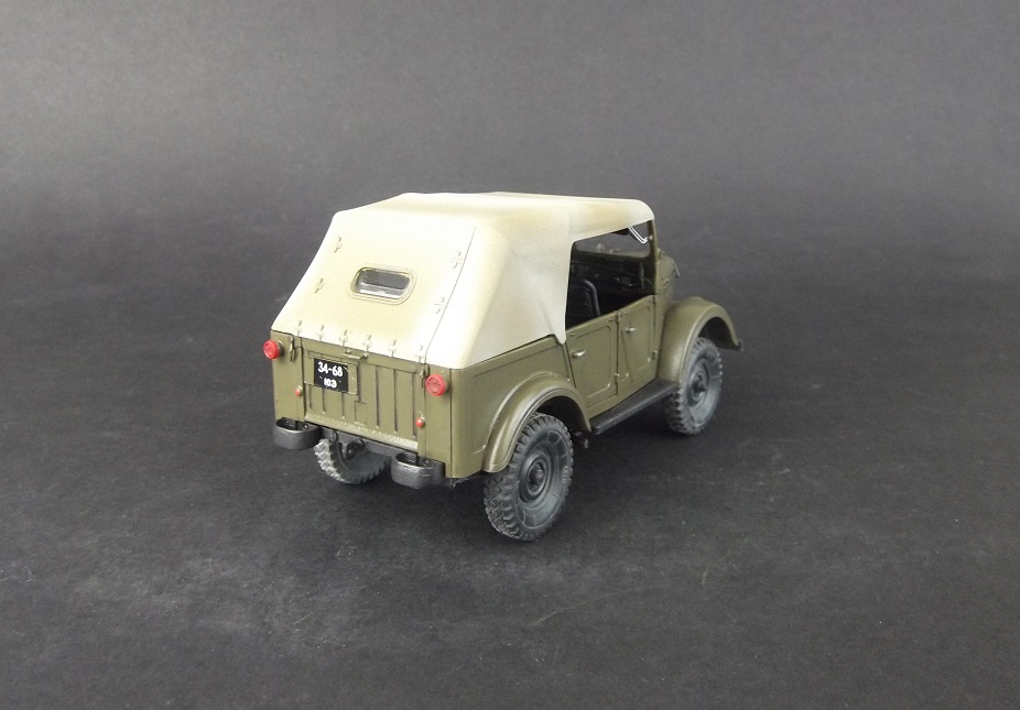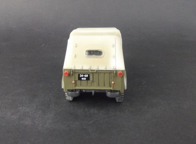 Добротная работа. Соглашусь с коллегами, тент желательно изготовить самостоятельно, модель от этого выиграет в смотрибельности в разы! Не понятно с задним откидным бортом, он имеет другую форму(такого не встречал, хотя сам владею ГАЗ - 69). Так же на нем имеются маленькие резиновые упоры по краям, у Вас они покрашены почему - то красным цветом. Цвет салона и кузова имеют разный оттенок, хотя и такое встречалось при перекраске автомобиля. Задние фонари из набора, судя по фото не "айс". На передних крыльях видна шагрень от покраски, но и такое встречалось в жизни. Некоторые умельцы красили авто даже кистью и ездили)). Можно было бы "кинуть" эл. проводку к ламп-фаре, я её не заметил на фото. А в общем работа понравилась, автомобиль очень похож на себя.