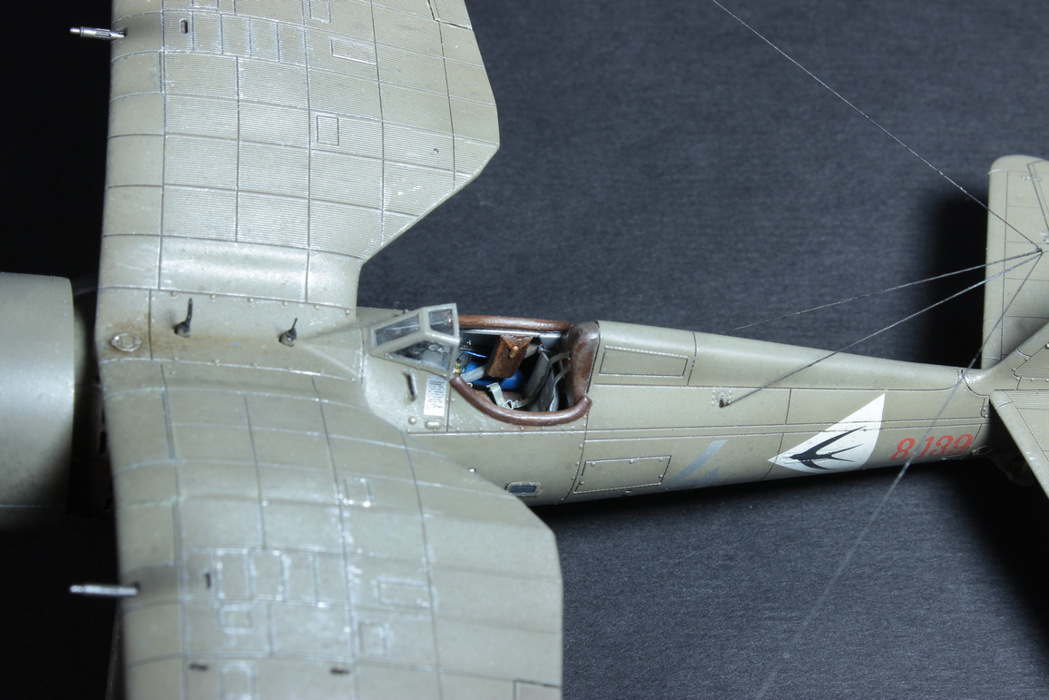 Красил фюз, крыло, подкосы, стойки шасси и капот по отдельности. -После примерки начерно убедился. что никакой подгонки не требуется. Тем более, что в районе характерного сопряжения фюза и крыла нормально покрасить весьма трудно, если сразу склеить все в один кусок.