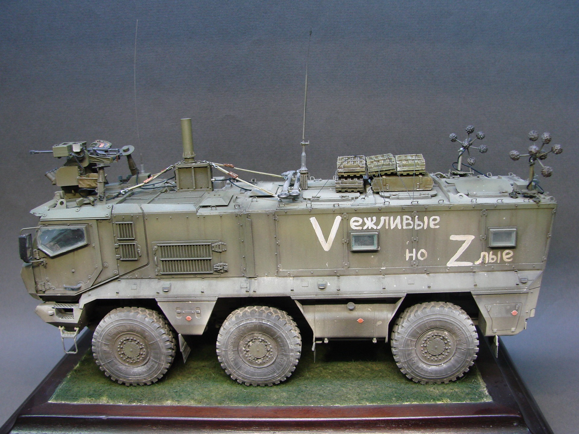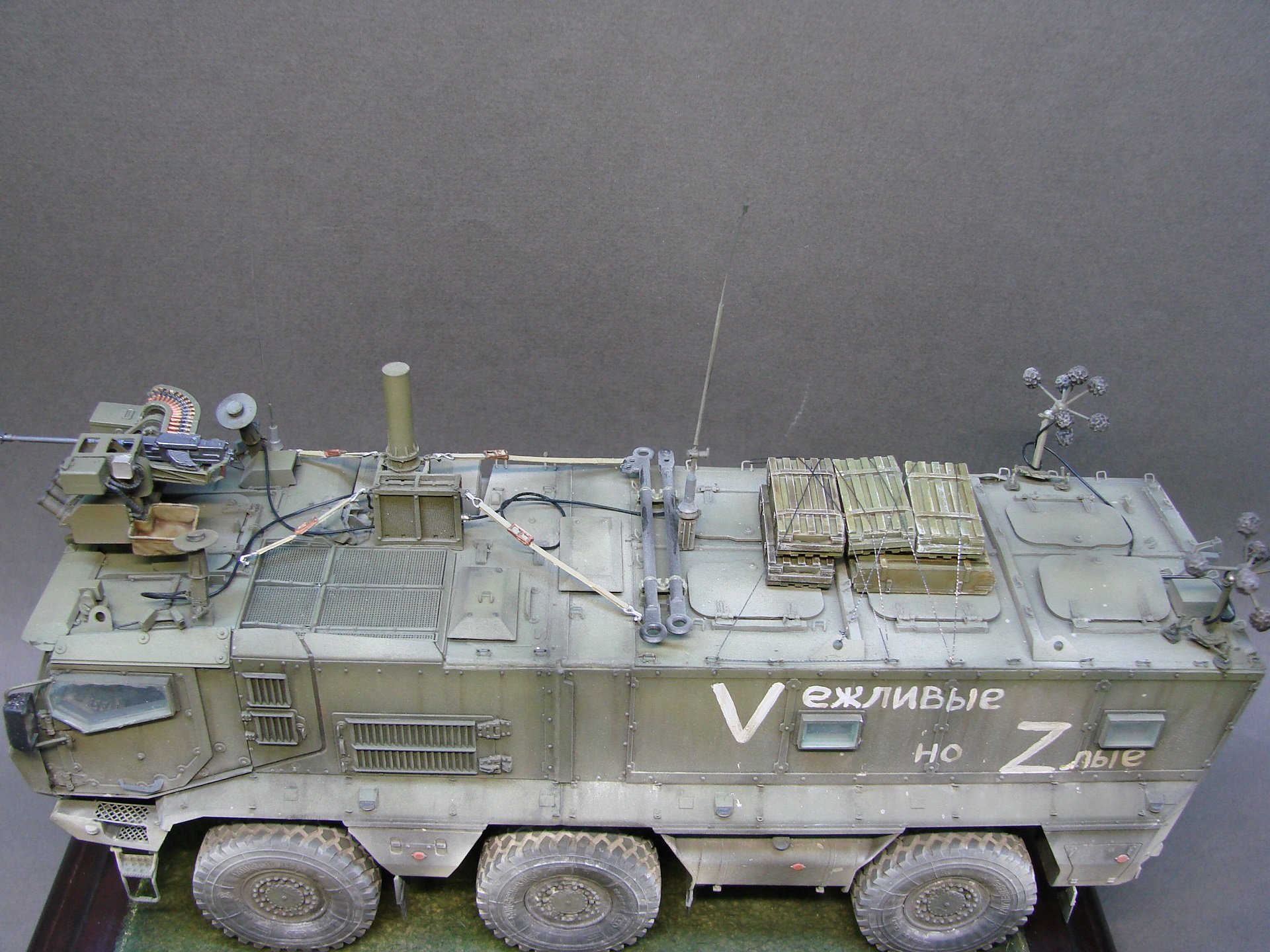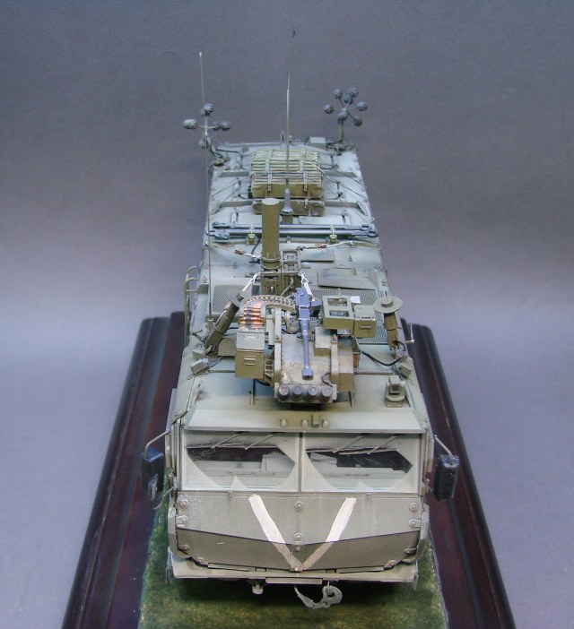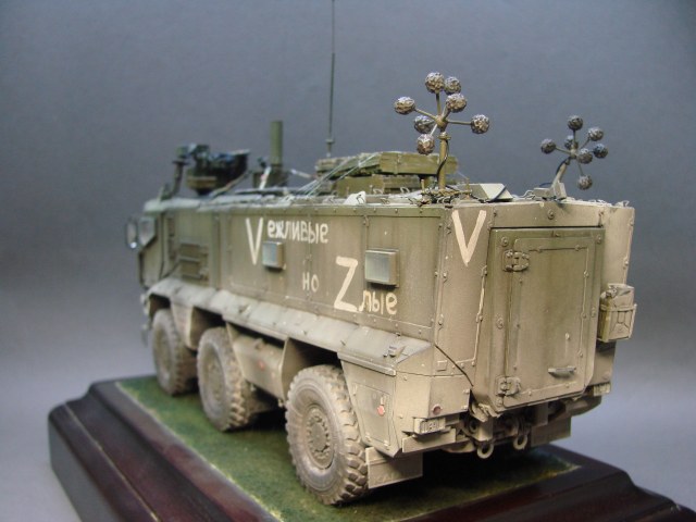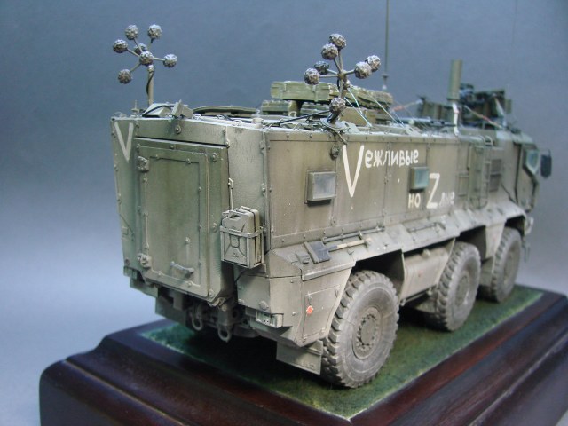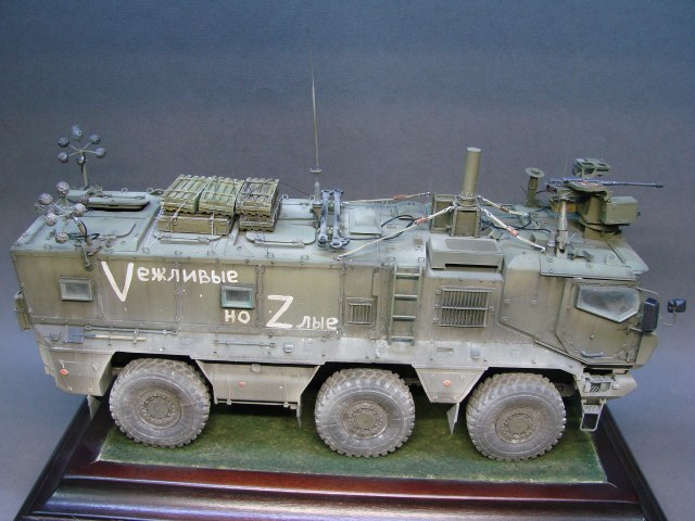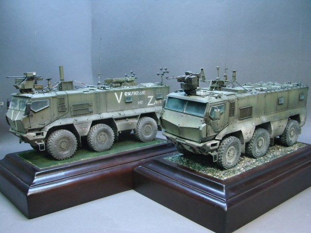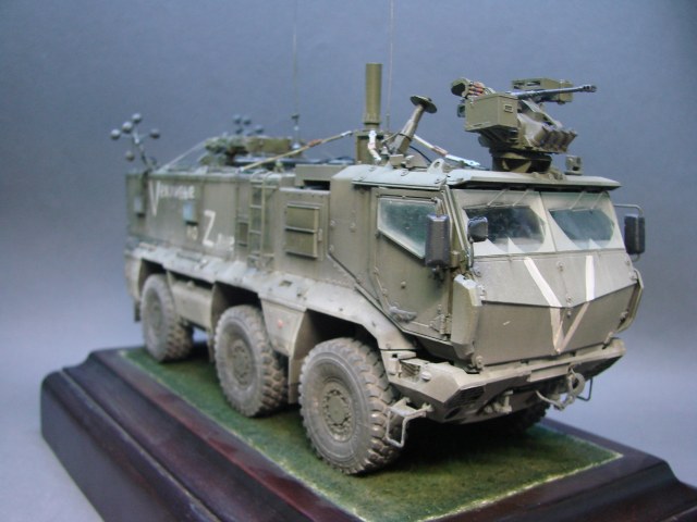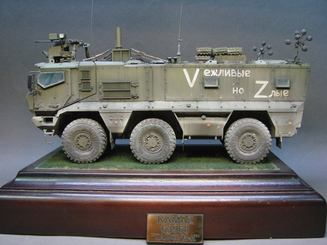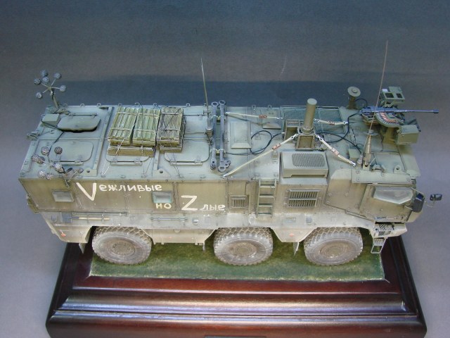 Доброго времени! Снова поддерживаем наших Бойцов! Завершил модель Тайфуна от Звезды, с кучей дополнений,Такомовский ТАйфун рядом не стоит со Звездовской моделью,детализация у звезды на высоте,а микродизайн это дело подчеркивает еще больше) травления от МД брал несколько комплектов а именно три,два на Звезду и один на Таком,так как только на Таком делались рабочие петли люков и дверей,все таки есть планы поставить этого Тайфуна на будущую диорамку с фигурами,для этого необходимы будут люки и двери подвижные. Колеса от миниарма(более позднего их выпуска) + от этой же конторы поставил глушилку, деки от квинта, ну и без LR не обошлось,установил пару датчиков антиснайпер"сова" стрелковый модуль Арбалет-23мм.комплекты АКа, от фирмы "ТАНК" использовал ящики под цинки, ящики на крыши под БП 23мм были от мажермоделс,антенный ввод от зебвал, вроде все. Образ машины взял вымышленным,так как с таким обвесом машины замечены не были(имею ввиду модель Арбалет-23мм)