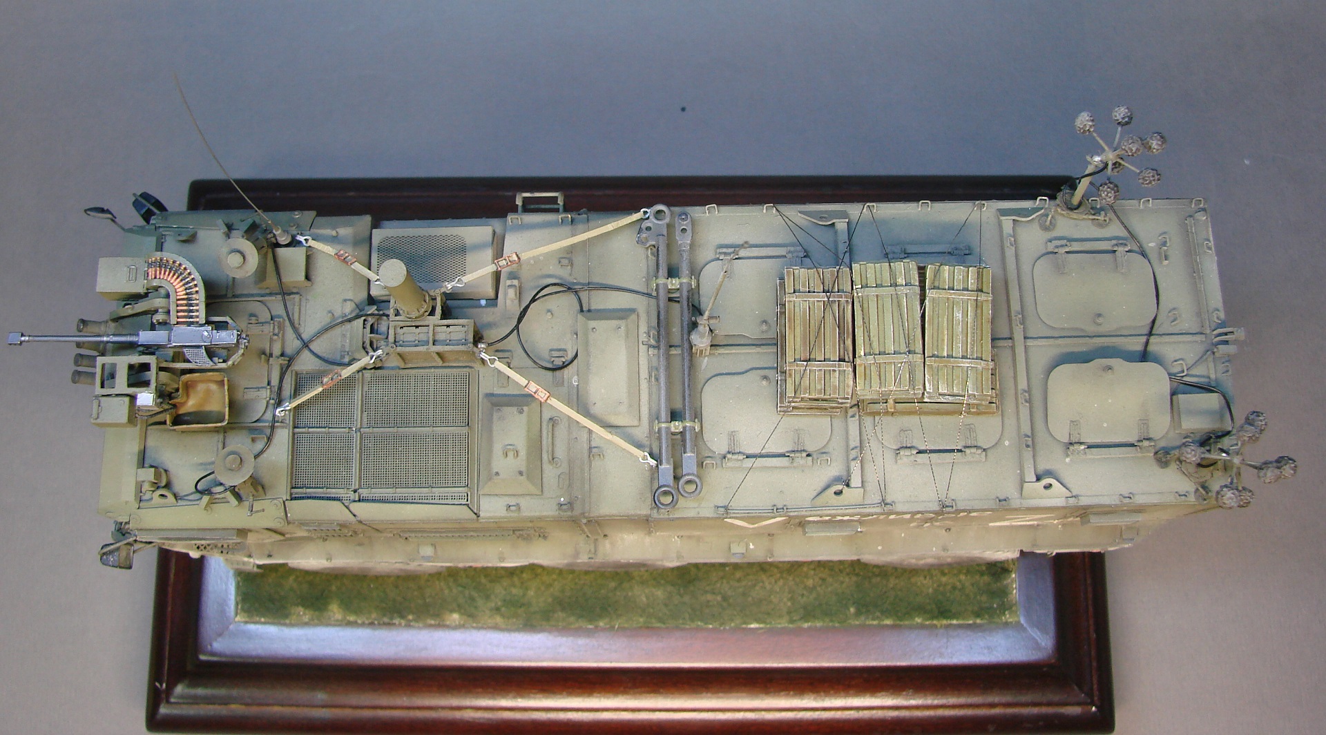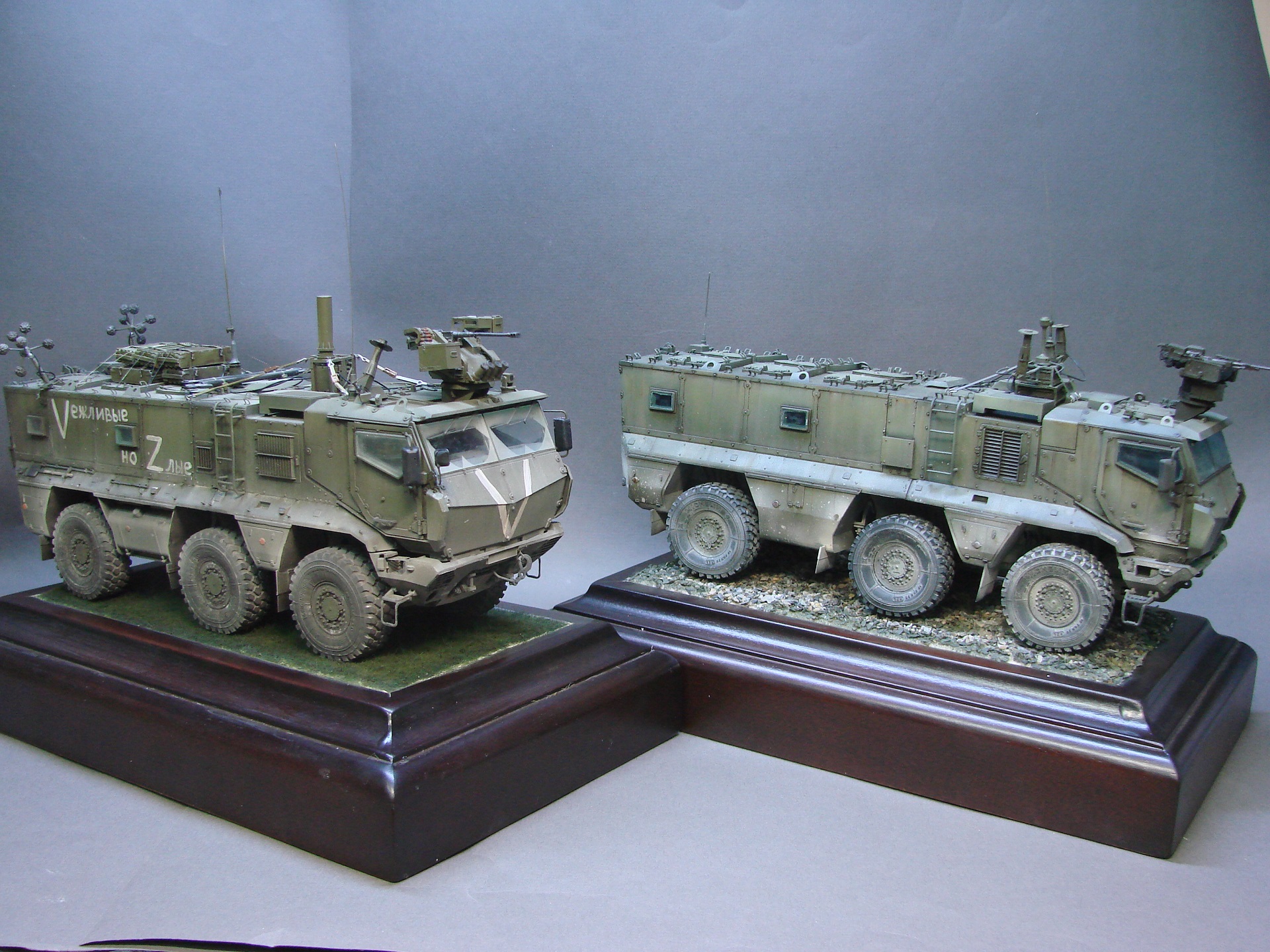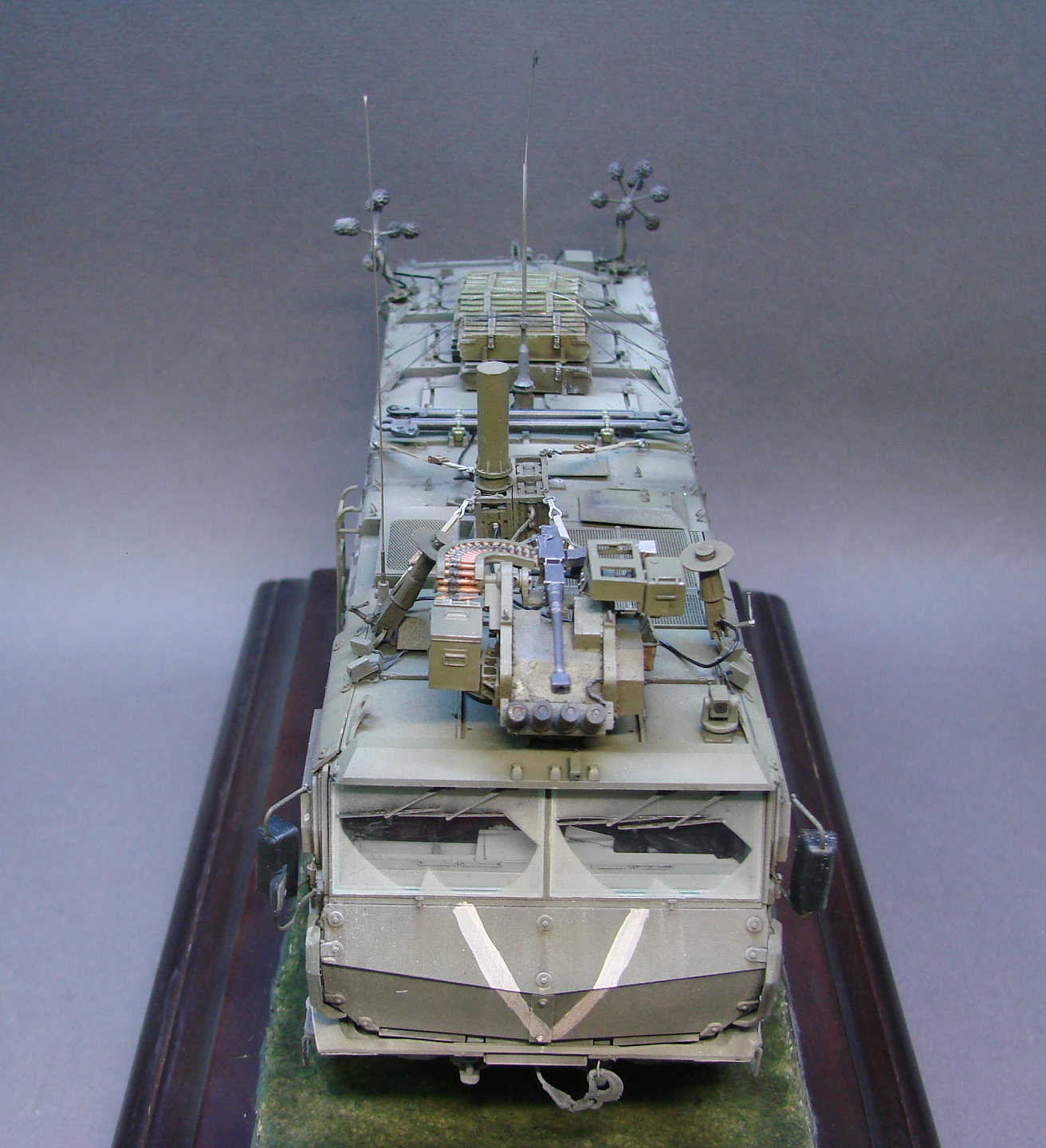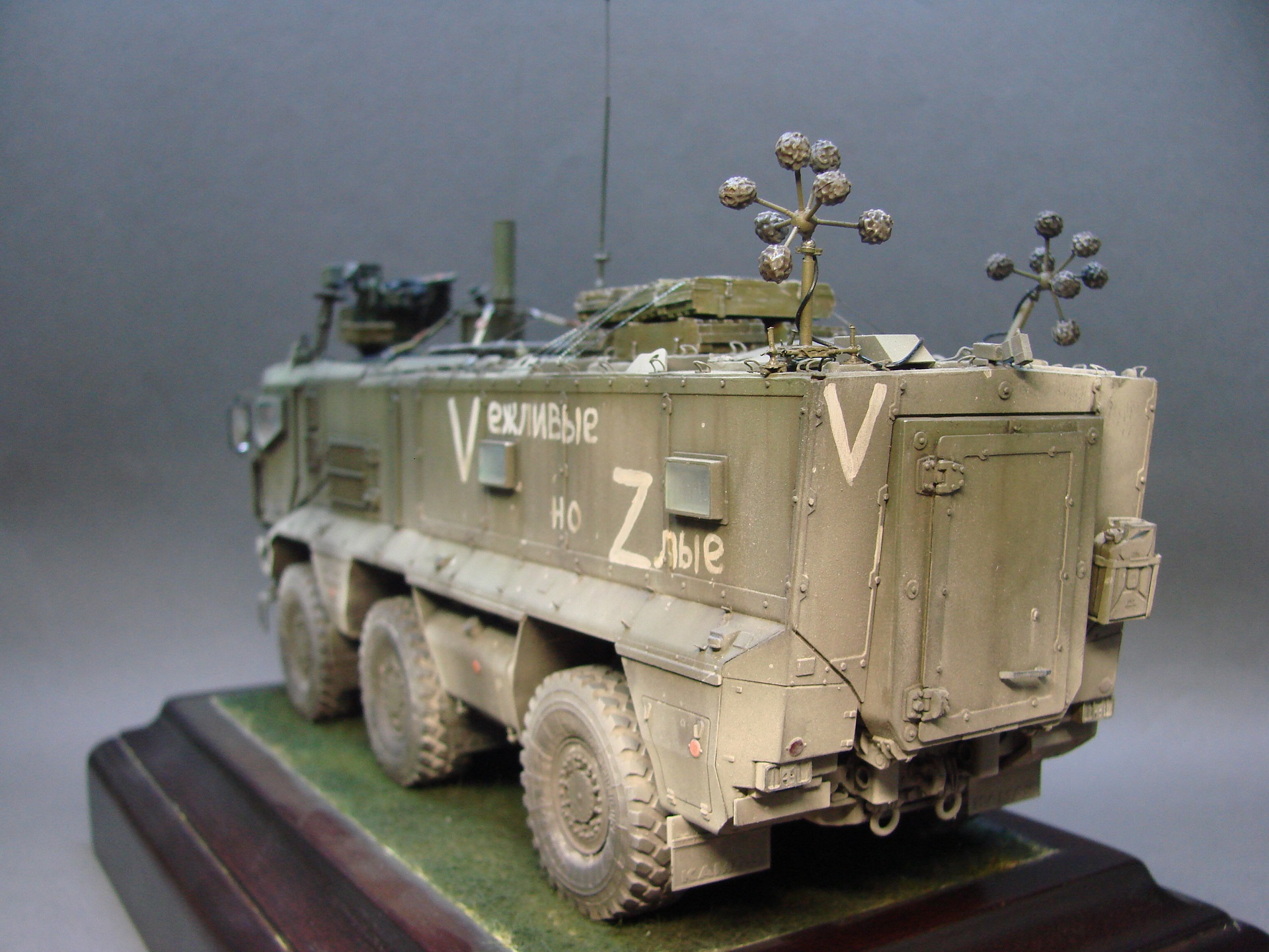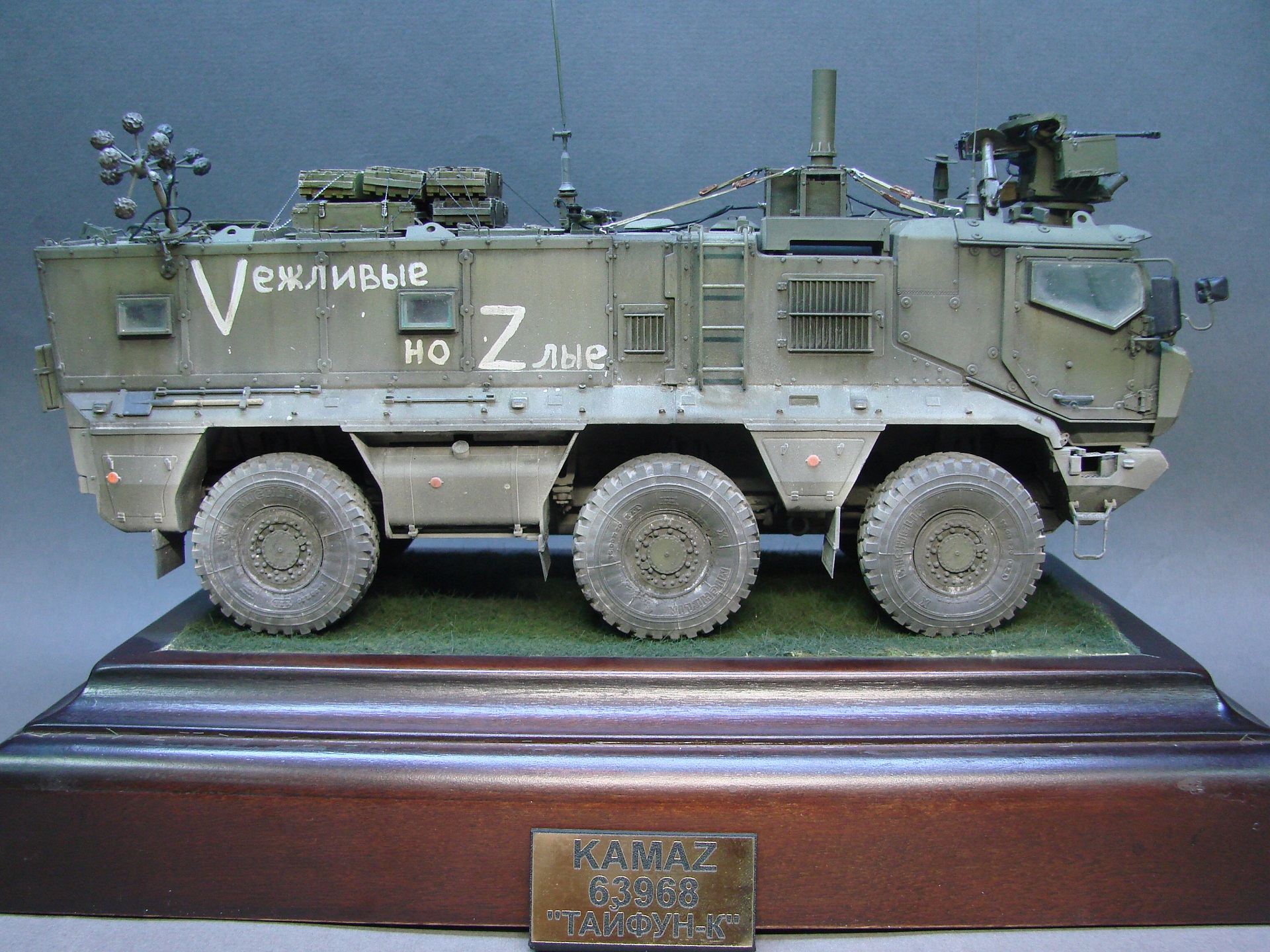 Доброго времени! Снова поддерживаем наших Бойцов! Завершил модель Тайфуна от Звезды, с кучей дополнений,Такомовский ТАйфун рядом не стоит со Звездовской моделью,детализация у звезды на высоте,а микродизайн это дело подчеркивает еще больше) травления от МД брал несколько комплектов а именно три,два на Звезду и один на Таком,так как только на Таком делались рабочие петли люков и дверей,все таки есть планы поставить этого Тайфуна на будущую диорамку с фигурами,для этого необходимы будут люки и двери подвижные. Колеса от миниарма(более позднего их выпуска) + от этой же конторы поставил глушилку, деки от квинта, ну и без LR не обошлось,установил пару датчиков антиснайпер"сова" стрелковый модуль Арбалет-23мм.комплекты АКа, от фирмы "ТАНК" использовал ящики под цинки, ящики на крыши под БП 23мм были от мажермоделс,антенный ввод от зебвал, вроде все. Образ машины взял вымышленным,так как с таким обвесом машины замечены не были(имею ввиду модель Арбалет-23мм)