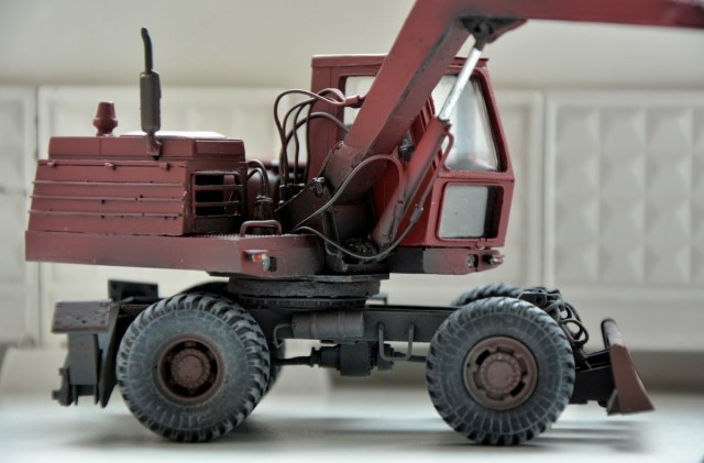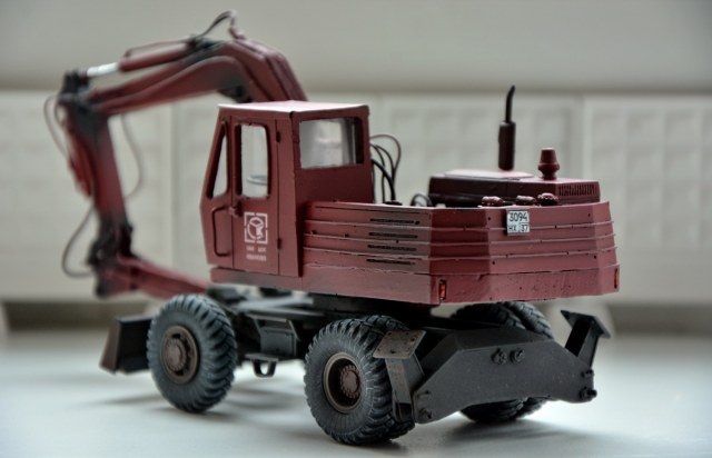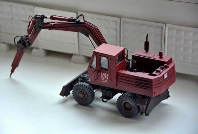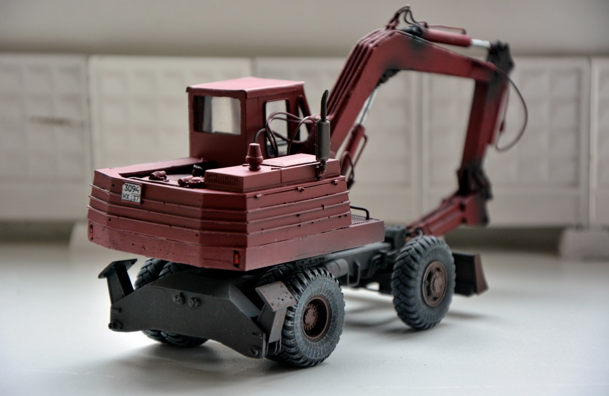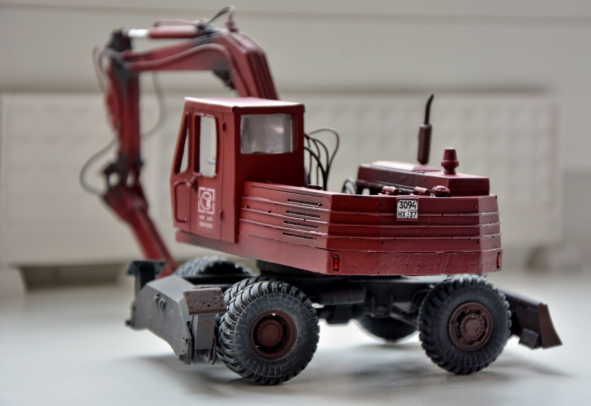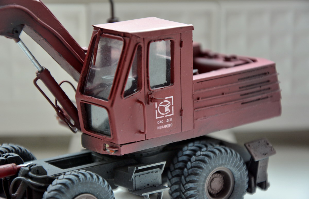 Кит сделан из смолы, многие детали сделаны из подручных материалов: гидроцилиндр из пластиковых трубочек, штоки из гвоздей, рукава высокого давления из проволоки. На экскаваторе стоит резина Я-307, установлены фары с поворотники и стопсигнаоами, госномер как на оригинале. Покраска и следы эксплуатации: Sasha Partizan