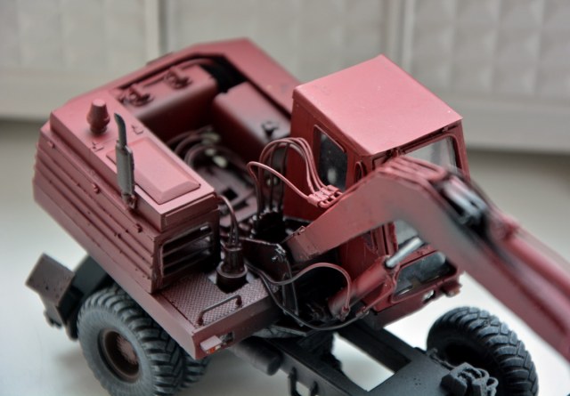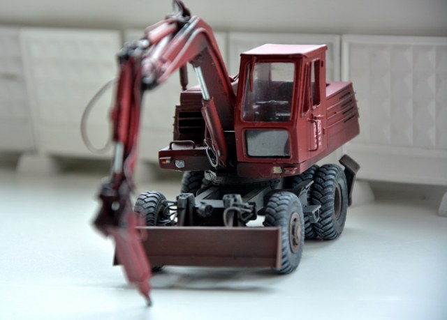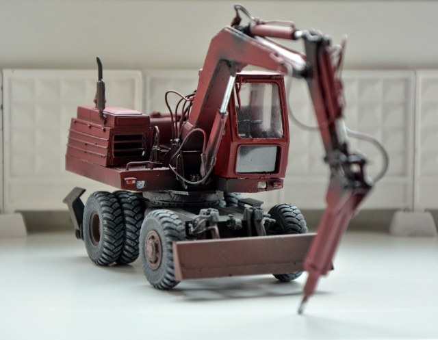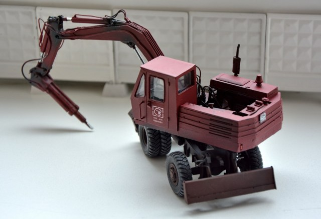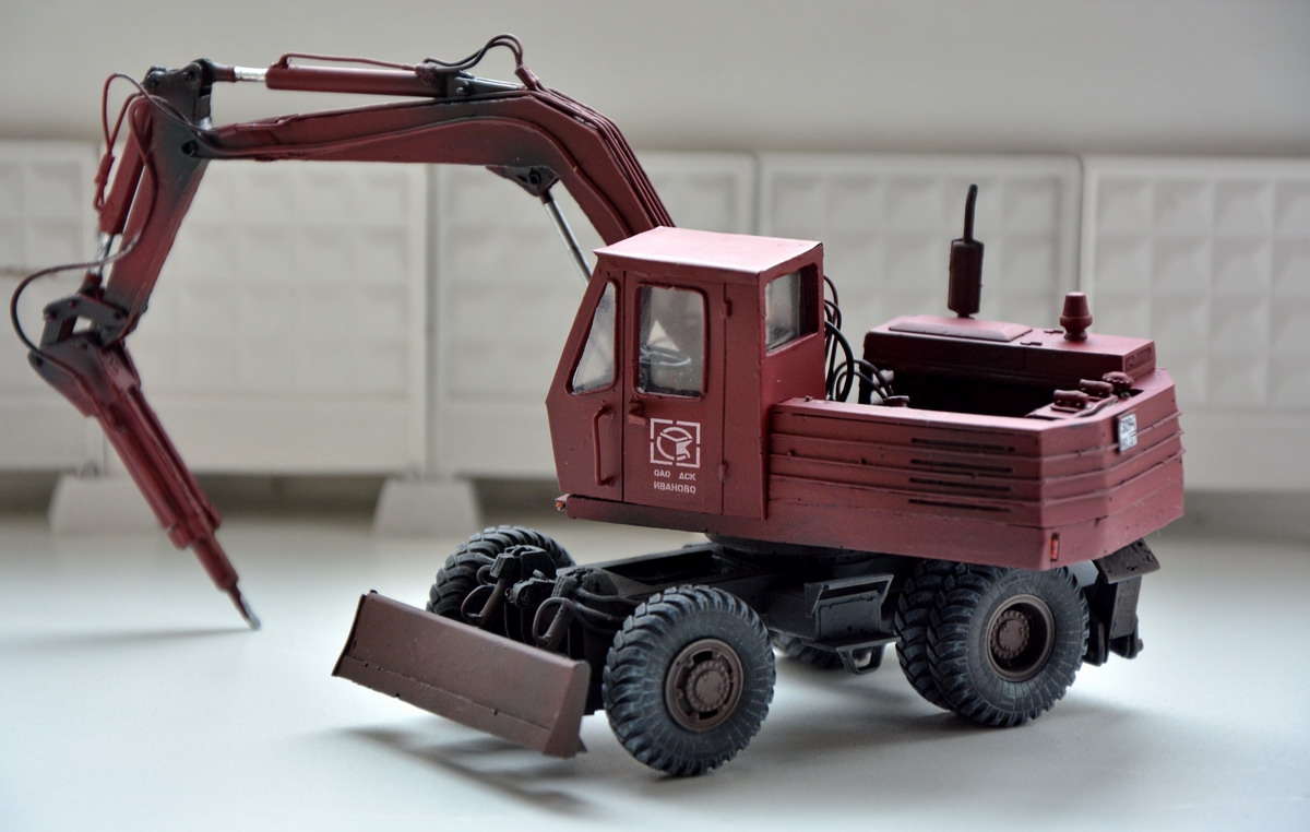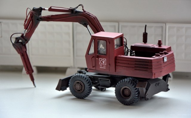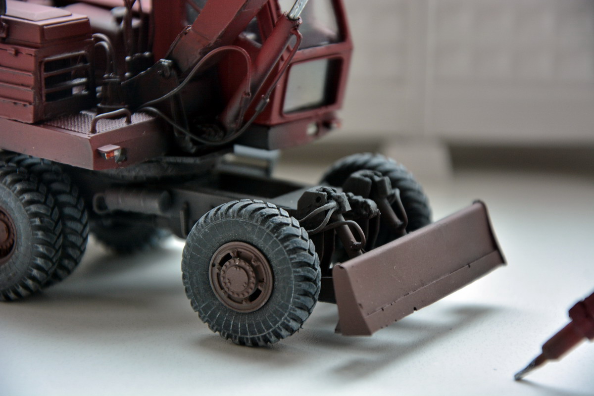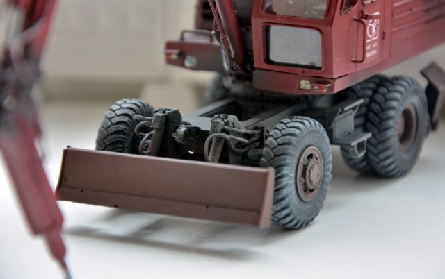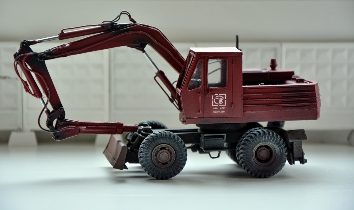 Кит сделан из смолы, многие детали сделаны из подручных материалов: гидроцилиндр из пластиковых трубочек, штоки из гвоздей, рукава высокого давления из проволоки. На экскаваторе стоит резина Я-307, установлены фары с поворотники и стопсигнаоами, госномер как на оригинале. Покраска и следы эксплуатации: Sasha Partizan