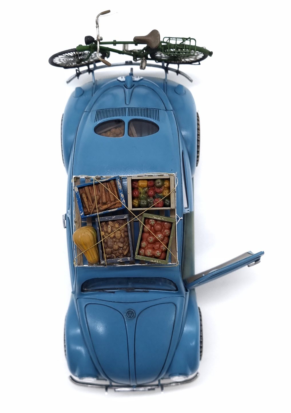 Да, местами заметно, что поверхность не идеальна /как шероховатость какая-то под лаком. Но мне понравилась работа. Веселый такой жук получился в синем. Интересная идея с багажником для велика и на крыше с овощами! Но скажу как водитель, пользующийся велобагажником на фаркопе, данной конструкции очень не хватает стяжек на колеса и веревки для фиксации велика к машине - за седушку и руль к багажнику на крыше. Иначе после пары хороших ухабин улетит.