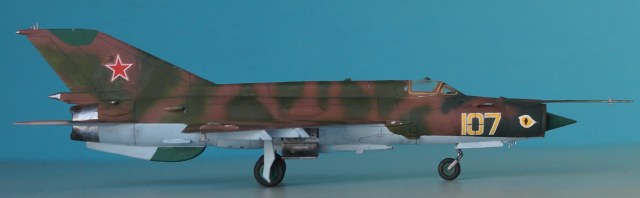 На 3-ем десятке моделей МиГ-21 уж пора правильно опоры шасси начать красить)) Передняя нога целиком (и сама стойка, и вилка, за искл. штока разумеется) серая - как и основные. И ниши со створками основных ног на камуфлированных машинах ни разу не серебристые. Кривая ориентация флюгарок ДУАС на штанге ПВД тоже, видимо, "фирменная" черта "авторского стиля" т.к. неизменно повторяется от модели к модели))