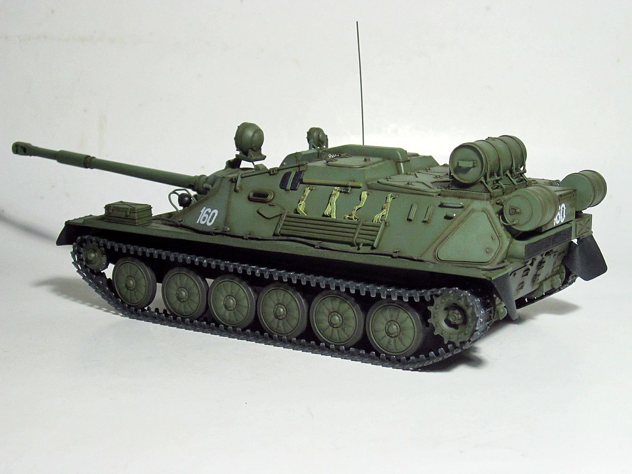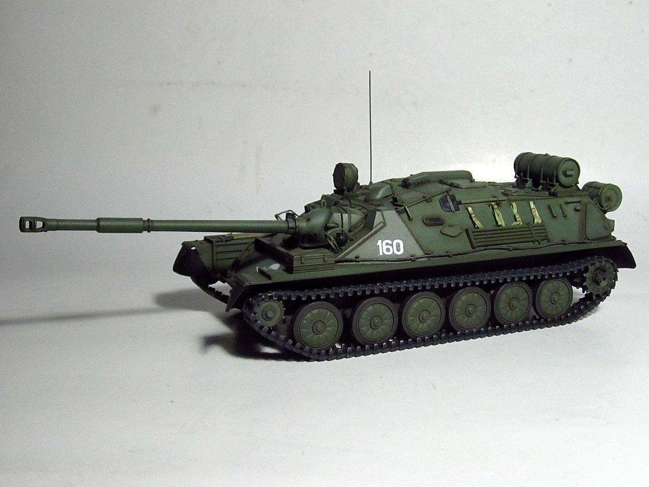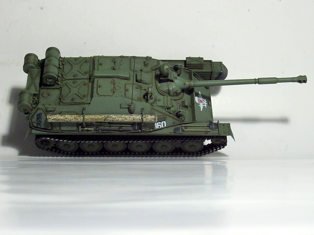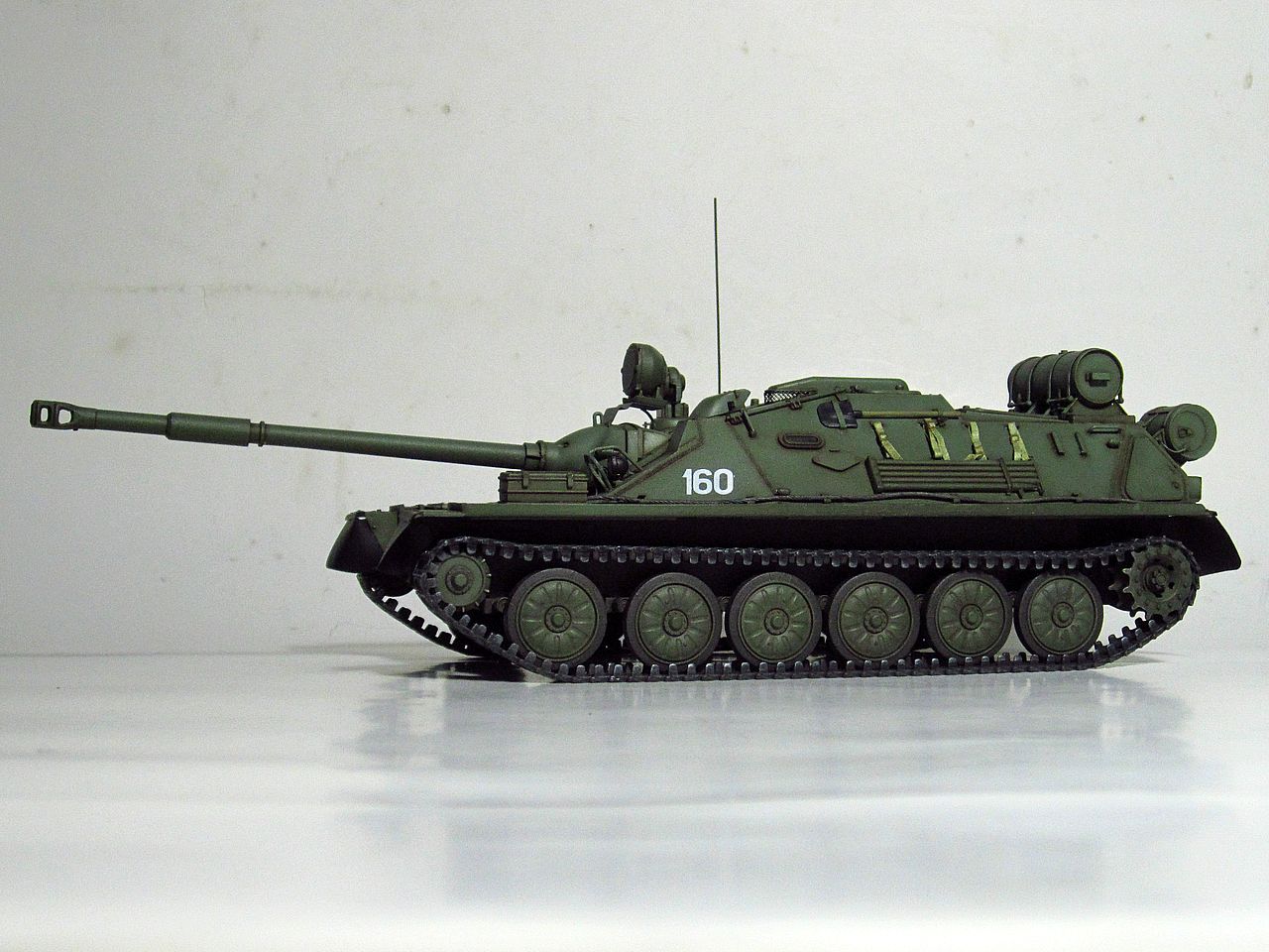Для искоробки получилось отлично. Дорабатывать и переделывать в этом наборе нужно очень много всего. Если интересно- могу перечислить. Из придиризмов- не видел ни одной фотографии, где на СУ-85 вешали бы дополнительный 90-литровый топливный бак от Т-34/85 (впрочем бак бы тоже заменить, на смолу от SPM или травло от Voyager или Микродизайн). Конкретно Трамп подсмотрел такой бак у одной из польских музейных АСУ-85. При чем кроштейны креплений там были сломаны и производители травла это воспроизвели))