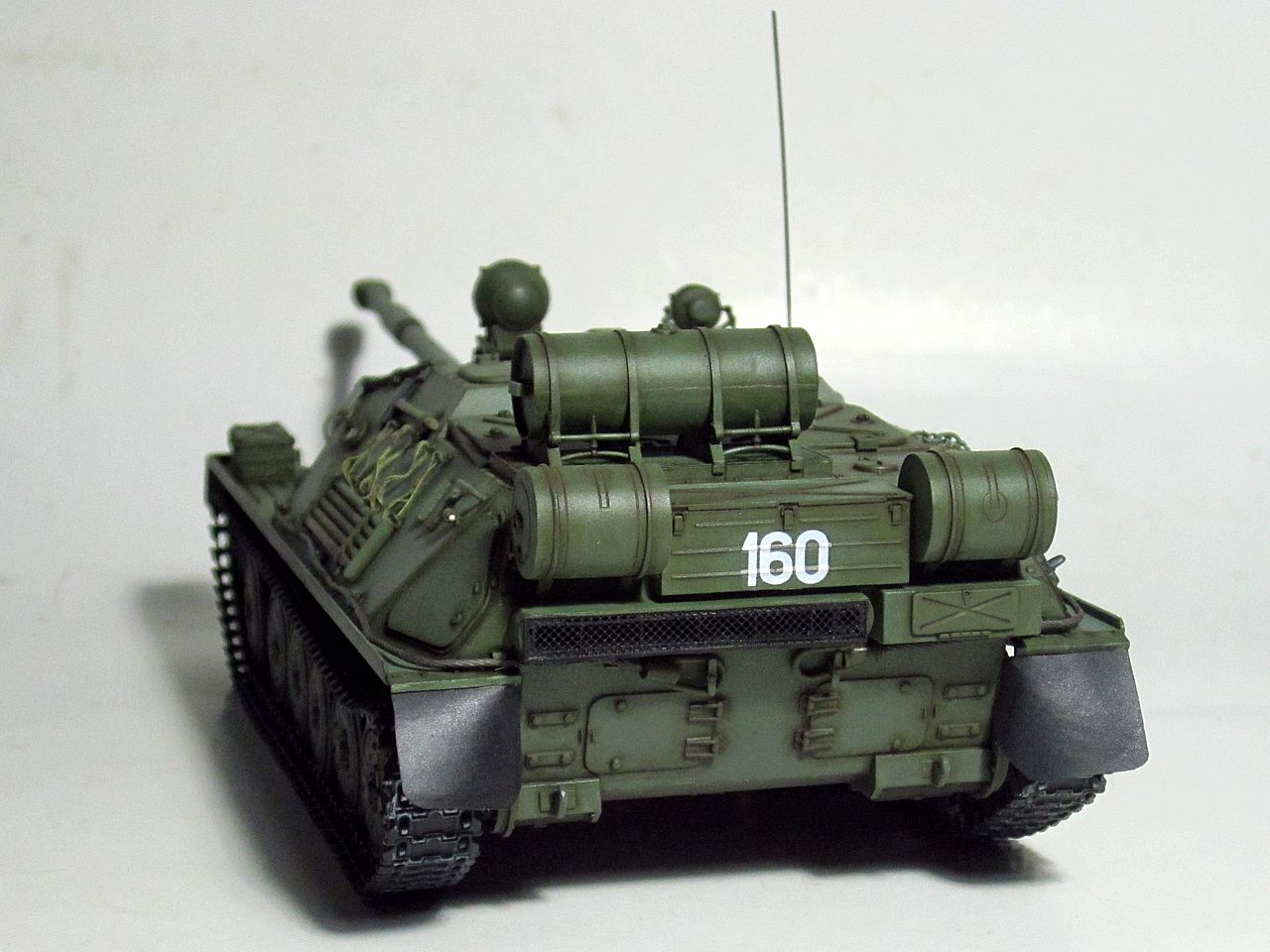 Там где позволяет качество, если внимательно присмотреться, то проглядываются характерные торцы с выштамповками, а также 2 заливные горловины, под брезентом. Это стандартные штатные 45-литровые бочки. Такие бочки до середины-конца 60-х (а где-то и дольше) применялись на ПТ-76 и БТР-50, потом ушли на 95-литровые от Т-54/55. 45ки, собственно говоря, и перекочевали на АСУ-85, т.к. база пэтэшная. Штатно крепились на крыше корпуса, над воздухозаборником. По факту, в 99,99% случаев их также возили вместо БДШ-5, на корме.