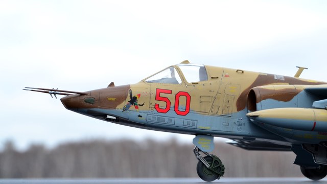 Вот думал не буду ничего комментировать , промолчу , дабы не распалять споры . Но все же пару моментов озвучу , все таки 48 масштаб не 72 , и при мастерстве автора допущены мелкие косячки , не требующие покупки афтермаркета , а именно : бано все таки лучше красить лаком (думаю он у тебя есть) , стекатели сделать все равно надо было ( в 72 это можно простить , в 48 - очевидная необходимость ) , добавить флюгерки - их на су 25 три штуки , два по бокам фюзеляжа и один внизу под носовой частью , и хвостовой бано оставить прозрачным . Кстати , подпилить пневматики тоже бы добавило реализЬму ...
