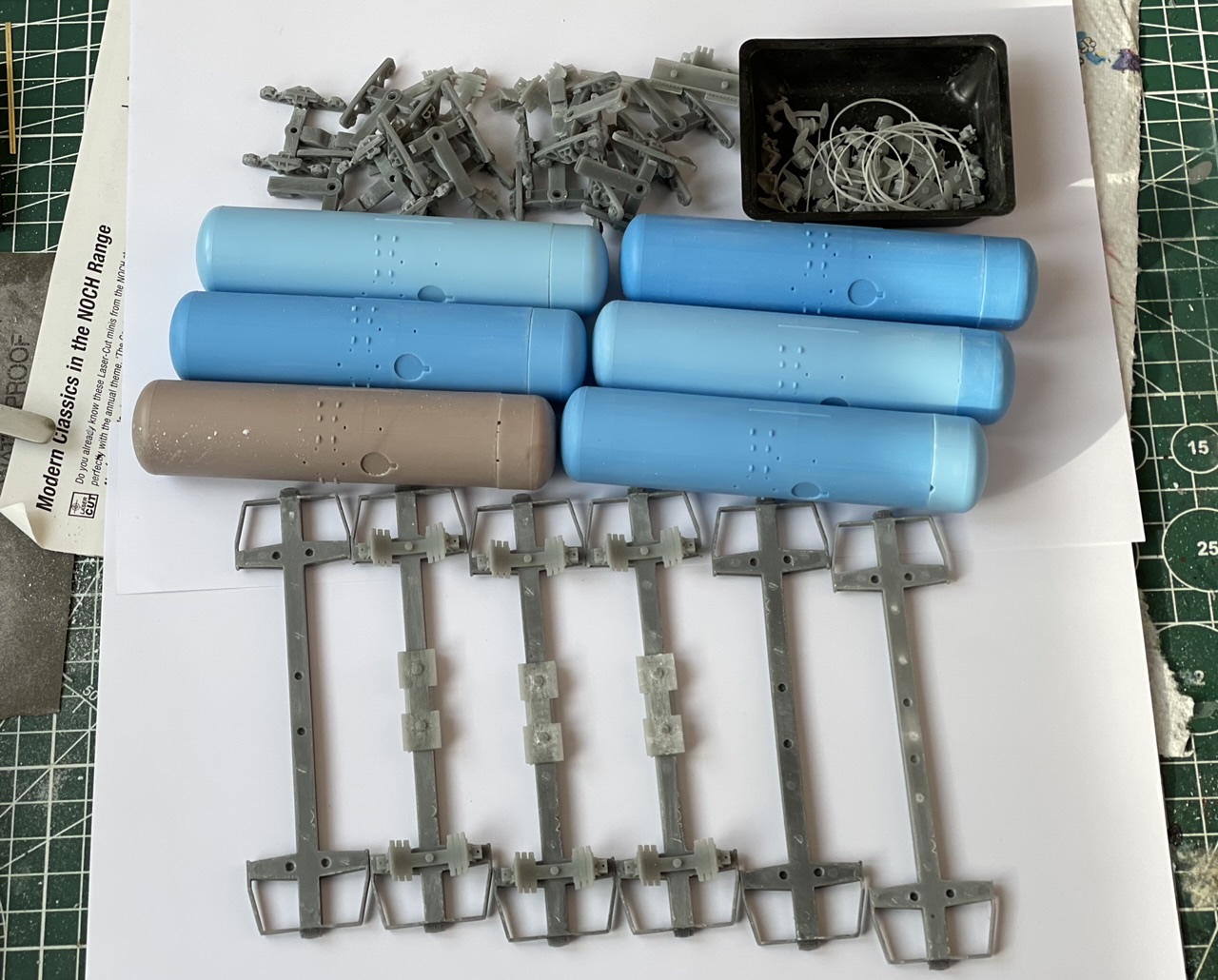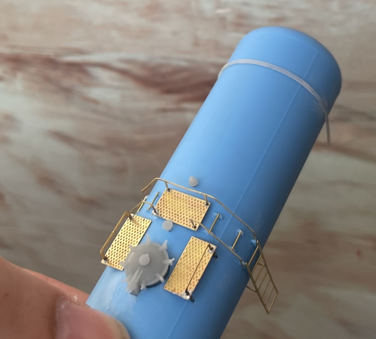 Сама бочка и рама отлиты из смолы (литьевой пластик), вся мелочевка и телеги напечатаны на фотополимерном 3д принтере.