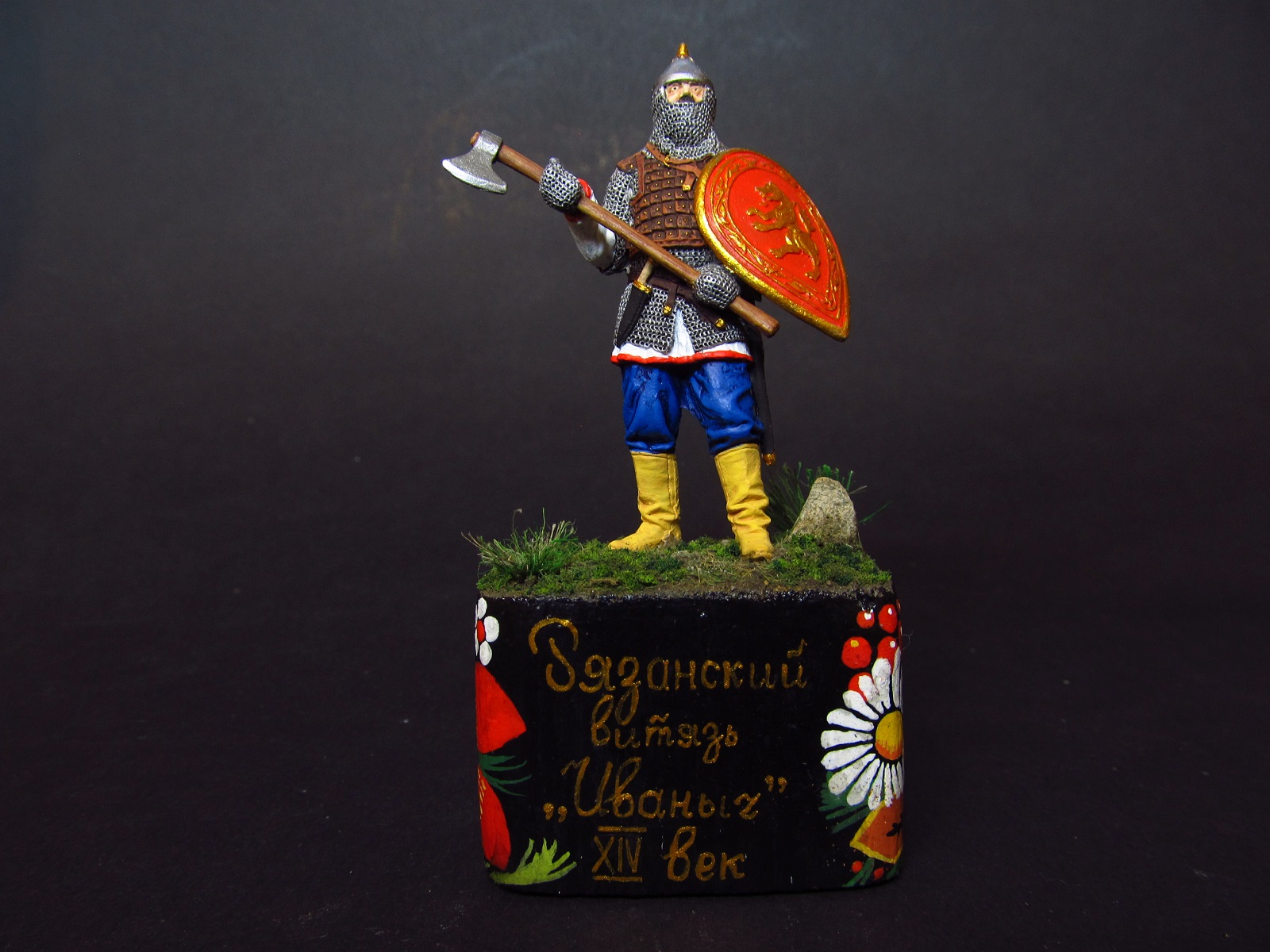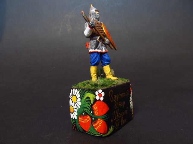 Сразу скажу, эта стезя для меня совершенно нова! Перед тем, как приступать к росписи, цанговым ножом и наждачкой удалил литьевые швы и косяки литья (как потом, при фотографировании, блин, выяснилось- не все). Далее, вдоволь насмотревшись фотографий подобных работ, фотографий современных реконструкторов и посмотрев иллюстрации в книге Владимира Семенова "Русские доспехи X-XVII веков" приступил к росписи фигурки. После росписи фигуры пришла мысль о желательности подставки под нее- все же подарок делаю, не хухры-мухры!))) Вооружившись ножовкой выпилил из соснового бруса подходящий прямоугольник, прошелся по нему наждачкой, укрепил на нем фигуру и для убедительности расписал его в рязанский вид Палехской росписи!))