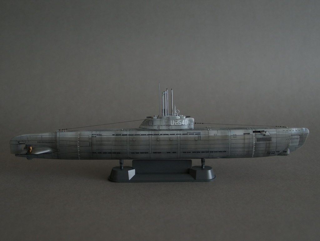 Заменил на самодельные: перископы, шноркель на крыше рубки, натянуты недостающие тросовые радиоантенны, заменены гребные винты, установлены леерные ограждения.