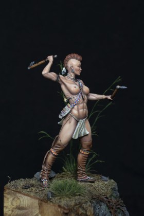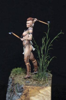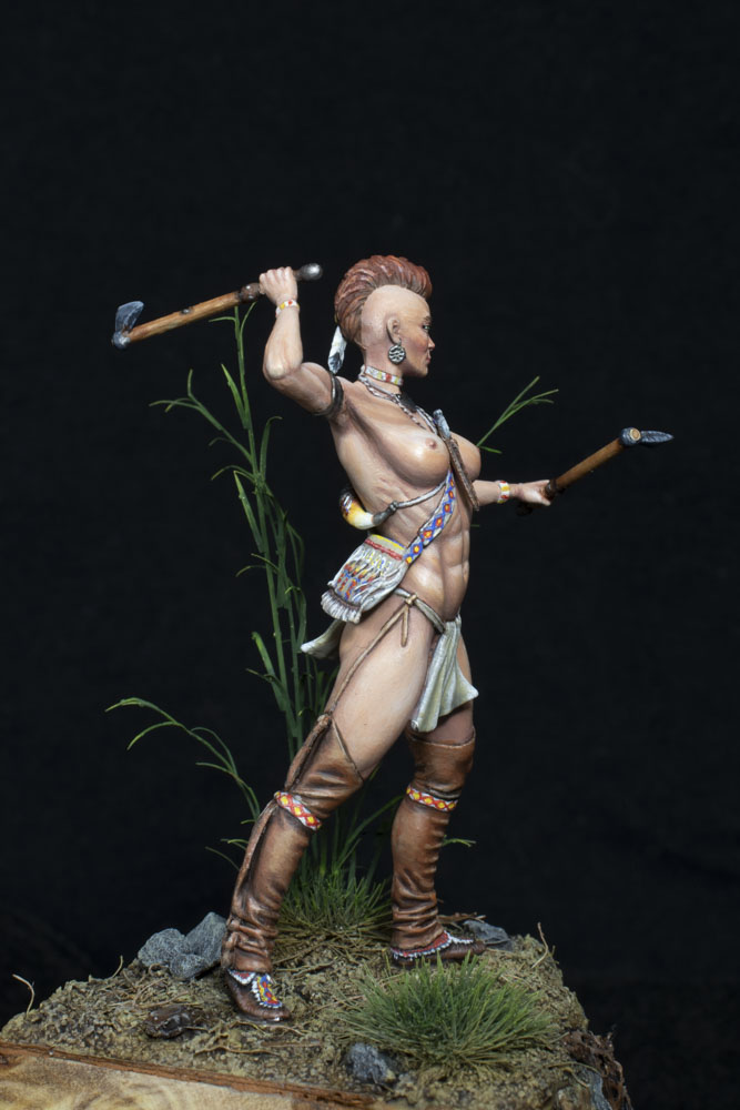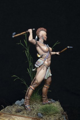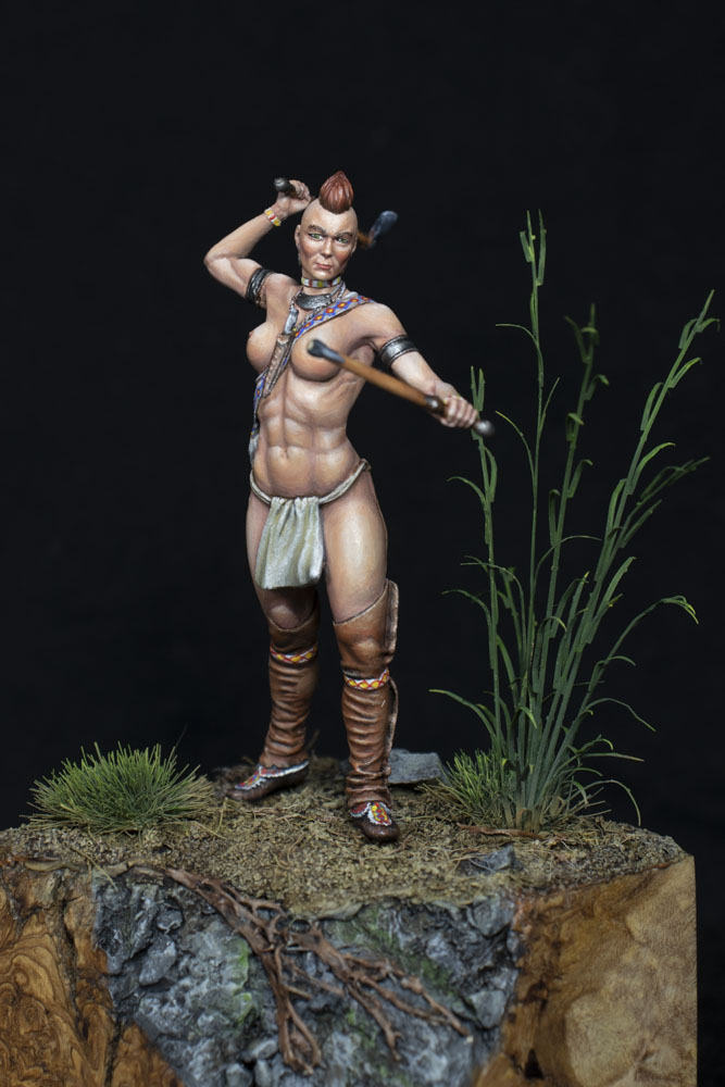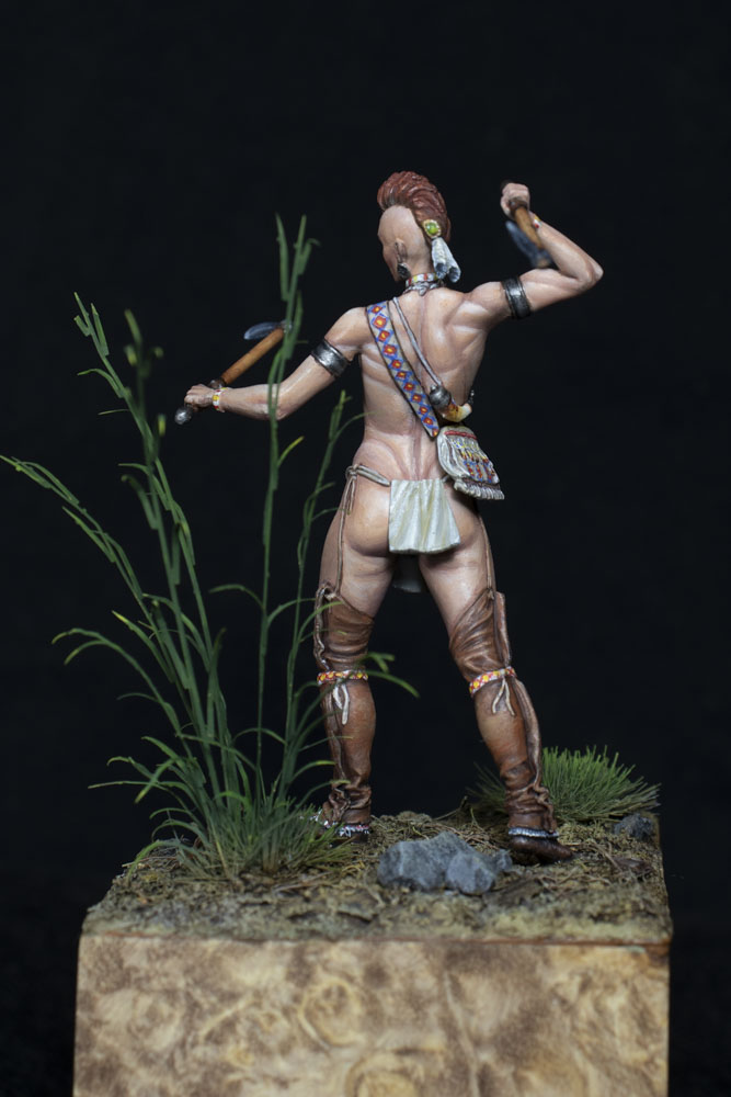 Фэнтезийная фигурка размера 54мм. Красил почти полностью акрилом от Vallejo. Серьги, рукоять томагавка, кольца на плечах металлик от Citadel. Лезвие решил в NMM. На достоверность в элементах одежды не претендую. Больше упор тут я делал на открытых кожных участках. Хотя и с цветом немного промах. Вроде как это все-таки загорелый индеец.