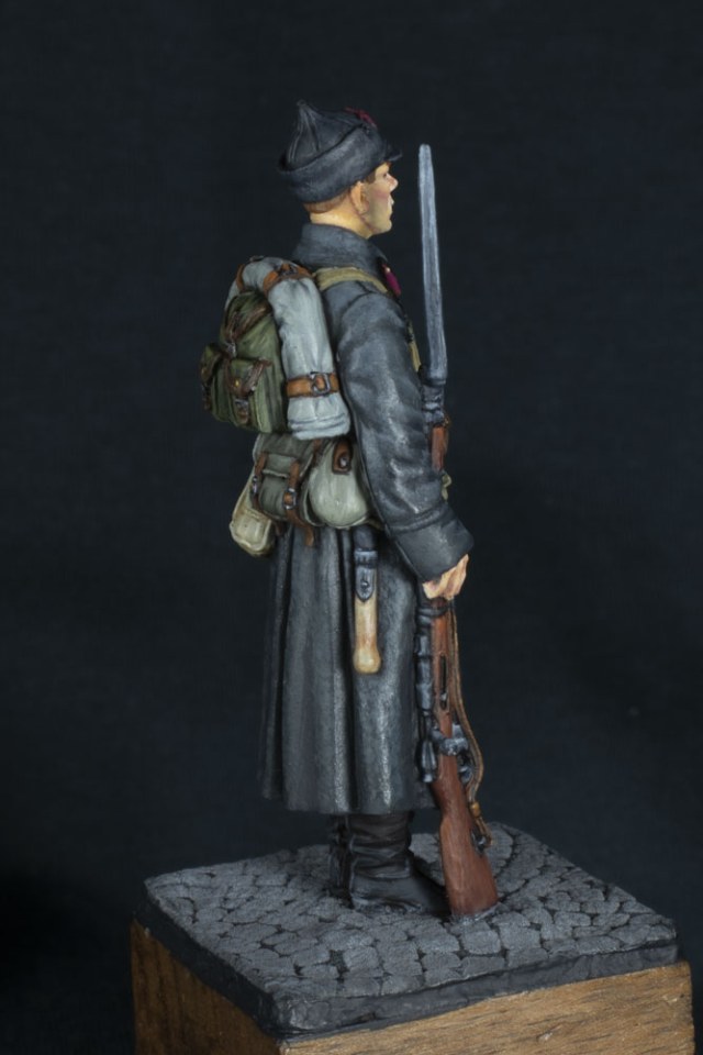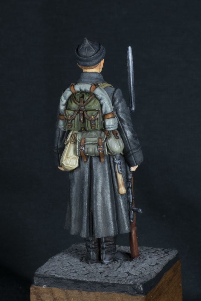 Решил отметить предстоящий праздник тематической работой. Фигурка от EK-Castings 54мм. Брусчатка Tamiya. Лицо попробовал краской от Pacifiс88 Atr Color, остальное Vallejo. На мой взгляд надо привыкать еще, пока на Vallejo результат у меня был лучше. Но все равно фигурки от EK-Castings радуют, мне самому очень нравится разглядывать. Все мелкие детальки постарался подчеркнуть. На крайних фото музей военной формы в качестве референса. Там где солдат в шинели это 1935-год, так что рюкзак там кожаный, но на фото со спины рюкзак уже 40-х