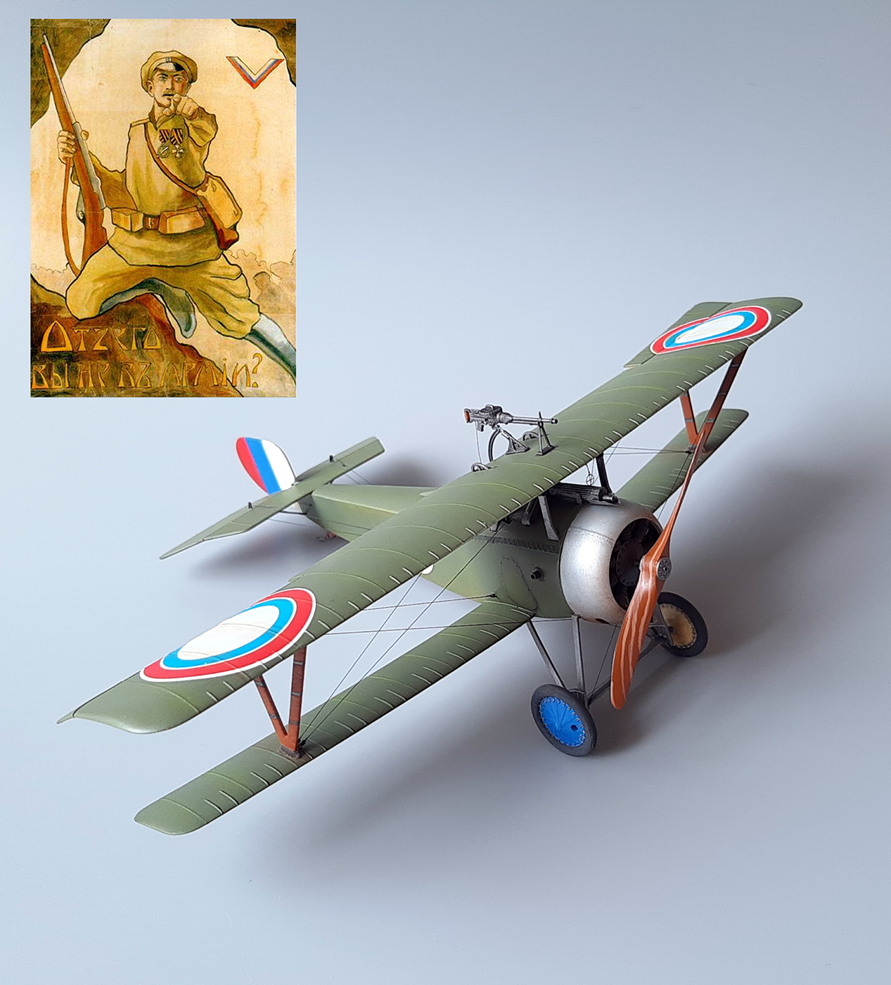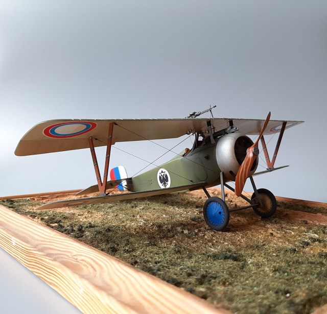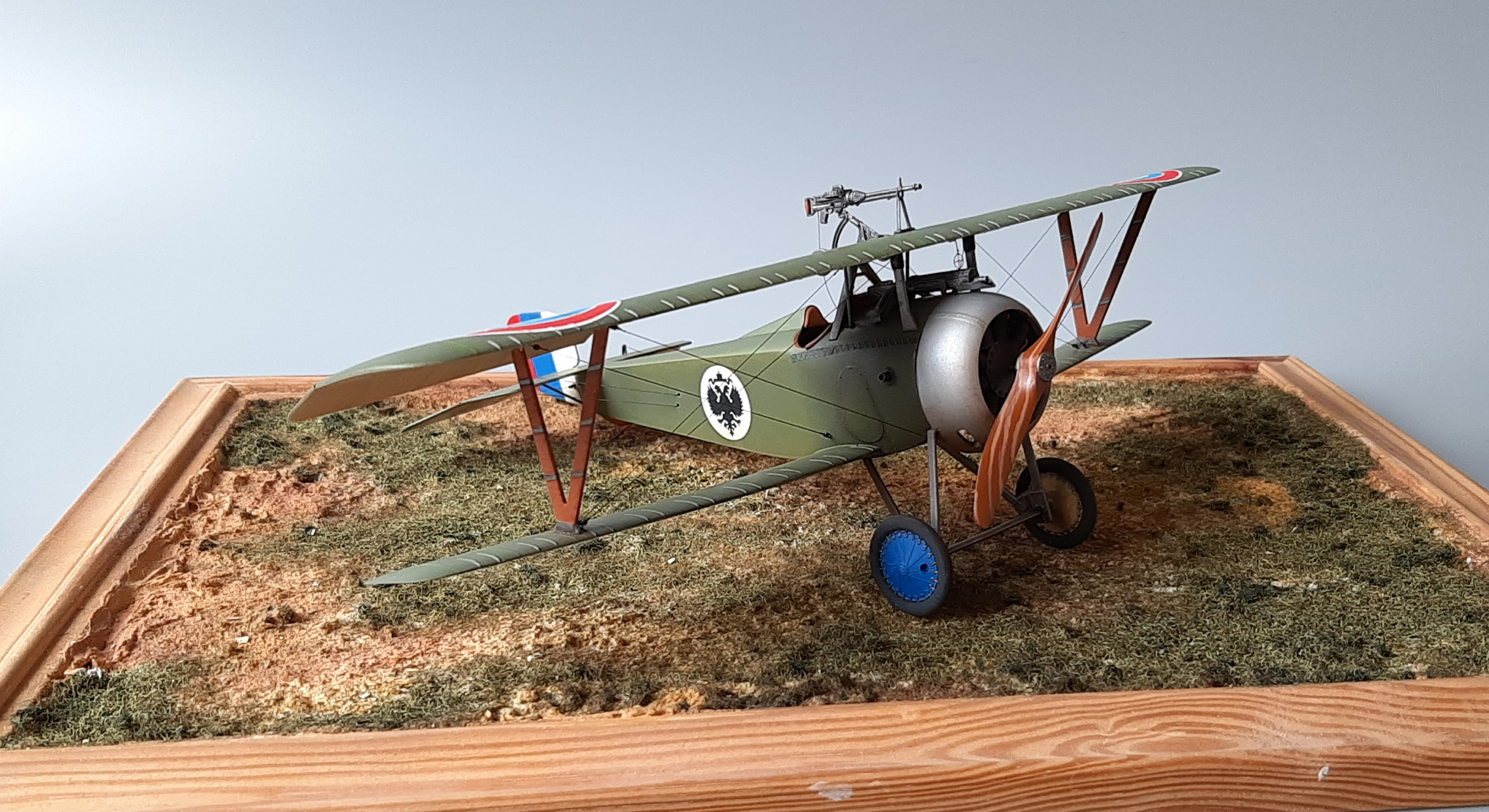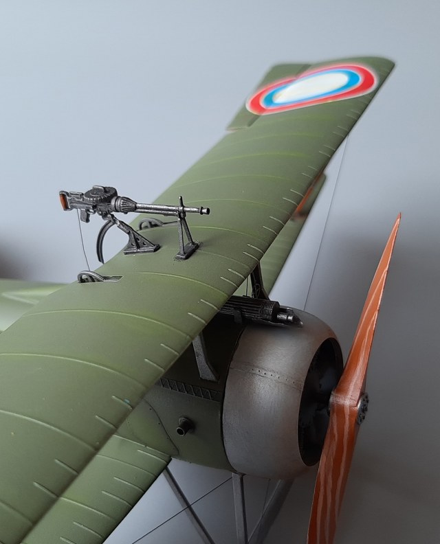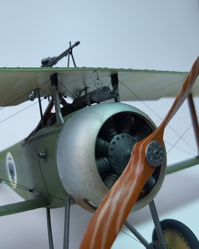 Из доработок :сточен и заменен заголовник кабины пилота , добавлена проводка к цилиндрам, немного добавлены приборы, заменен верхний пулемет на А-Модел, сделан тросик, доработан капот мотора , сделана нижняя алюминиевая плита, доработан пулемет "Виккерс", добавлен прицел от МД.