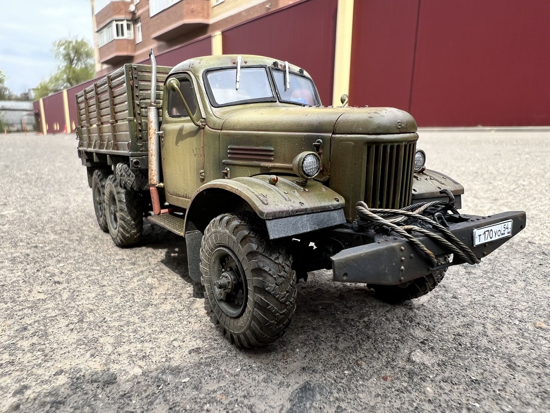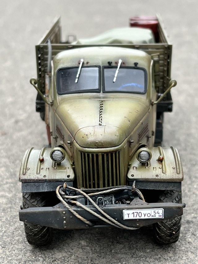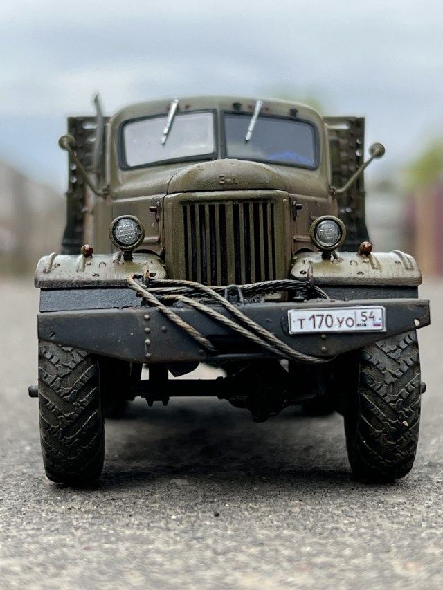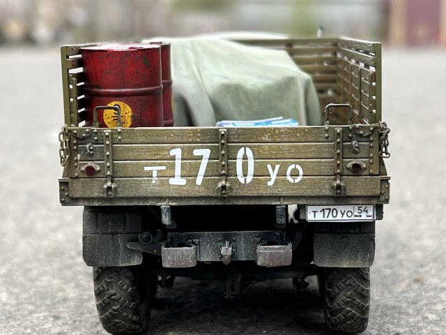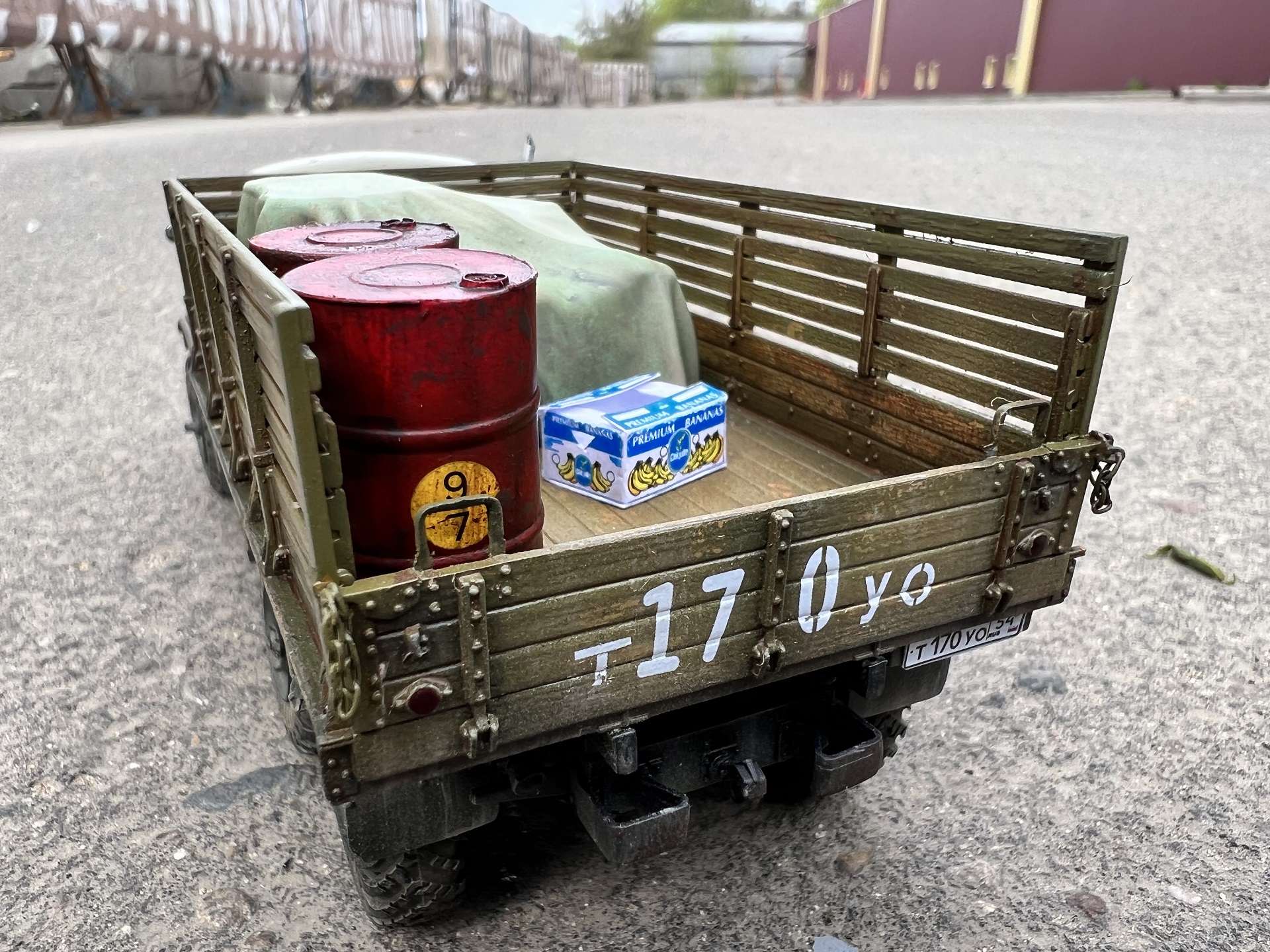 Сам кит тоже достаточно старый, но собирается без каких-либо проблем. Глубоко в матчасть не вдавался, собирал из коробки, но хотел создать образ демобилизованного старичка, потертого, но вполне бодрого и служащего людям. Поэтом доработал примерно так, как их дорабатывают нынешние владельцы: добавил брызговики на передние колеса, перенес выхлоп на бок кабины (виртуальный владелец явно вдохновлялся виденными по ТВ американскими грузовиками, обмотал руль изолентой из нитки). В кузов кинул груз от Armor35. Добавил металлический трос (ни в коем случае не используйте нитку из набора, очень сильно ворсится). Хотел добавить фартук или картонку на решетку радиатора, но не нашел подходящего материала, чтобы смотрело натурально. Окраска - Tamiya и HobbyColor,