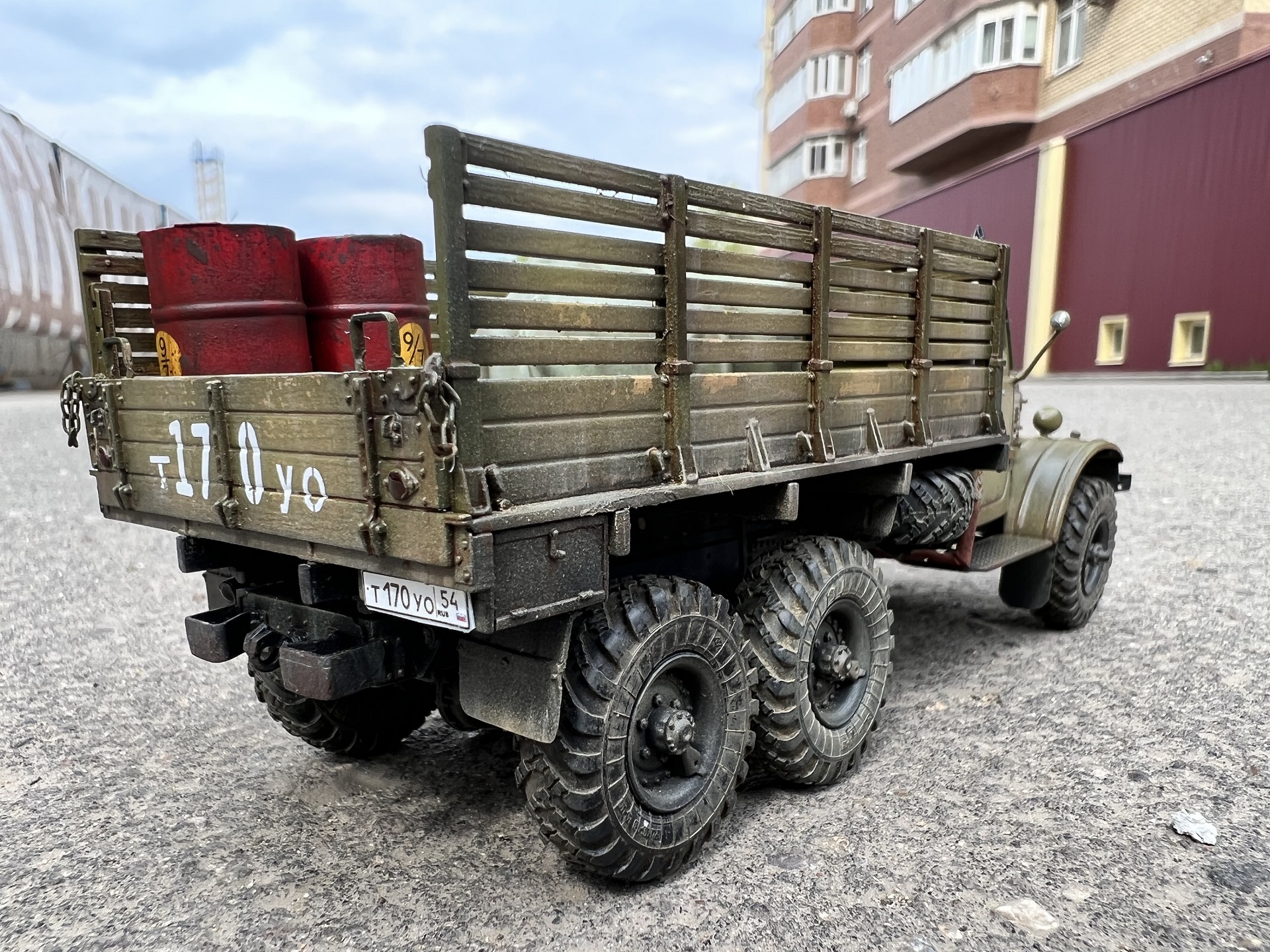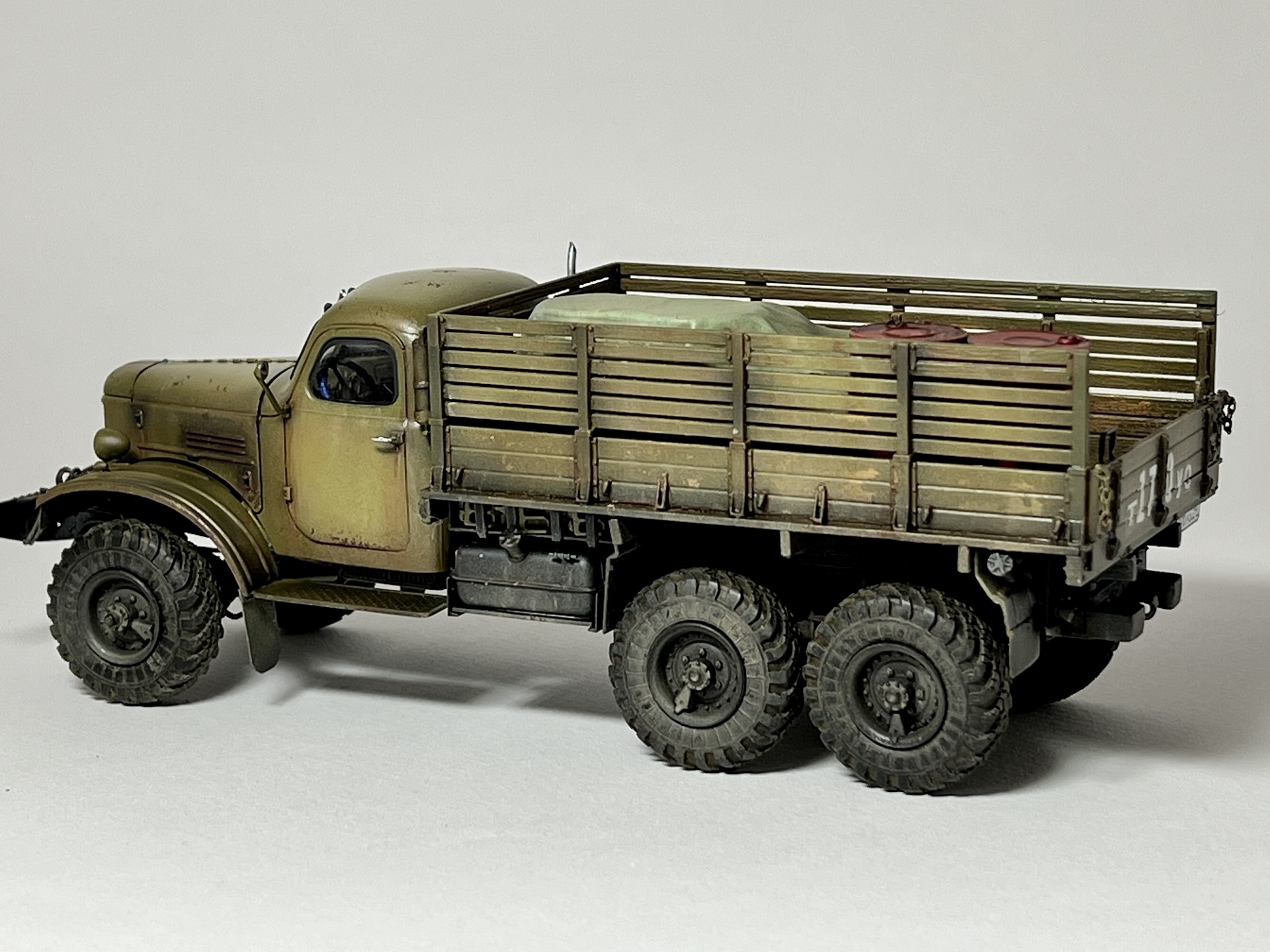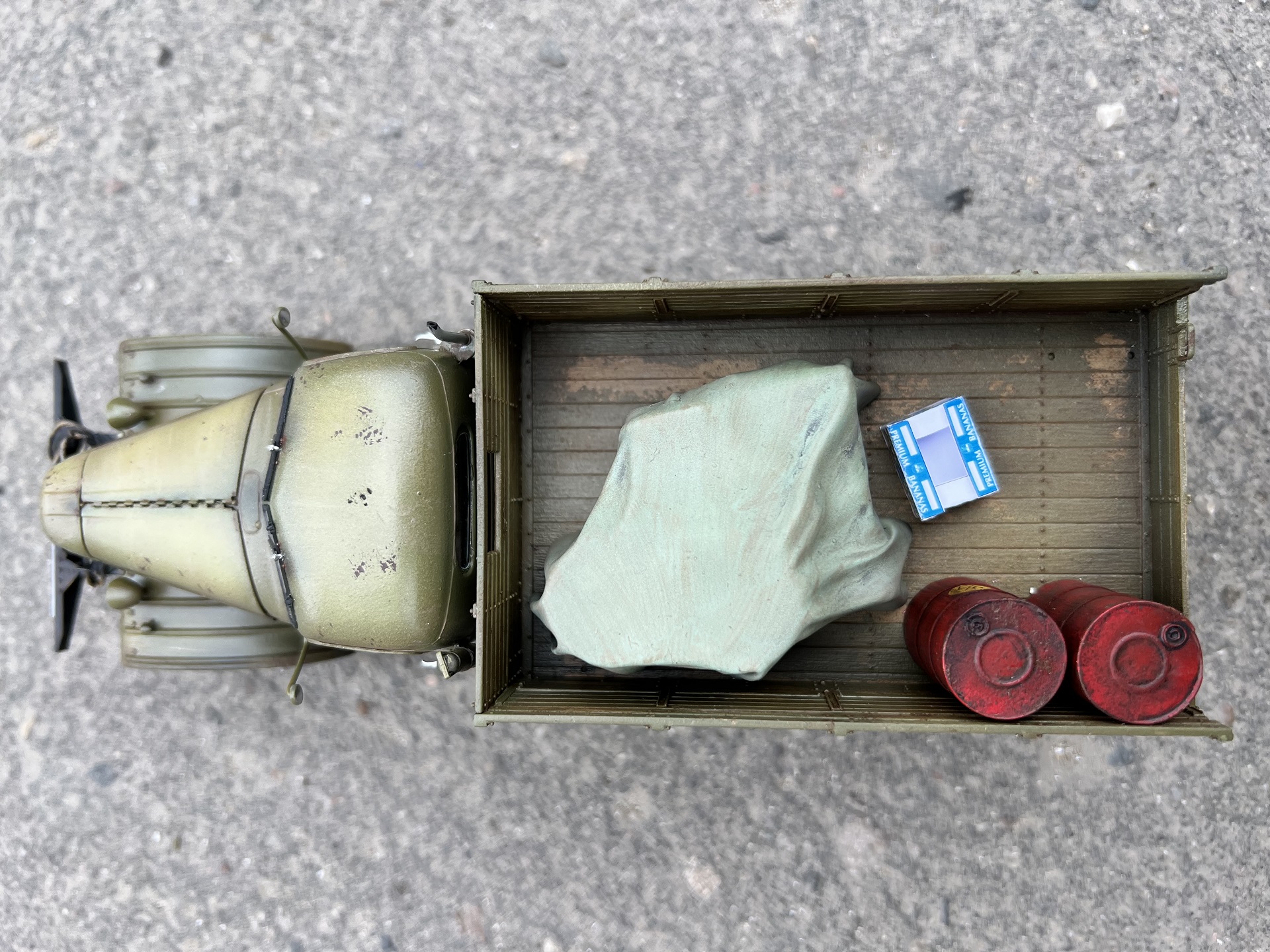 Сам кит тоже достаточно старый, но собирается без каких-либо проблем. Глубоко в матчасть не вдавался, собирал из коробки, но хотел создать образ демобилизованного старичка, потертого, но вполне бодрого и служащего людям. Поэтом доработал примерно так, как их дорабатывают нынешние владельцы: добавил брызговики на передние колеса, перенес выхлоп на бок кабины (виртуальный владелец явно вдохновлялся виденными по ТВ американскими грузовиками, обмотал руль изолентой из нитки). В кузов кинул груз от Armor35. Добавил металлический трос (ни в коем случае не используйте нитку из набора, очень сильно ворсится). Хотел добавить фартук или картонку на решетку радиатора, но не нашел подходящего материала, чтобы смотрело натурально. Окраска - Tamiya и HobbyColor,
