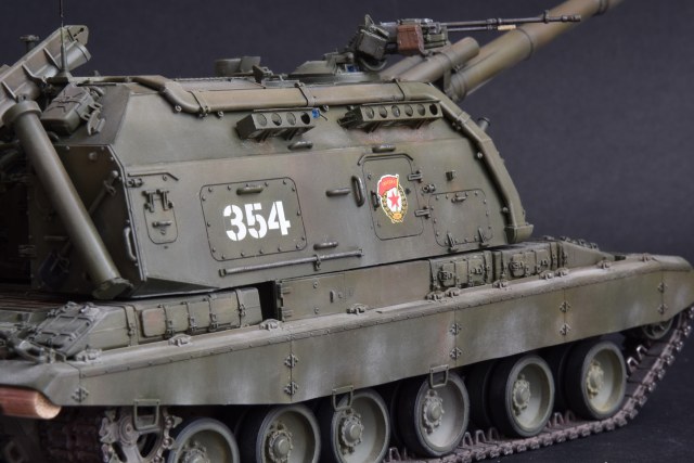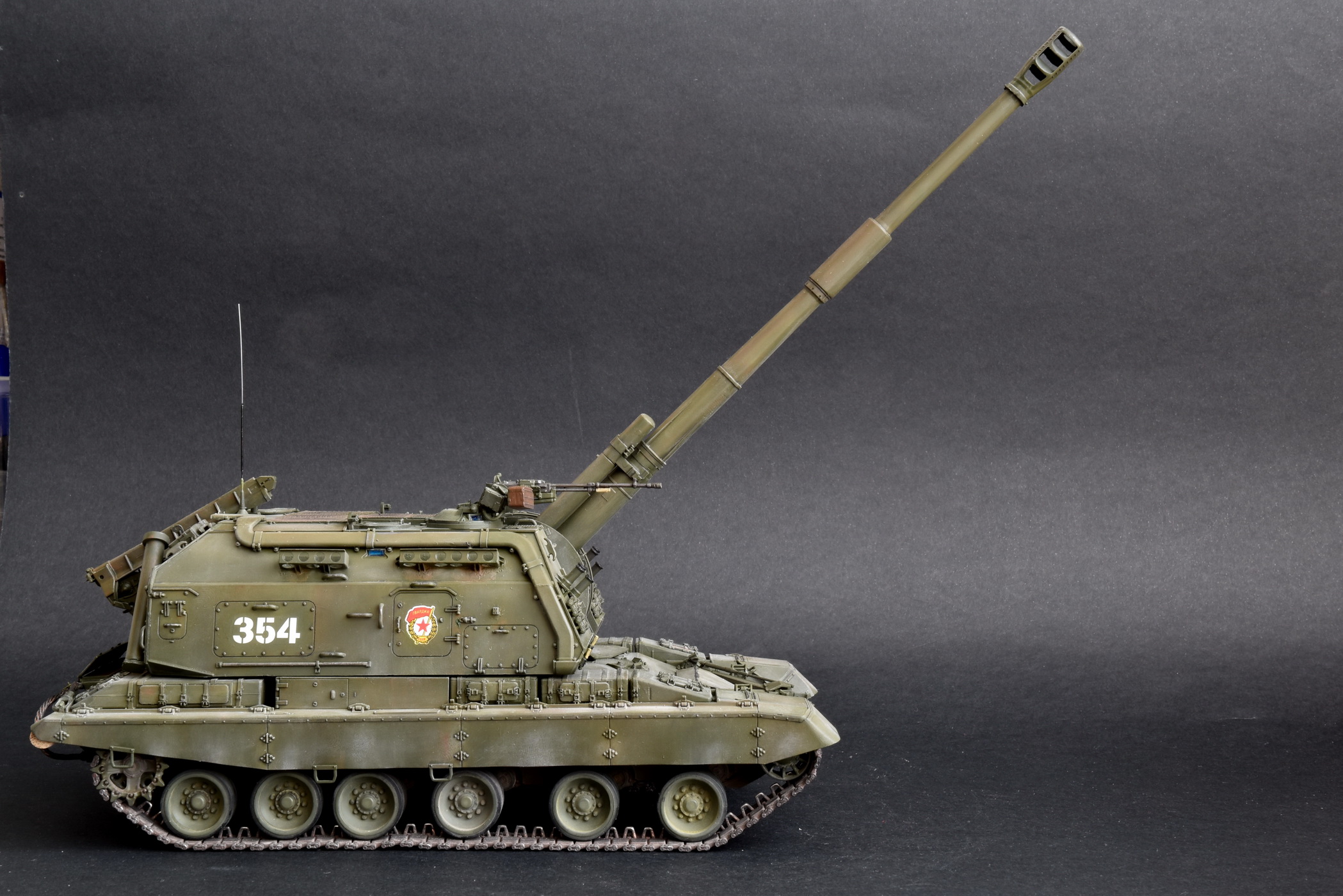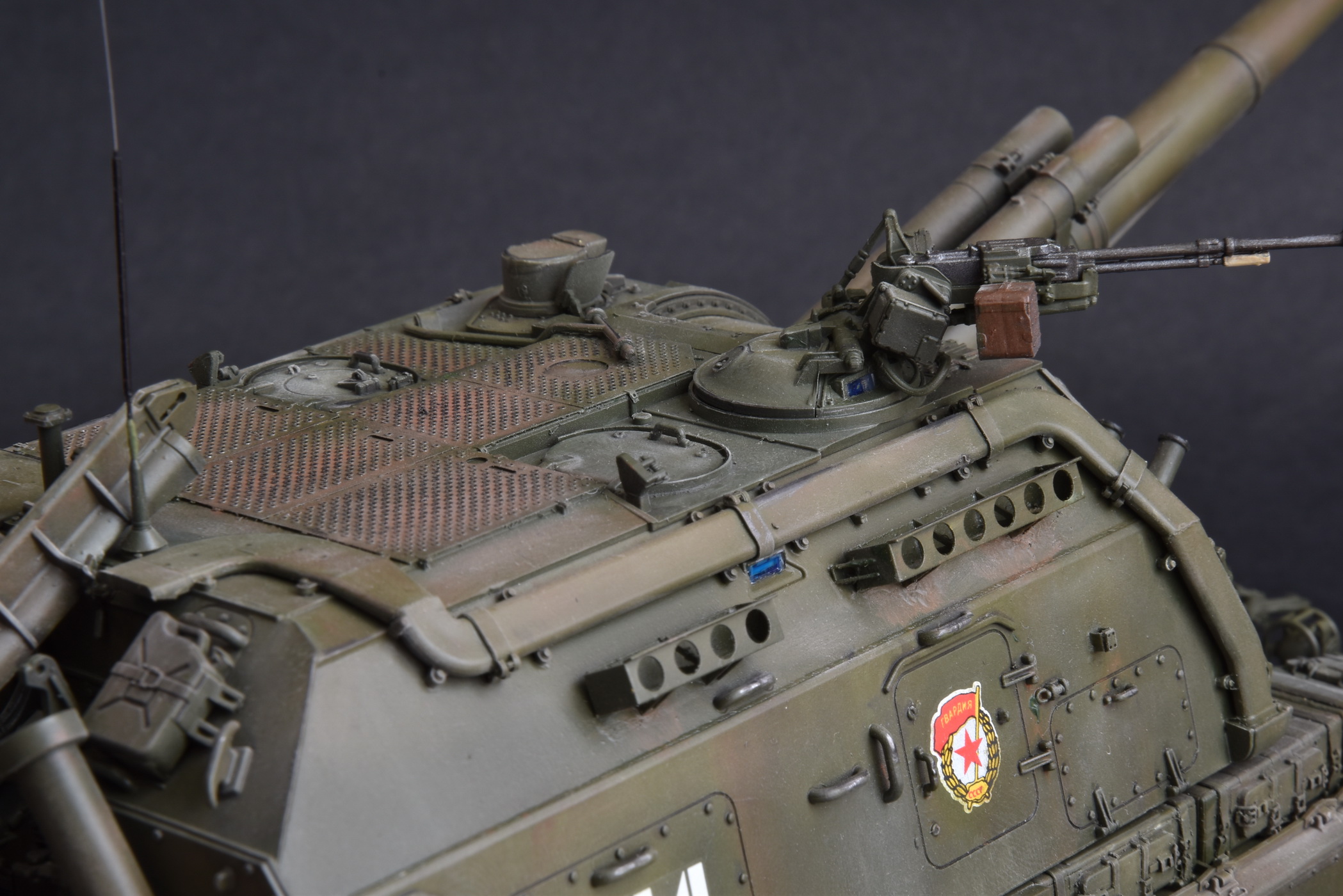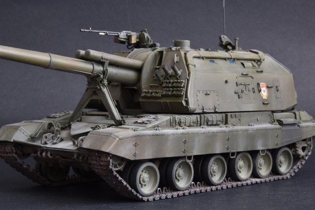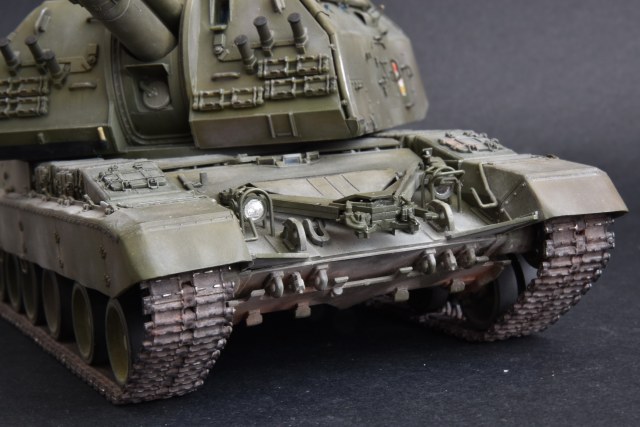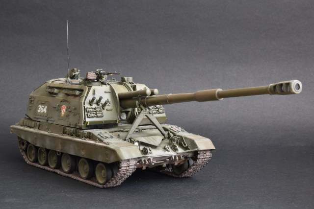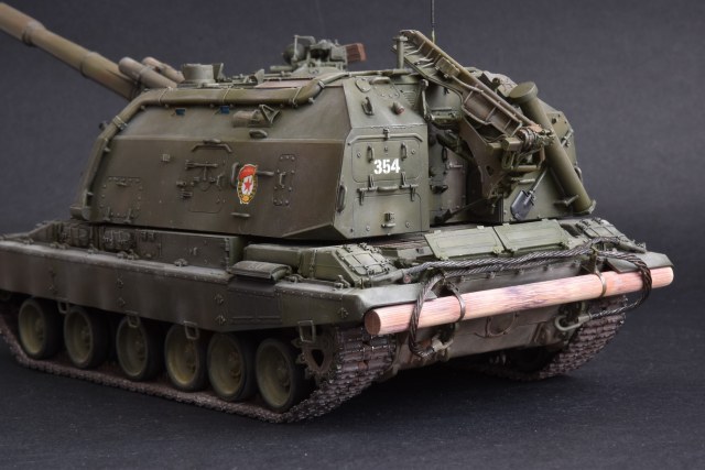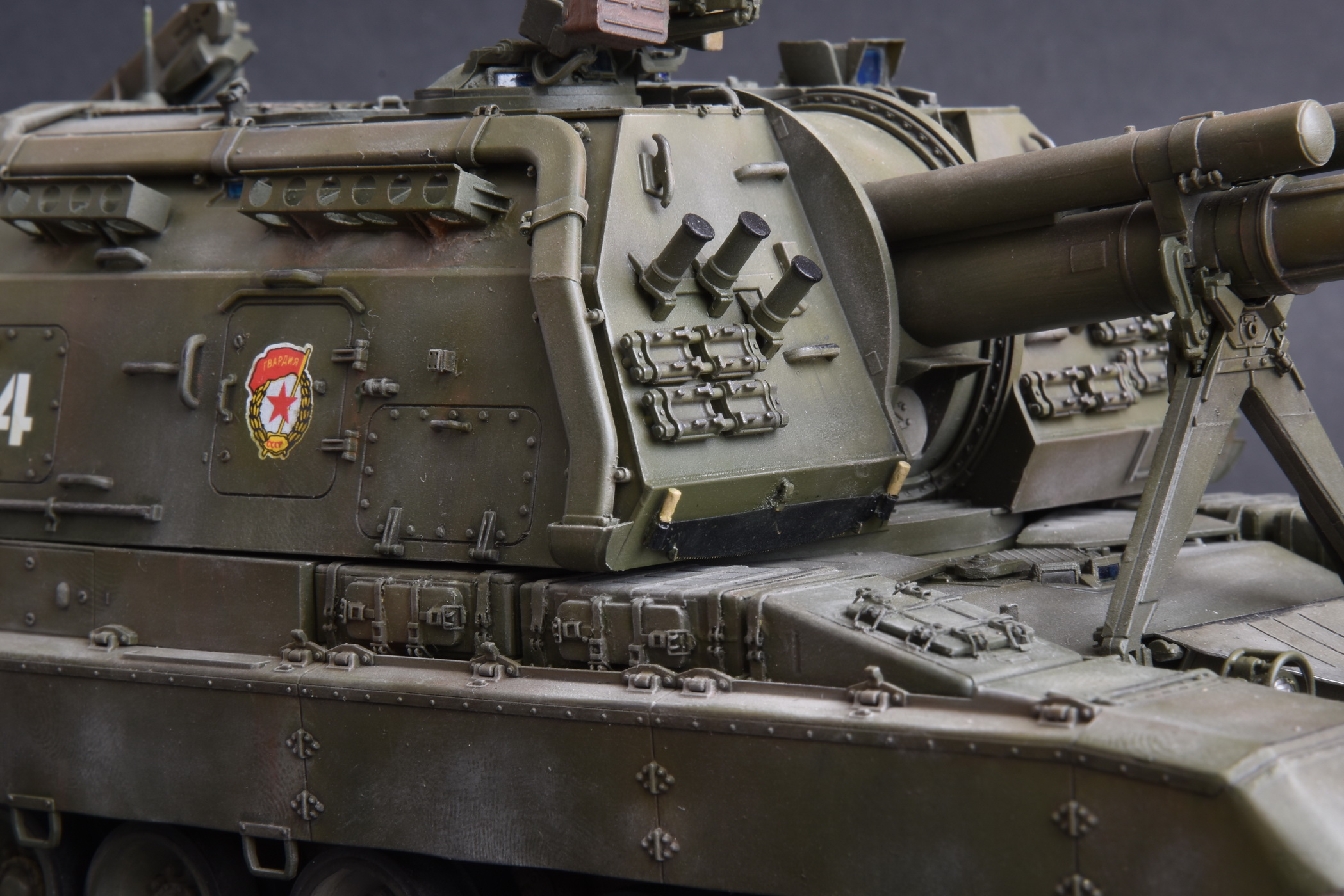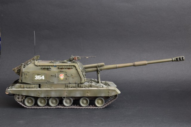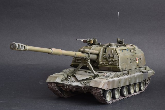 Представляю свою версию МСТА-С от Звезды. О качестве данного набора здесь уже говорилось и повторяться не вижу смысла. Модель собирал целый год с большими перерывами. При построении модели использовал фототравление от Микродизайн, но его использовал только на 2/3, из-за очень мелких деталей, но замки на ящиках я осилил, а вот болты на сетках не смог. Металлические экраны оставил для Т-80. Использовал краски и смывку Tamiya, пигменты Mig, металлические траки Friulmodel.