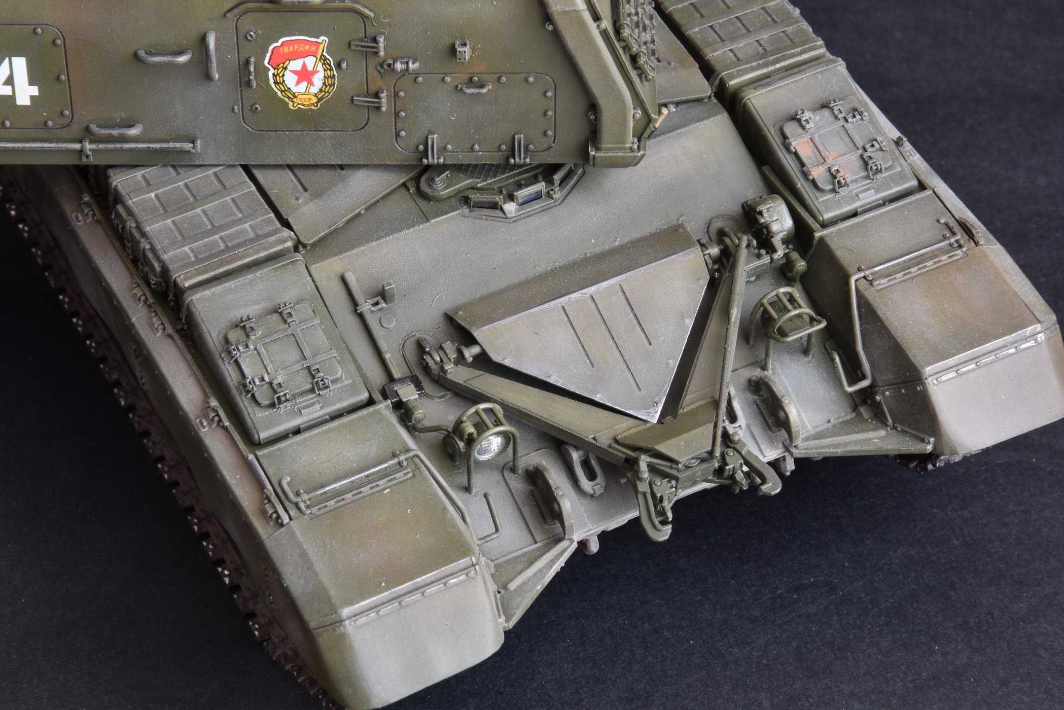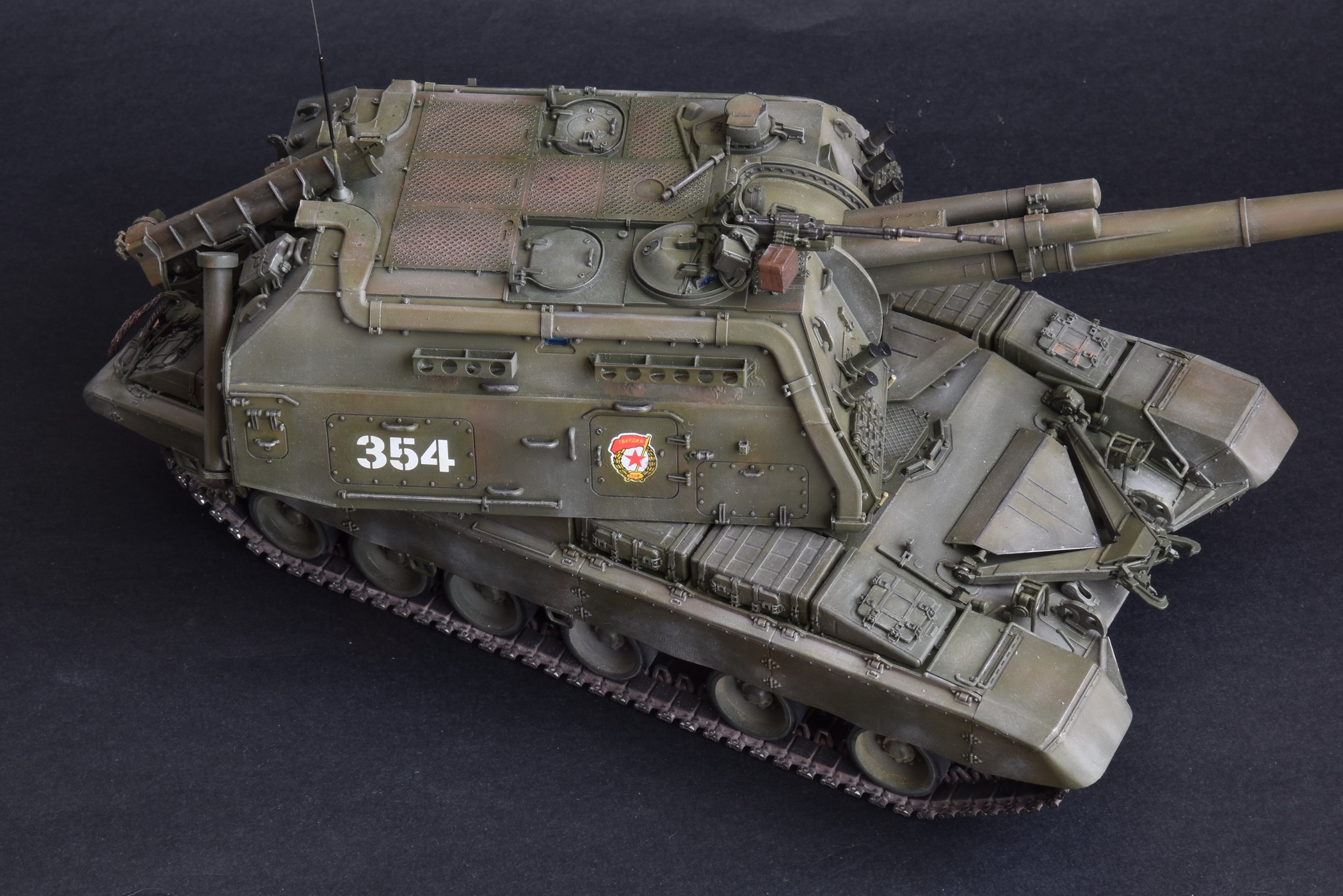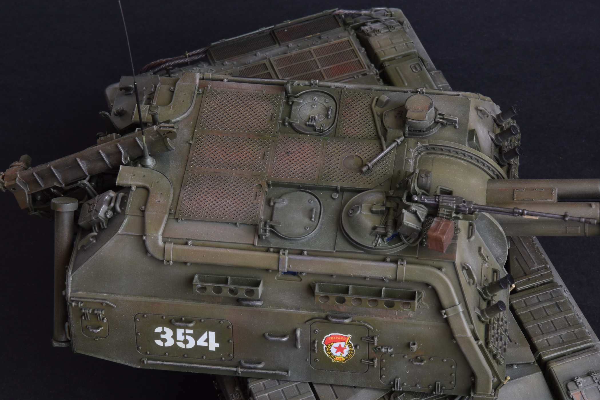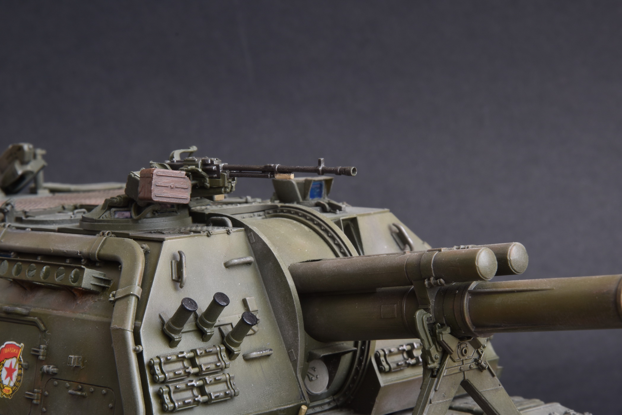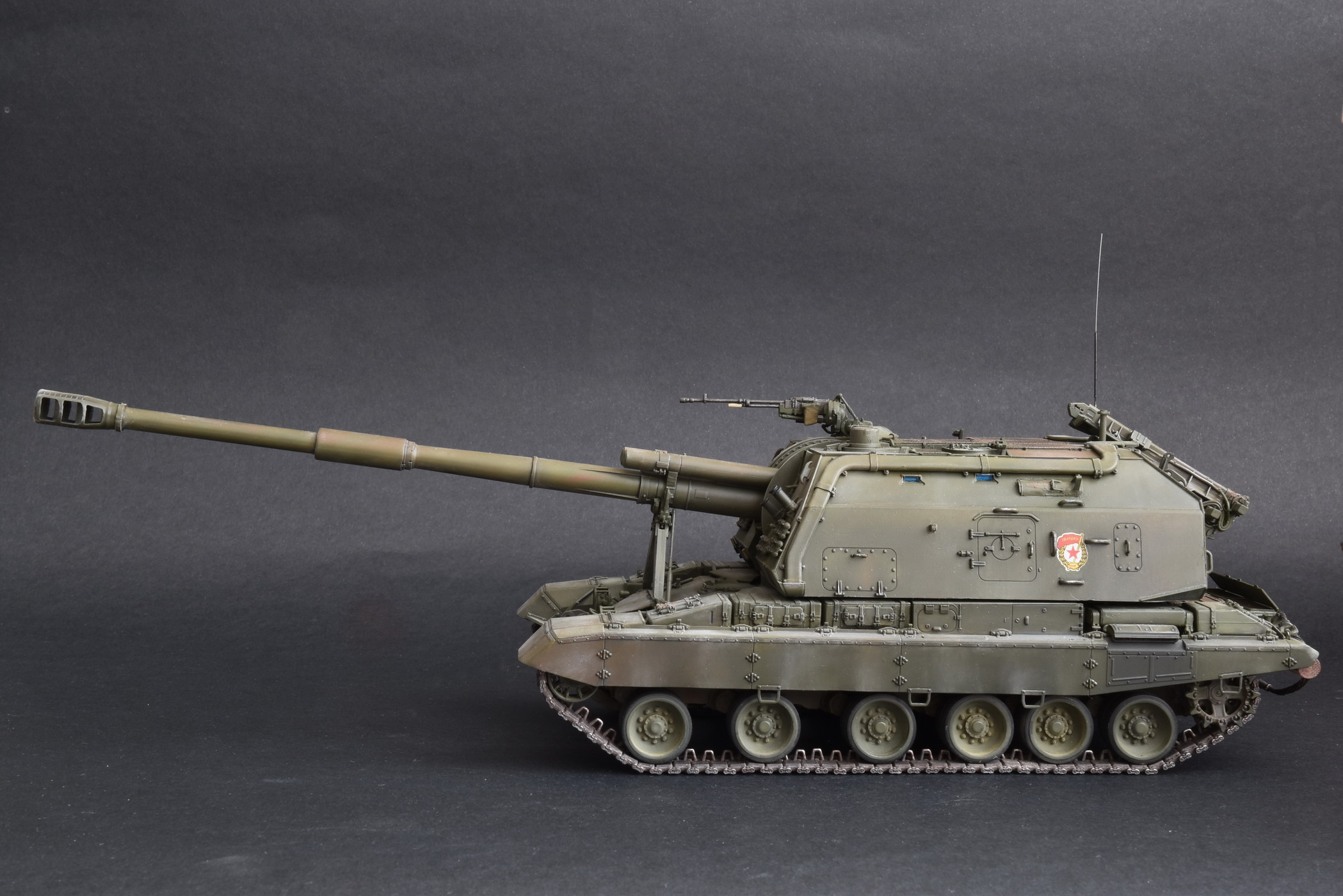 Представляю свою версию МСТА-С от Звезды. О качестве данного набора здесь уже говорилось и повторяться не вижу смысла. Модель собирал целый год с большими перерывами. При построении модели использовал фототравление от Микродизайн, но его использовал только на 2/3, из-за очень мелких деталей, но замки на ящиках я осилил, а вот болты на сетках не смог. Металлические экраны оставил для Т-80. Использовал краски и смывку Tamiya, пигменты Mig, металлические траки Friulmodel.