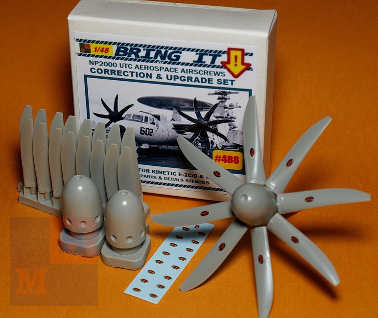следуя непрерывному потоку информации переосмыслена форма лопастей возд. винтов в наборе #488 Пропеллеры UTCAerospace NP2000 для конверсии в Hawkeye2000 Е-2С или С-2А от Кинетика. Как и ранее, к смоляным деталям добавлены декальные лого производителя.