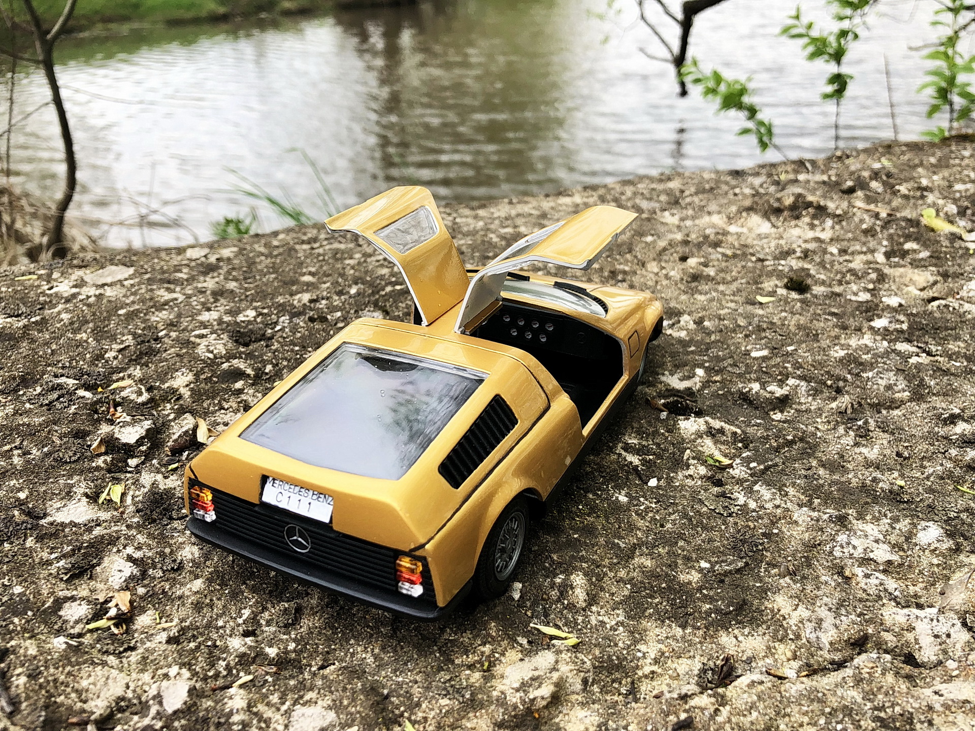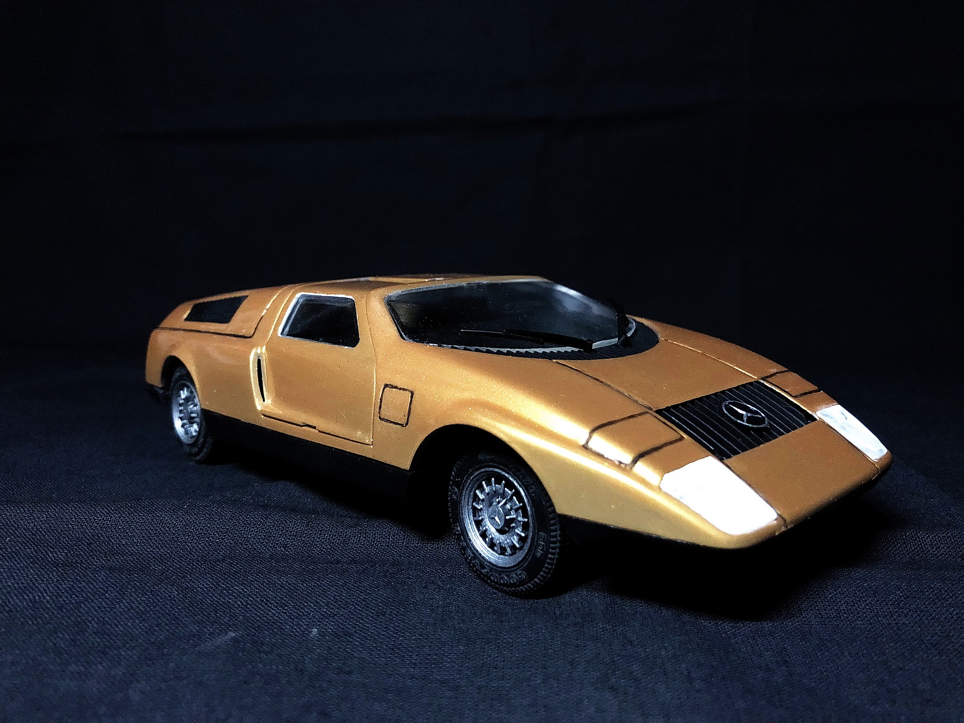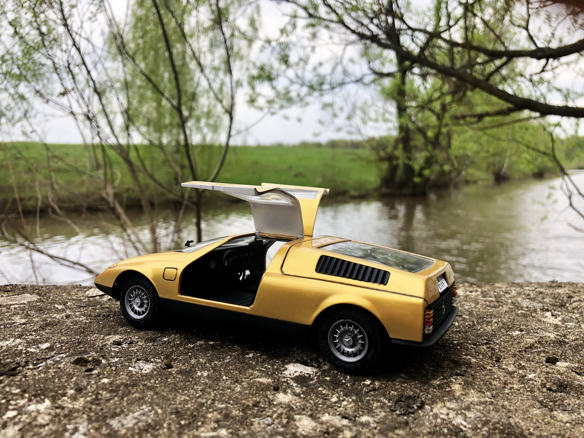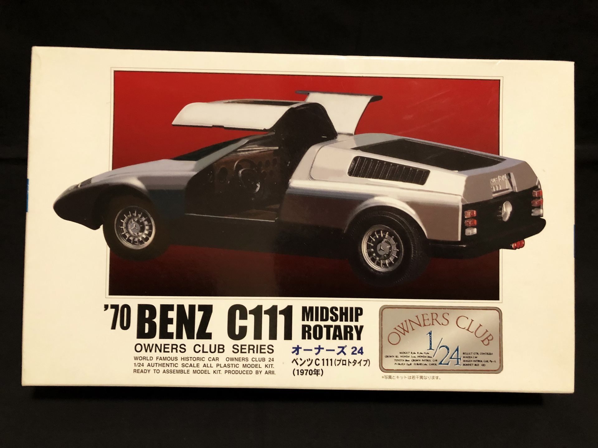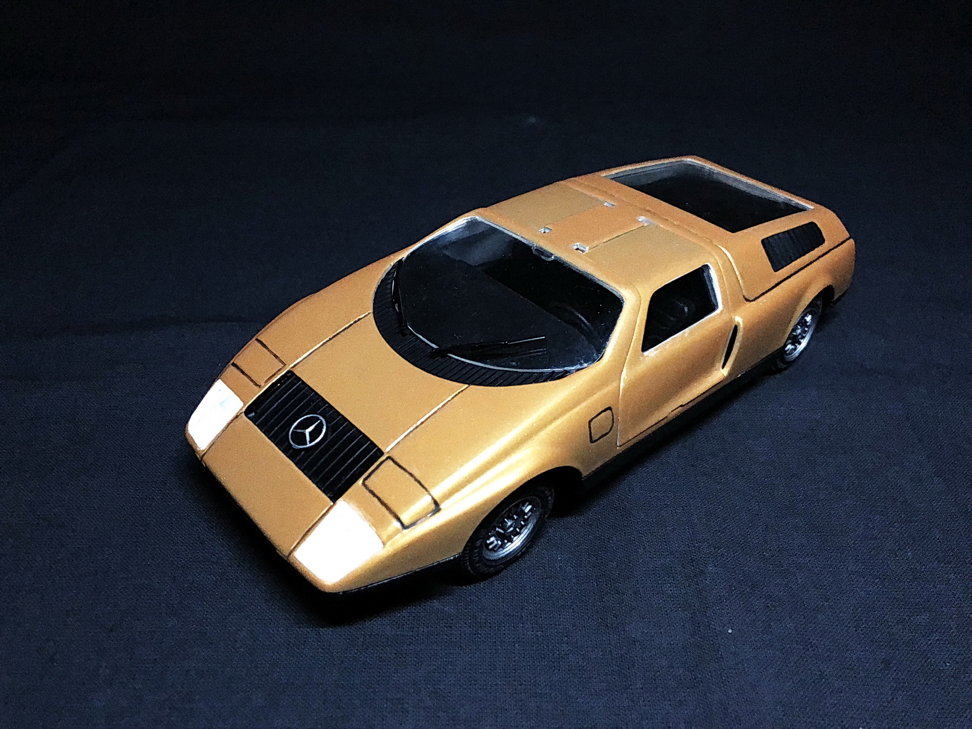 Сборка. 38 или 39 деталей в общем комплекте кита, но абсолютно каждую надо обтачивать от облоя, долго и тщательно подгонять: в "лучших традициях" моделей 80-90гг. Матчасть и пропорции - не соблюдены производителем: отсутствовали лючки бензобаков (на С111 их 2), что было исправлено; линия капота - слишком упавшая, т.е. имеет слишком крутой скос, а также открывающиеся фары - короче чем на реальном прототипе - данные недостатки не стал исправлять. Колеса на реальном прототипе - разноширокие, производитель и этим пренебрег, + задняя ось слишком короткая, в результате чего стильный и мускулистый авто выглядит немного как трамвай... Деталировка дверей - отсутствует абсолютно, интерьер более-менее аутентичный.
