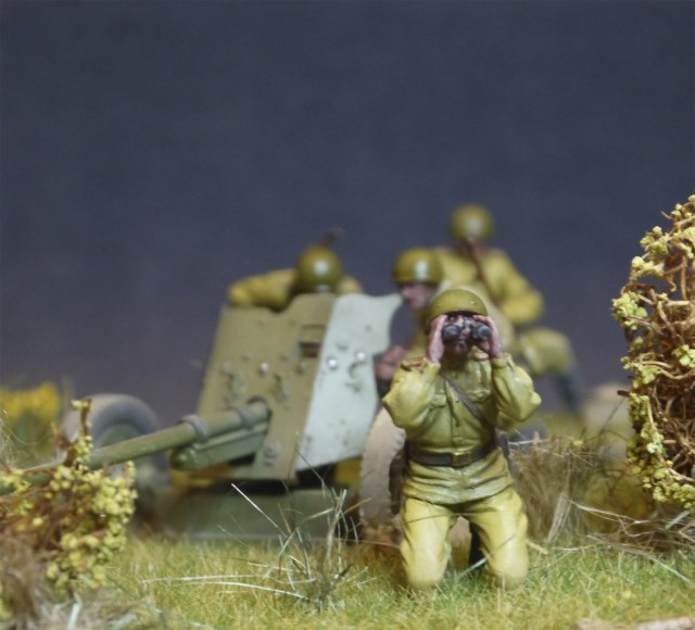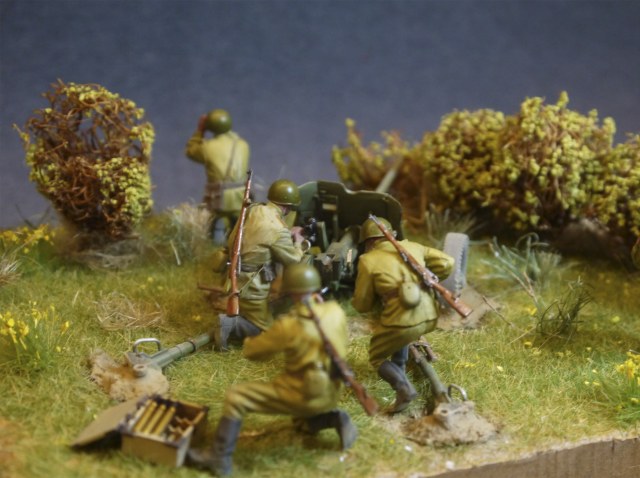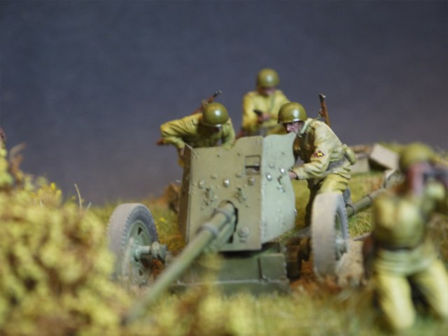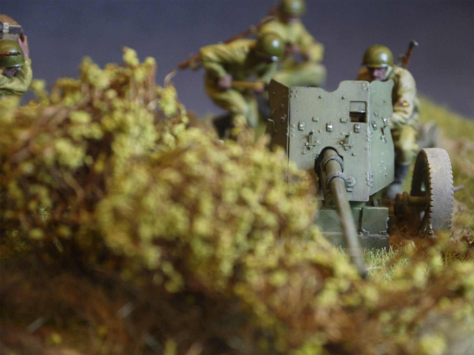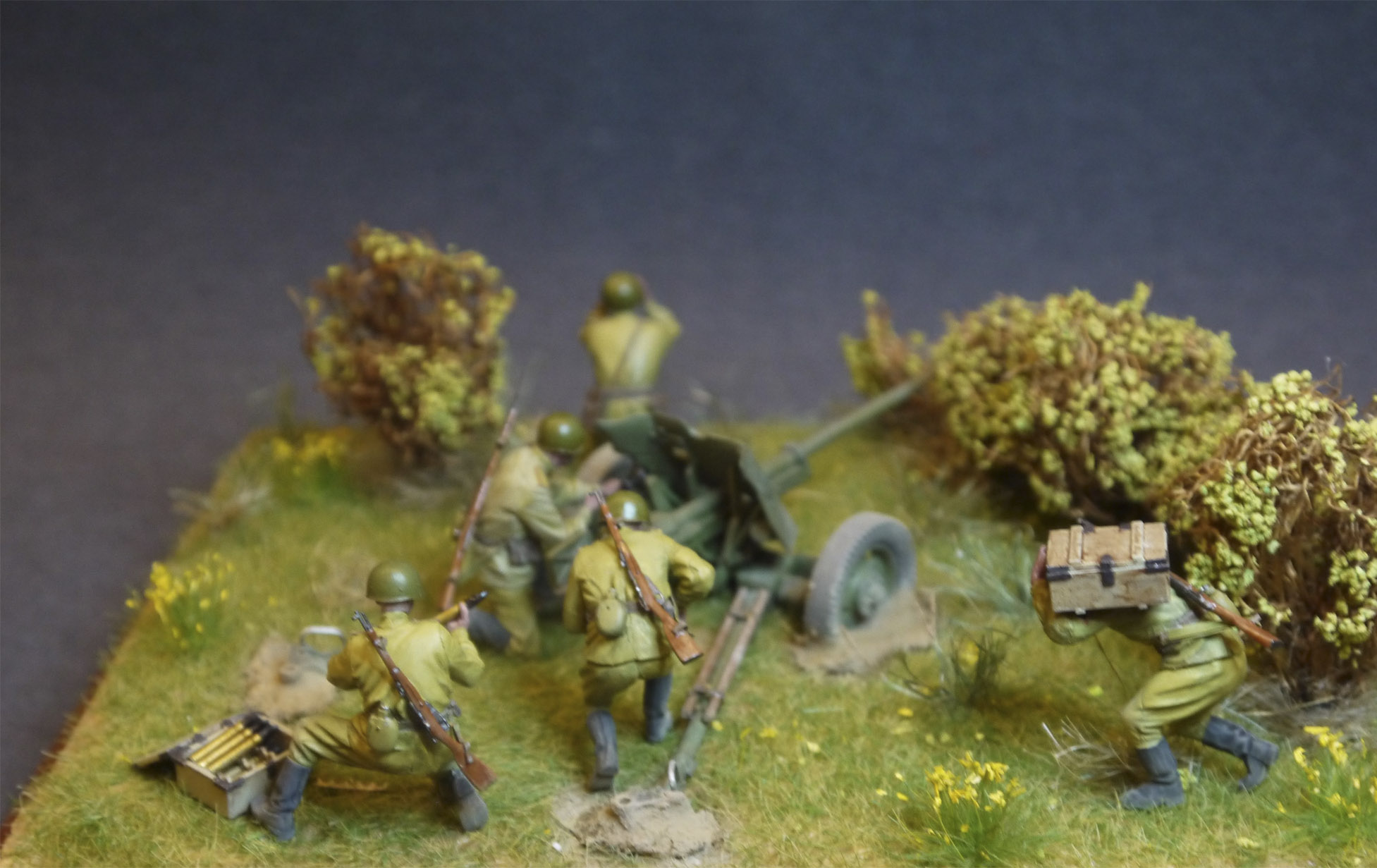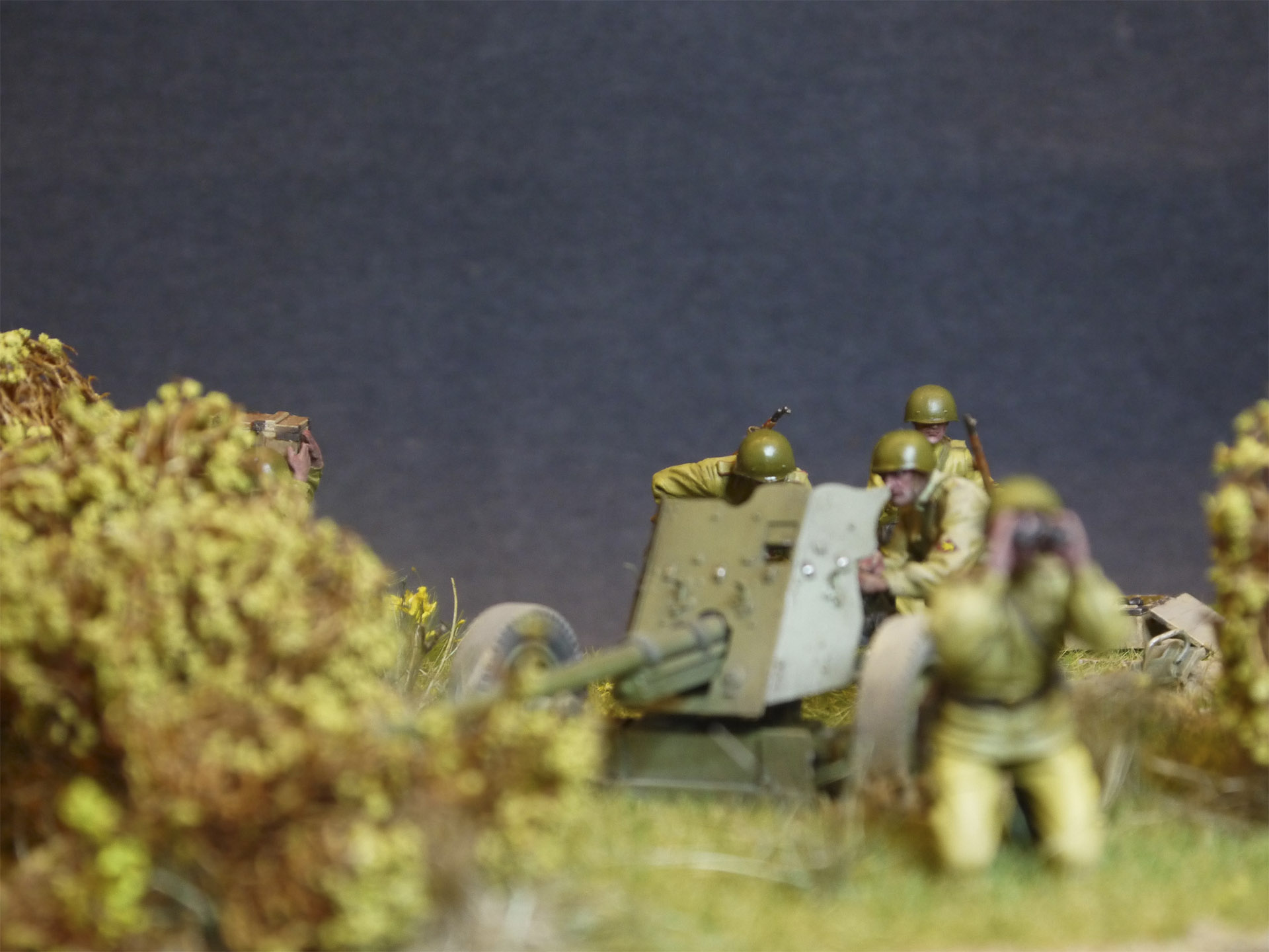Доброго времени суток. В целом диорама понравилась. Но только не сходится временной промежуток. Судя по солдатам на дворе минимум лето 43го года, а сюжет больше тянет на лето 41го, ну может лето 42го. Да и каски в самом деле чересчур блестят. А по поводу стрельбы в кусты я вижу это так. Орудие замаскировано в кустарнике, командир орудия по месту намечает ориентиры, сектора стрельбы. Далее по команде орудие выкатывается вперëд на позицию стрельбы прямой наводкой. В этом и заключается смысл засады, до последнего момента быть не видимым