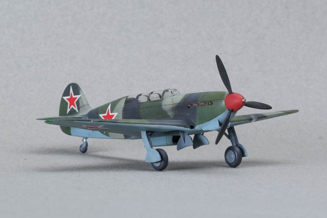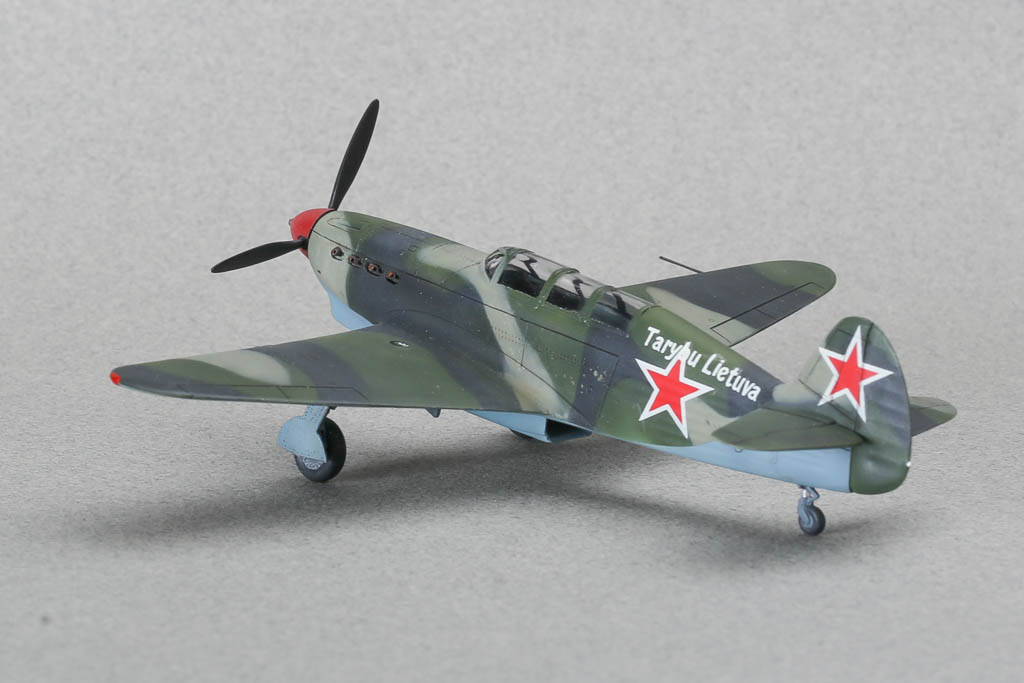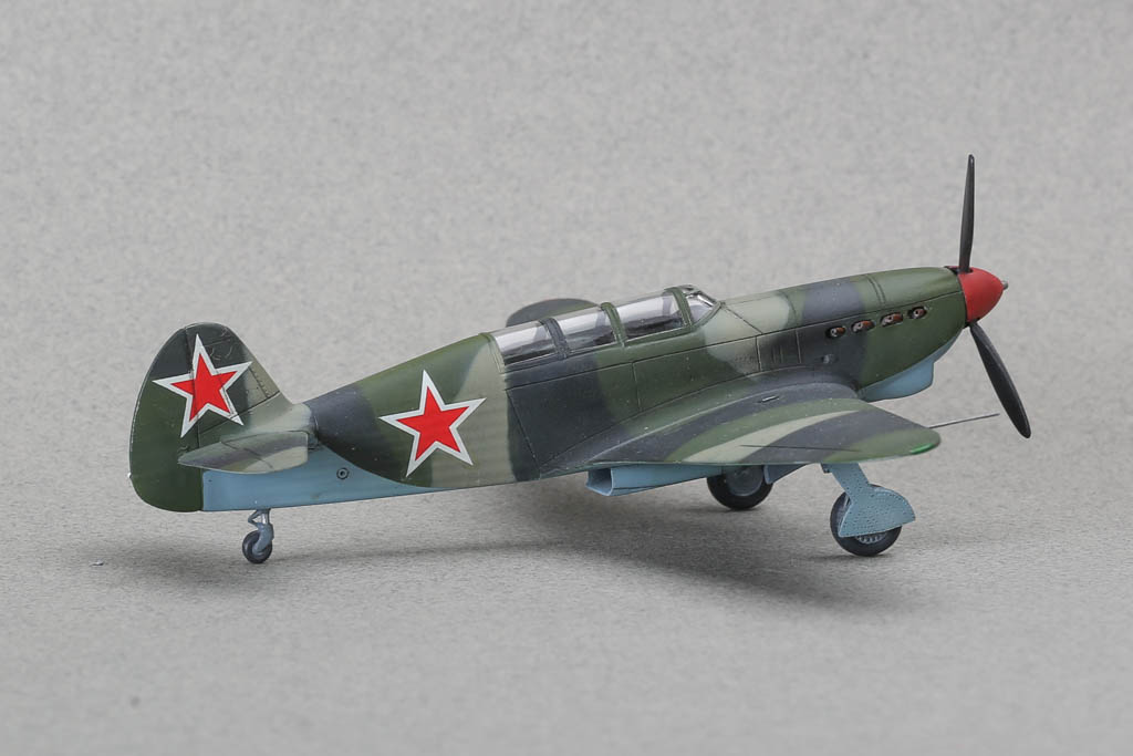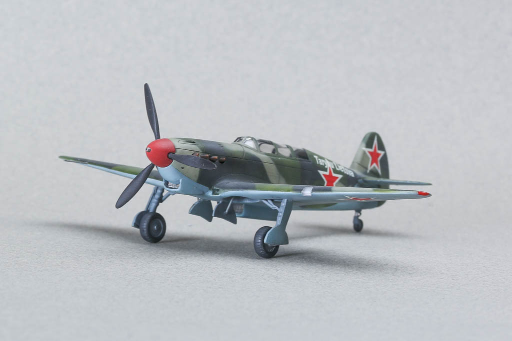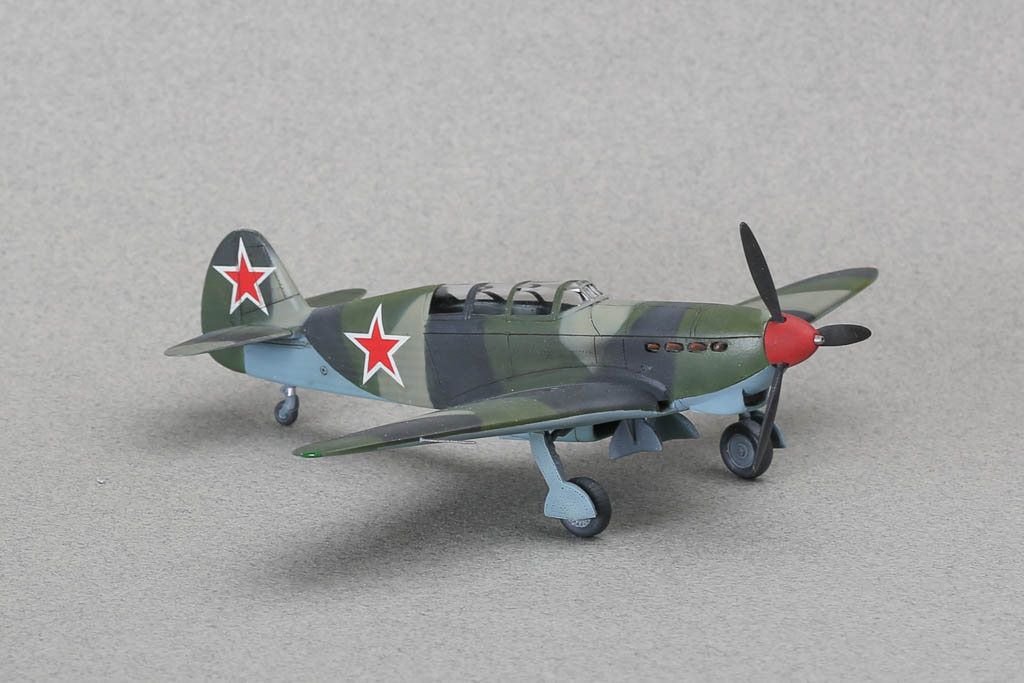 Модель очень простенькая, но вместе с тем сделана и окрашена хорошо. Трехцветный камуфляж под вопросом. Скорее традиционный зеленый-черный. И верно указали про три полоски на киле. Самолет этот 115гв.ИАП, и позицинируют его как Як-7В.