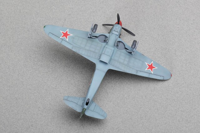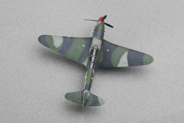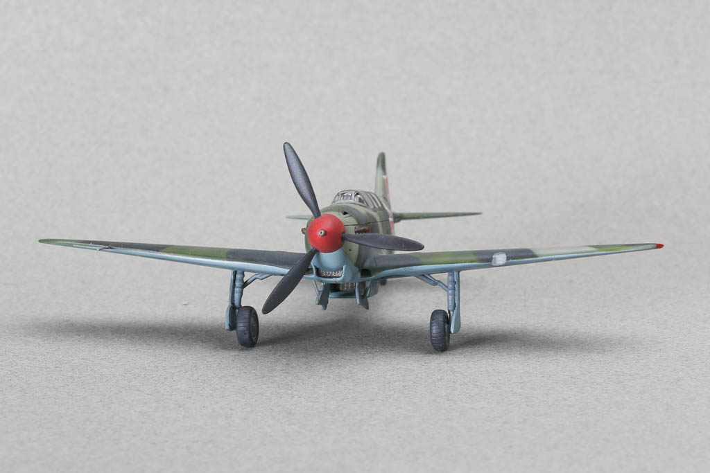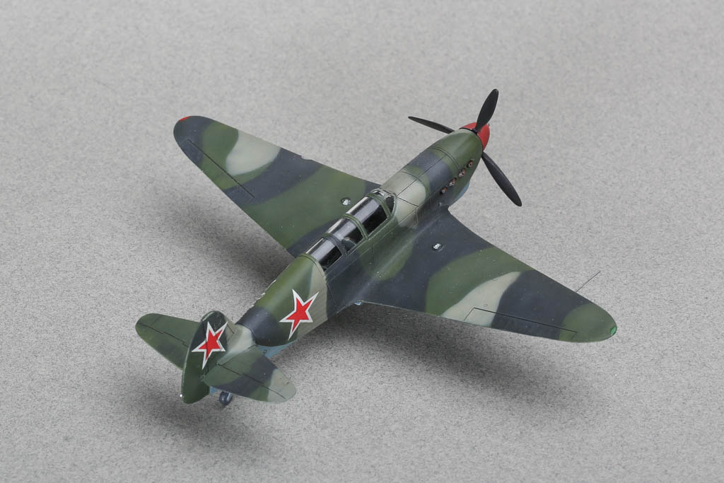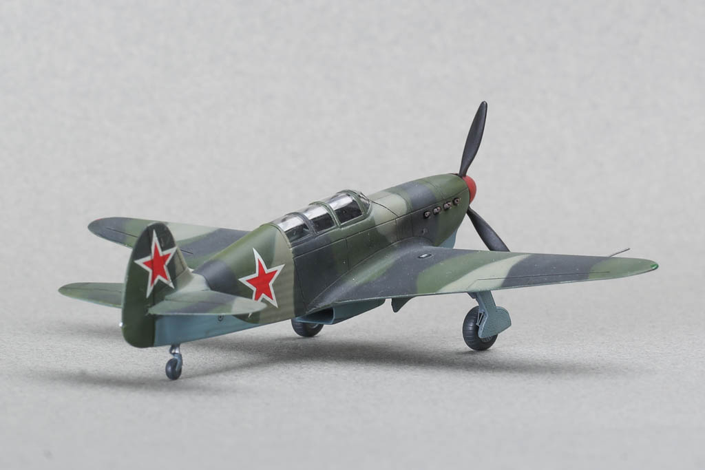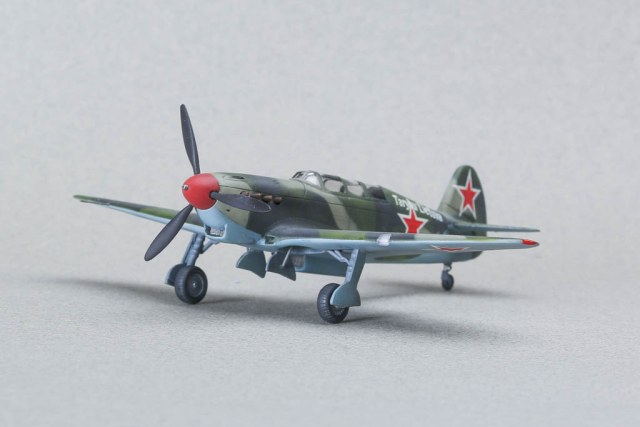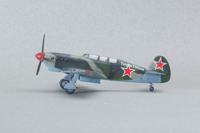 Модель очень простенькая, но вместе с тем сделана и окрашена хорошо. Трехцветный камуфляж под вопросом. Скорее традиционный зеленый-черный. И верно указали про три полоски на киле. Самолет этот 115гв.ИАП, и позицинируют его как Як-7В.