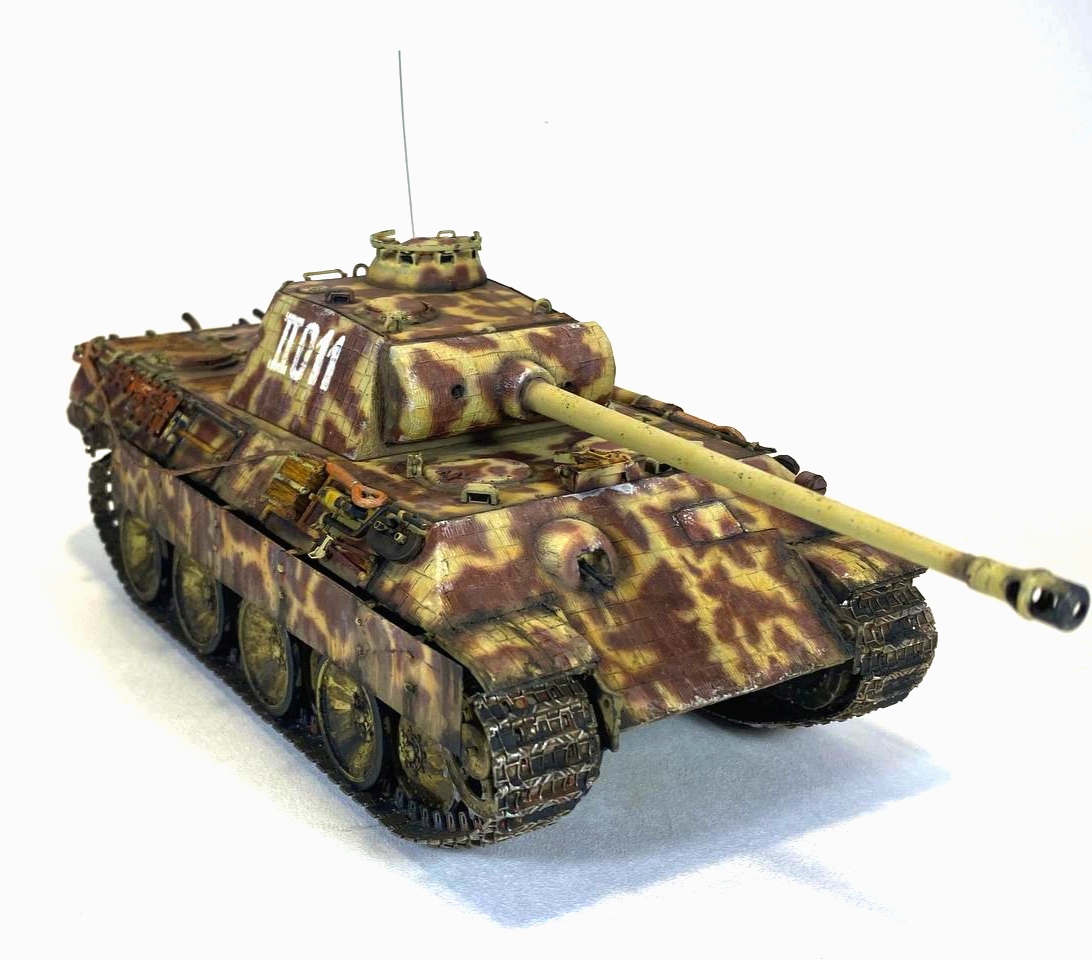 как понять "надувал от руки", вы аэром делали камуфляж или кистью?, если аэром , то зря, если есть инфа, что его рисовали кистью, пятна у вас крупнее, чем на прототипе, ничего проще, смотреть на фото и рисовать такие же пятна)), очередная пантера с трубками вентиляции заржавленными как выхлопы, трос коротковат, по поводу траков не переживайте, было и такое, циммерит хорошо получился, ствол у прототипа вероятнее всего в тёмно-сером грунте.