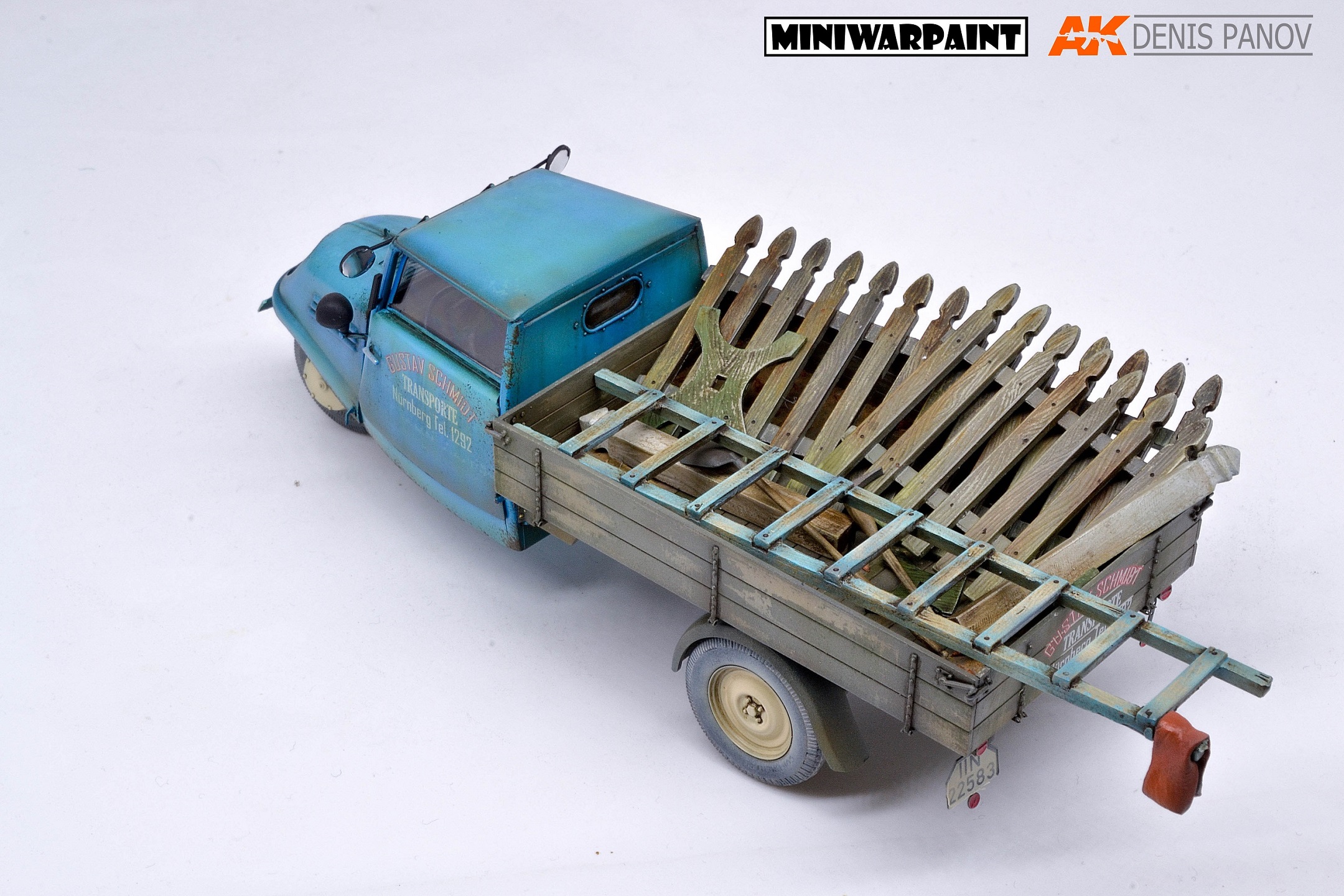 Для придания модели реалистичности, сделал легкий везеринг. В кузов до укладки инструмента и груза набросал немного мусора. Окраска доставила массу удовольствия. Прорисовка отдельных элементов, например ребристой поверхности сиденья, структуры деревянных деталей или болтовых и гвоздевых соединений требуют особой тщательности и привносят элемент творчества. Очень выручили кисти mini war paint, которые на сегодня, пожалуй, лучшие для подобной работы и я могу рекомендовать их всем. Особенно актуальны и полезны оказались кисти из серии Liner (для проливки эмалевыми красками или нанесения линий слоями) и серии Regular (для прорисовки мелких деталей точечно).
