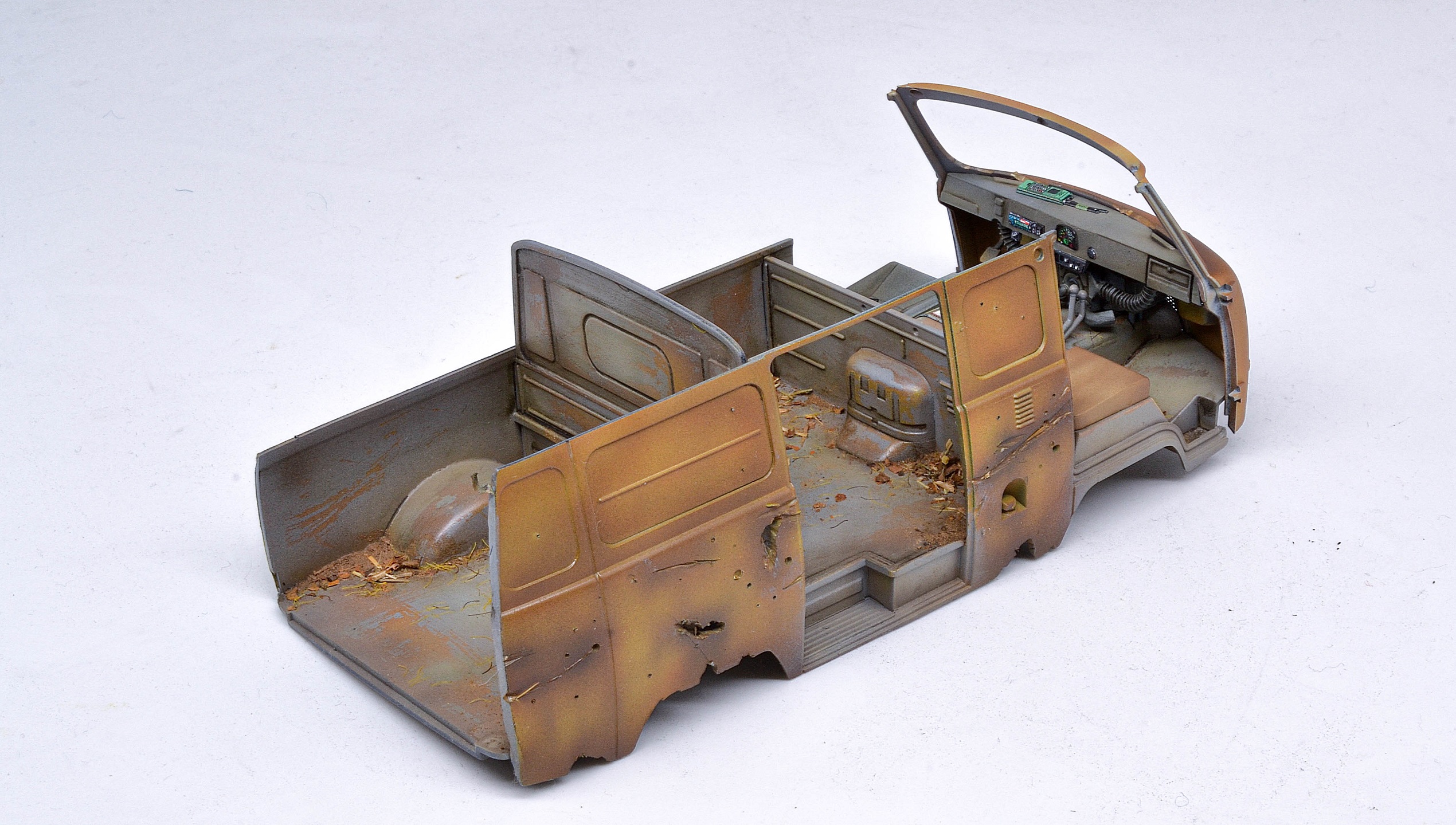 Делать стоковую модель всегда скучновато, они все похожи друг на друга как близнецы, различия только в том, насколько качественно исполнена мастером техническая часть работы, для творчества и полета фантазии остается слишком мало места. Тем более у «Звезды», вариативностью она совсем не балует, (задние подножки - делать откинутыми или сложенными, выбор переднего бампера и окна в задней части кузова можно будет сделать как прозрачными, так и закрытыми заглушками). Не густо.