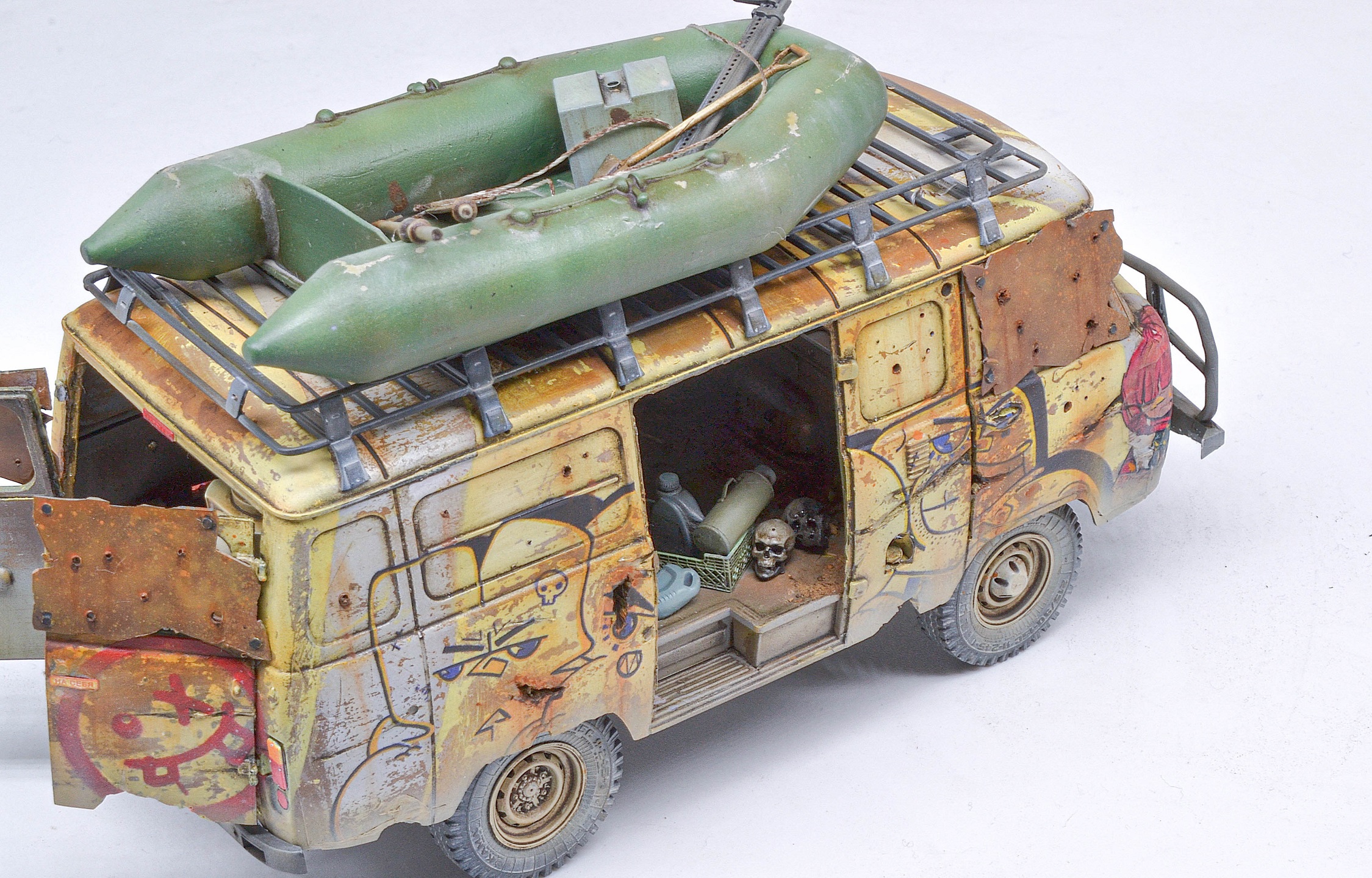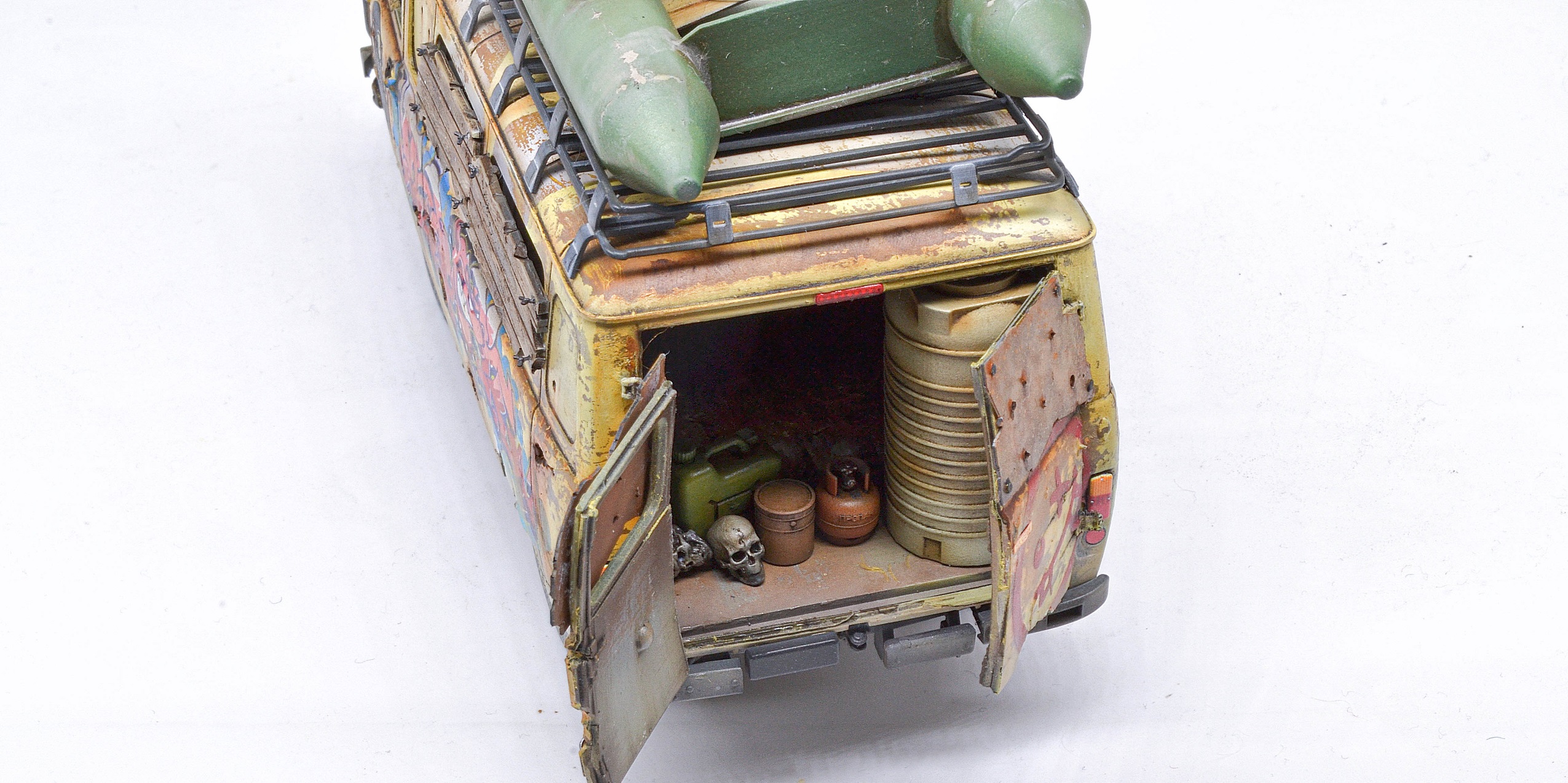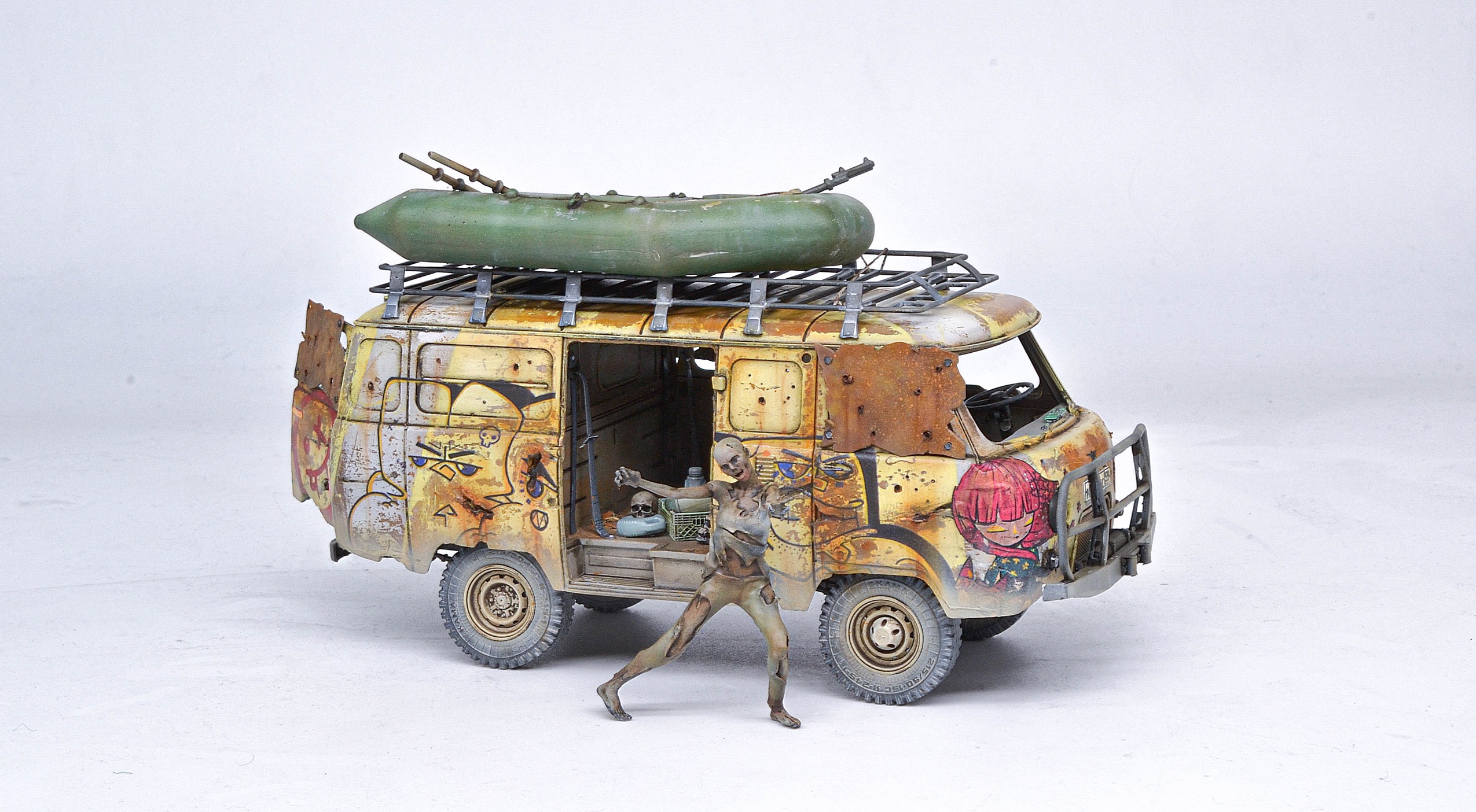 Исполнение и раскраска просто супер, а вот отсутсутвие лобового стекла (или зашитных решеток) - незачёт. Все зомби через пять минут в кабине водителя тусоваться будут, и он в качестве главного блюда.