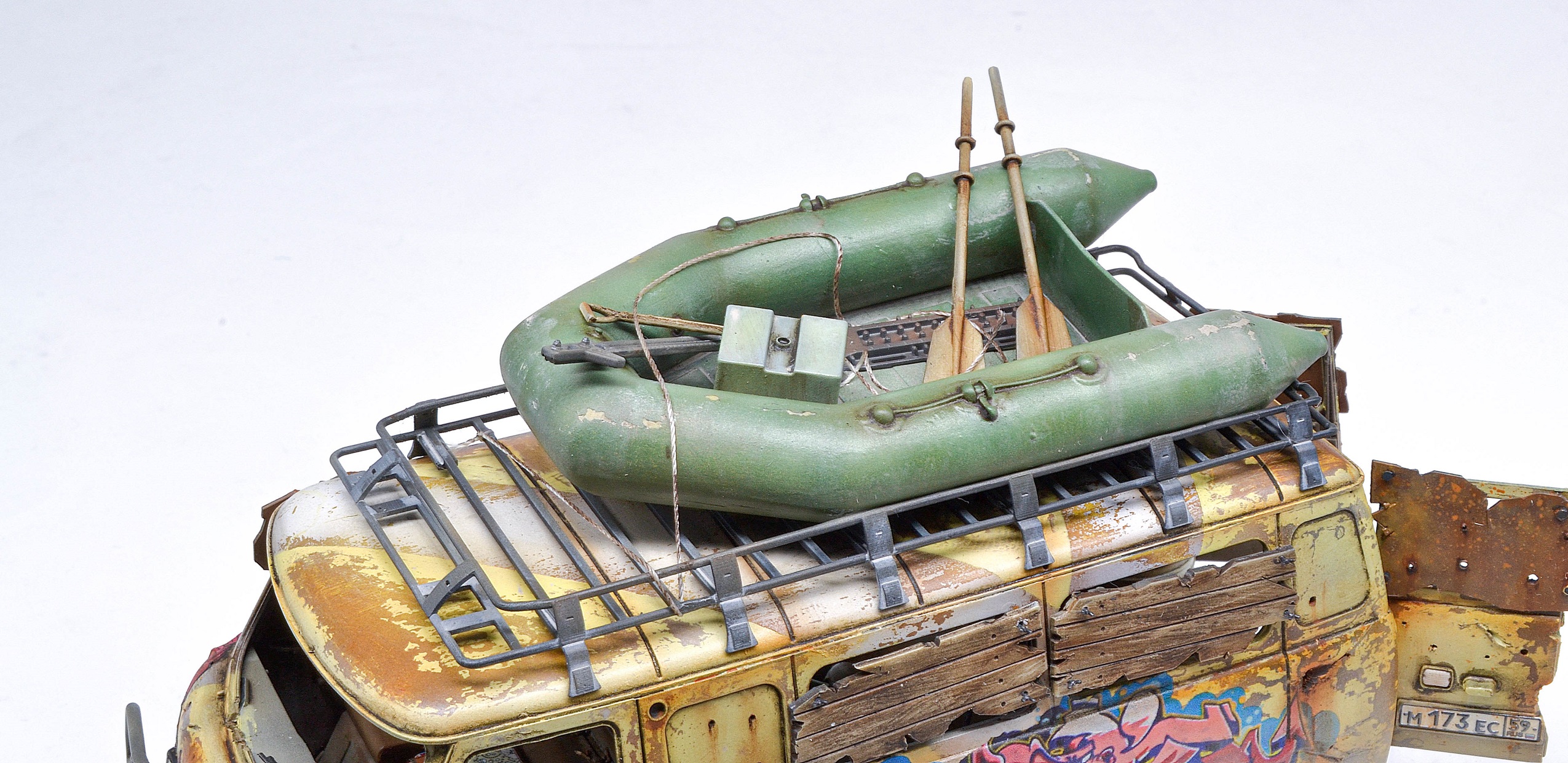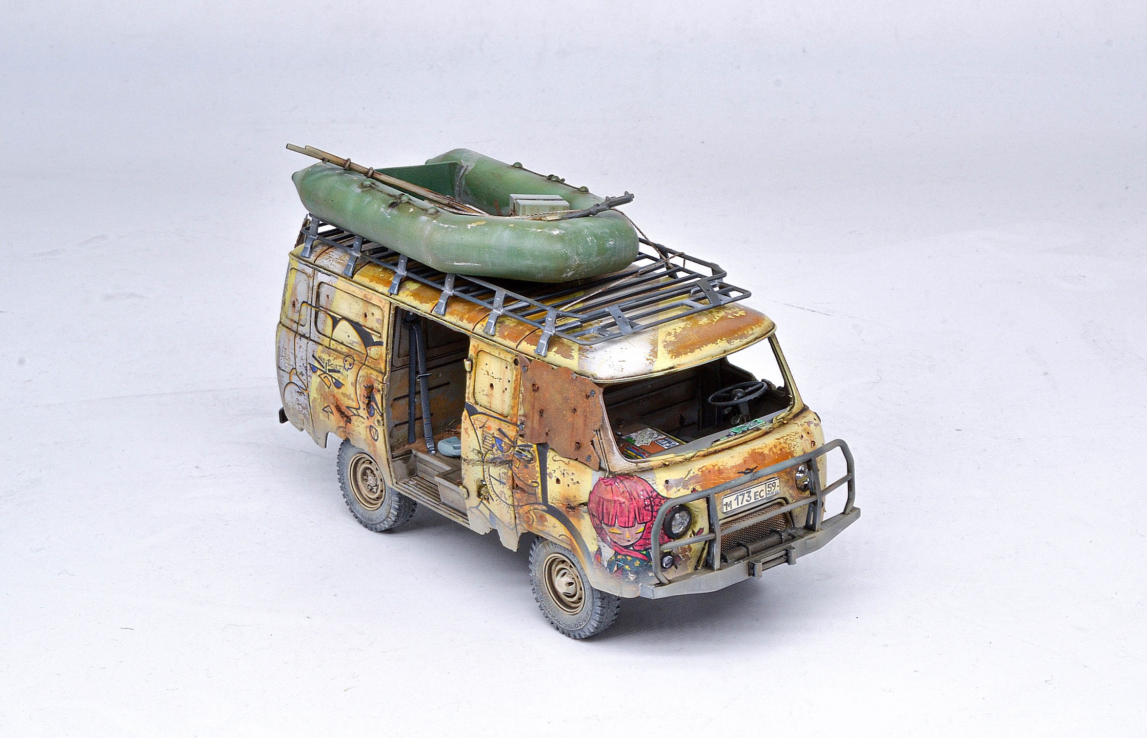 Разумеется, привел в нужный вид и экстерьер: AM35147 Обвес внедорожный (cиловые пороги, бампер силовой передний с лебедкой). На крышу, естественно, AM35145 Багажник экспедиционный большой, а в качестве груза AM35143 Лодка надувная Zodiac.