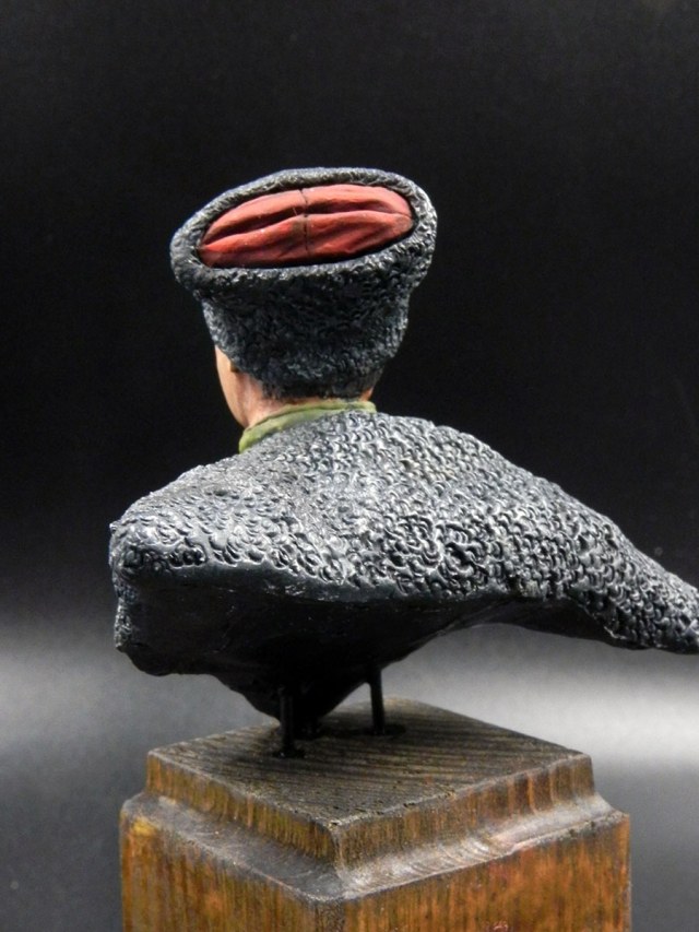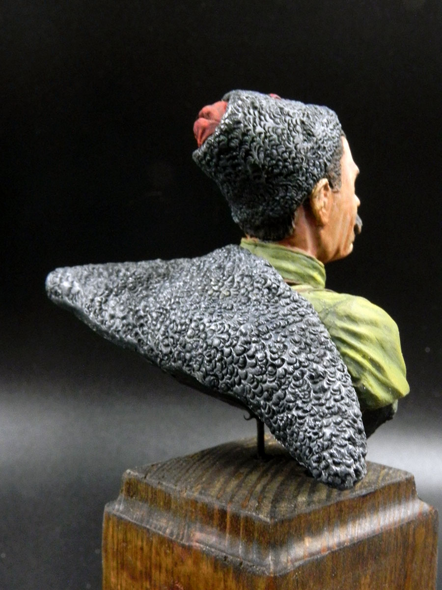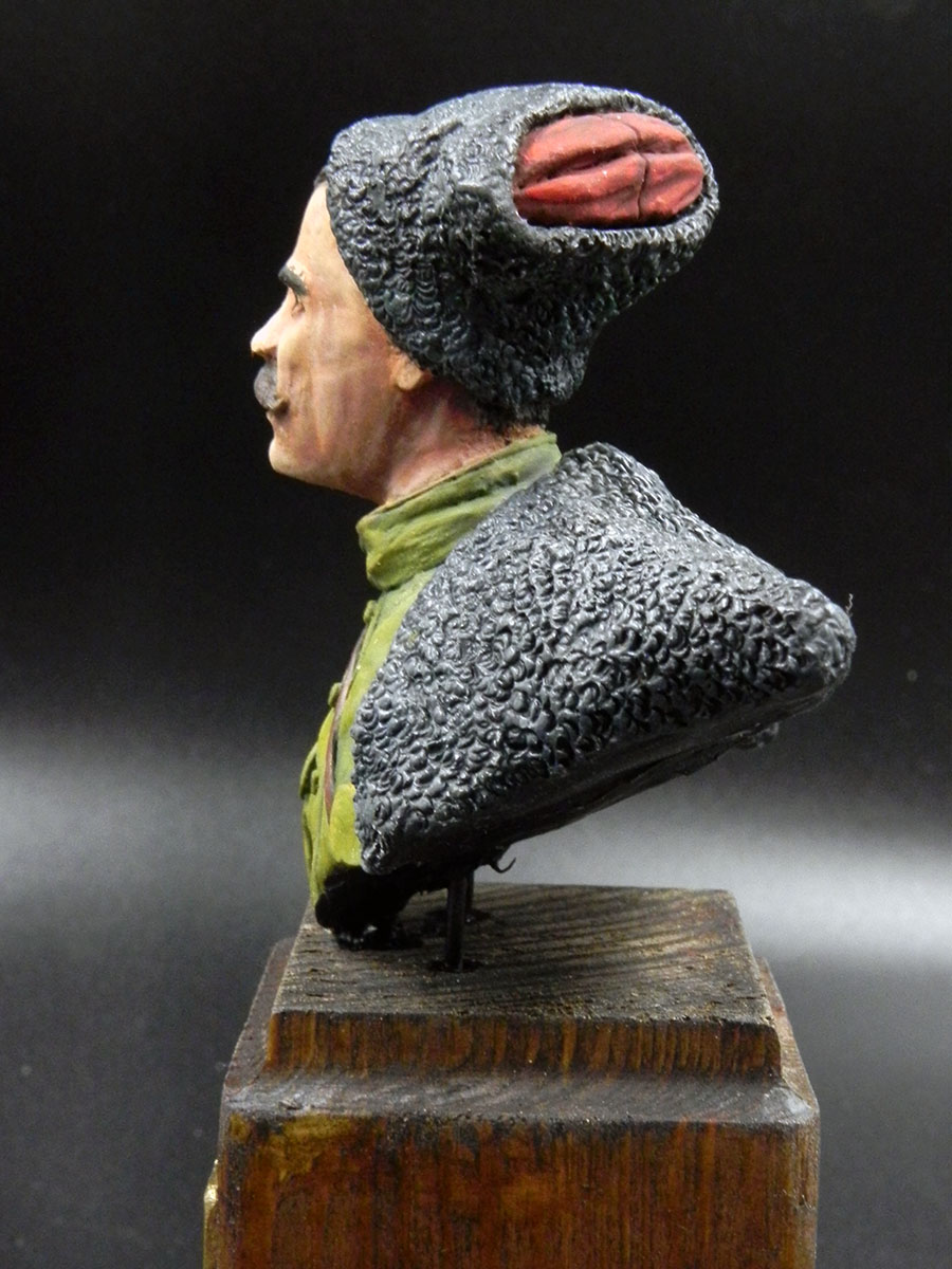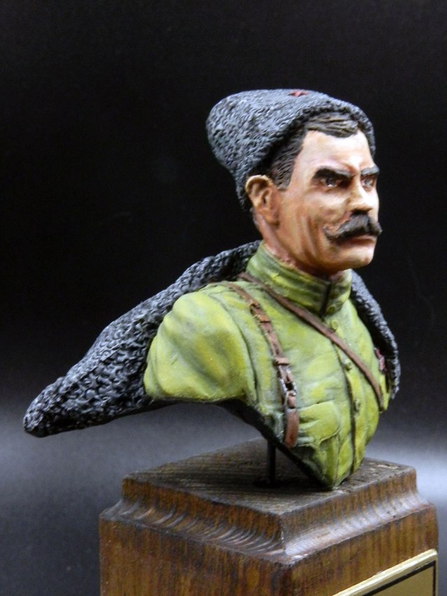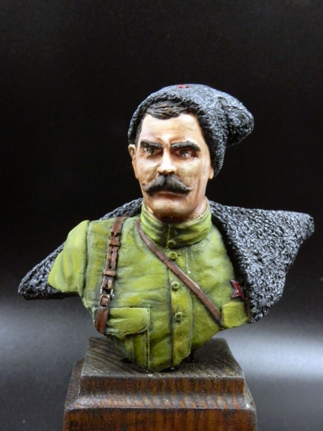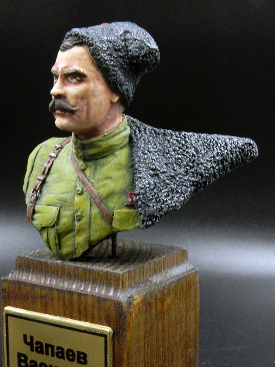 Продолжаю осваивать миниатюру. В этот раз замахнулся на крупный масштаб. Бюст легендарного комдива в масштабе 1:10 купил по случаю, наткнувшись на него в одном из московских магазинов, в который зашёл, чтобы убить время перед поездом. Подставку сочинил самостоятельно. Сначала пробовал работать акрилом. Но быстро понял, что на таком масштабе маслом работать гораздо удобнее.