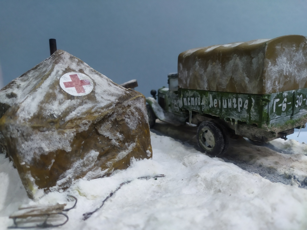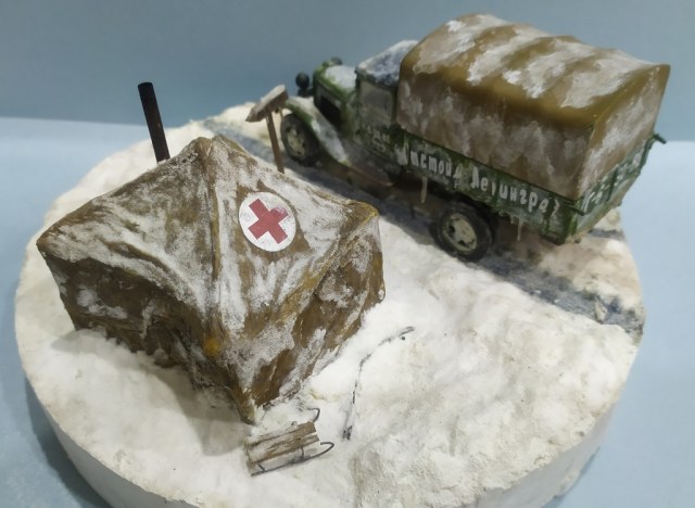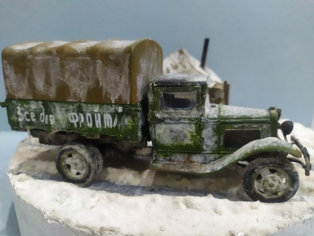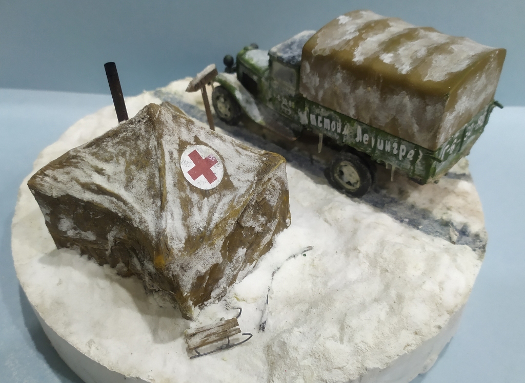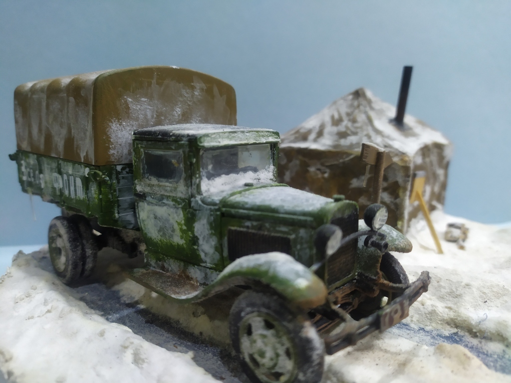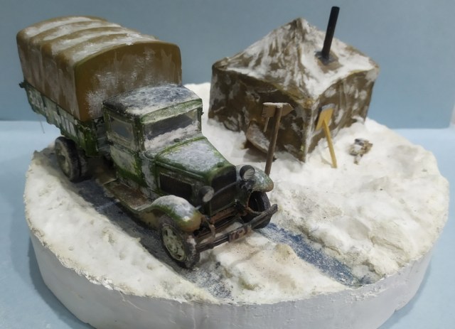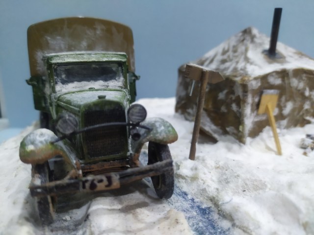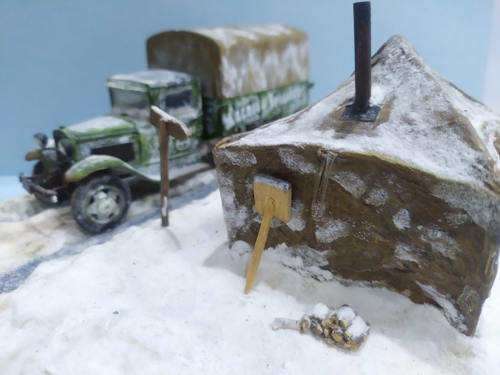 Хотел фигуры сделать, но просто полуторка была собрана мною давно и не предполагала участие в диораме. Поэтому кабина была наглухо заклеена, а ковырять кабину мне не очень то и хотелось. Поэтому вот так. А как просто фигуры сделать (стоящие рядом с палаткой или ещё как то я не догадался
