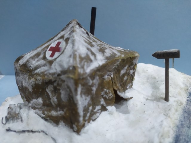 Основание из гипса. Палатка из салфеток, клея ПВА и проволочного каркаса, сугробы изготовлены по той же самой технологии. Краски звездовские. Снег из пищевой соды. Одна из первых работ поэтому хотелось бы услышать какую-нибудь критику и какие-нибудь советы