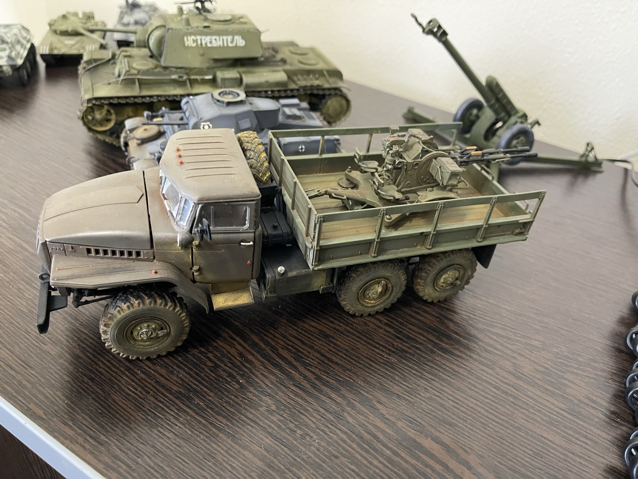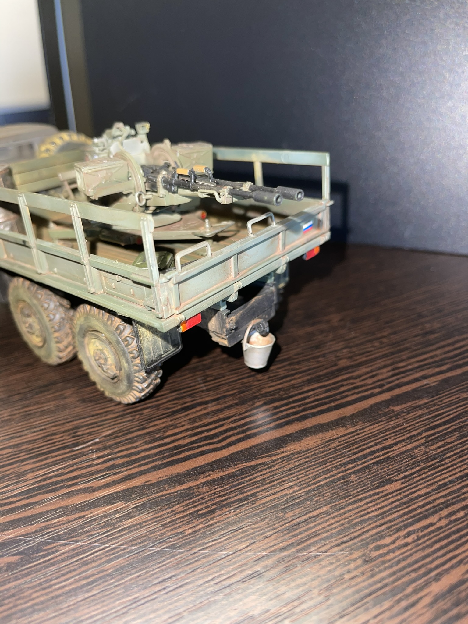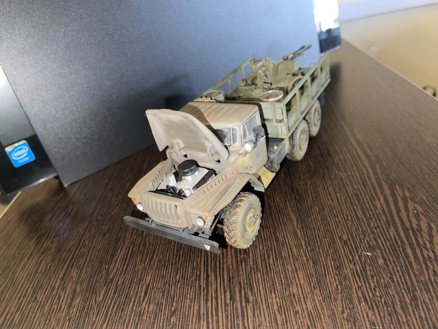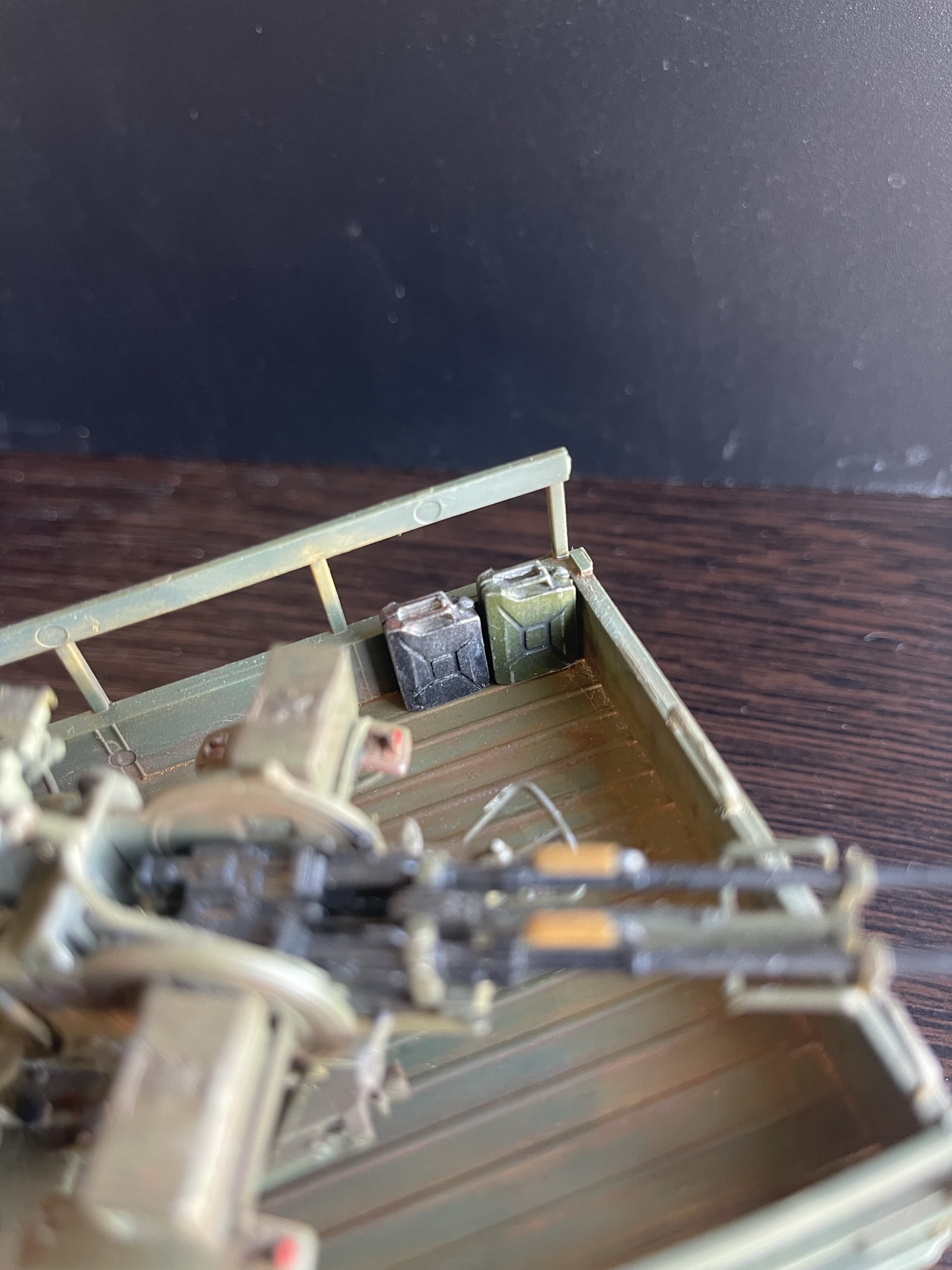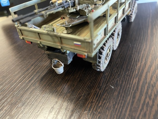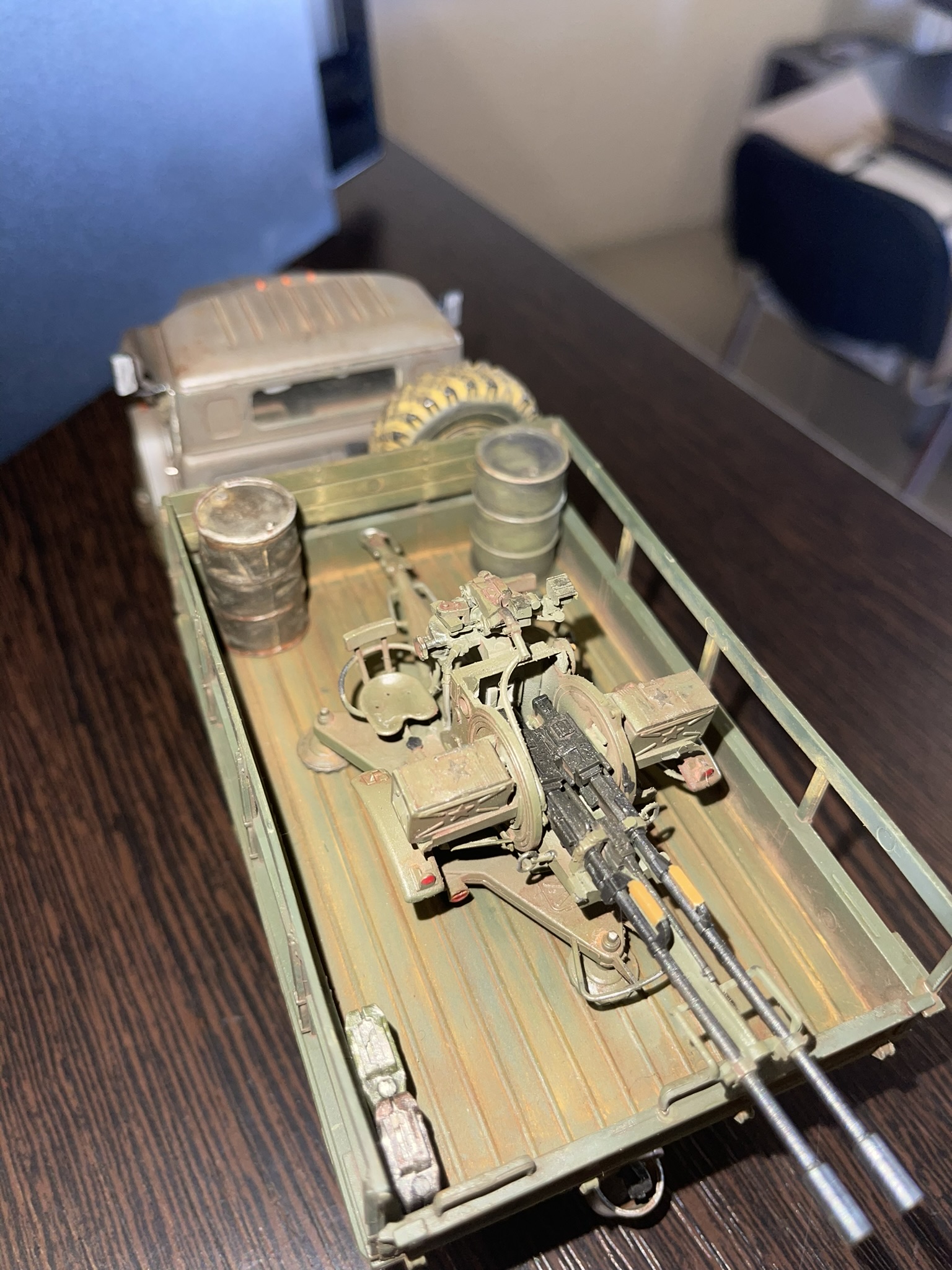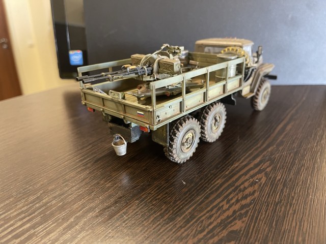 Сложно было делать... Старый ICM. Много несовпадений, много наждачки и краски - это по автомобилю. Зенитка Менг - просто супер, аксессуары в виде бочек, канистр и ведра - Tamiya - из пластика бесспорно лучшие. Модель любительская поэтому прошу снисхождения. Старался передать то, что видел