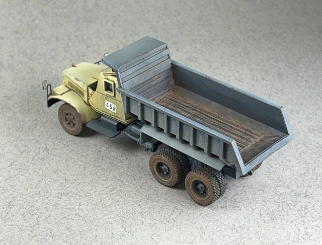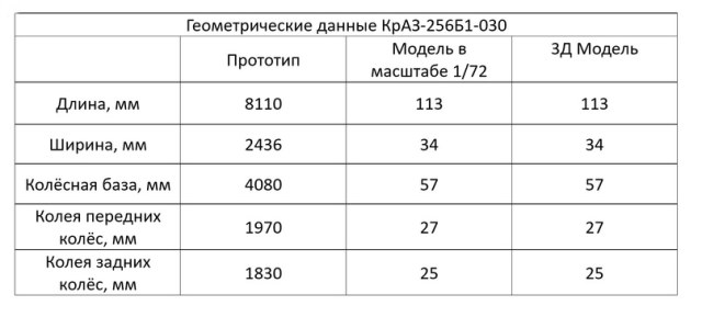 3Д модель очень качественно повторяет свой прототип. Очень интересная модель, при том условии, что в ней всего 11 деталей! Данный КрАЗ относится ко второй серии из 10 машин. Это можно определить по боковому окну, которое успели поставить только на вторую партию. А геометрию вы можете и сами оценить из приведённой таблицы.