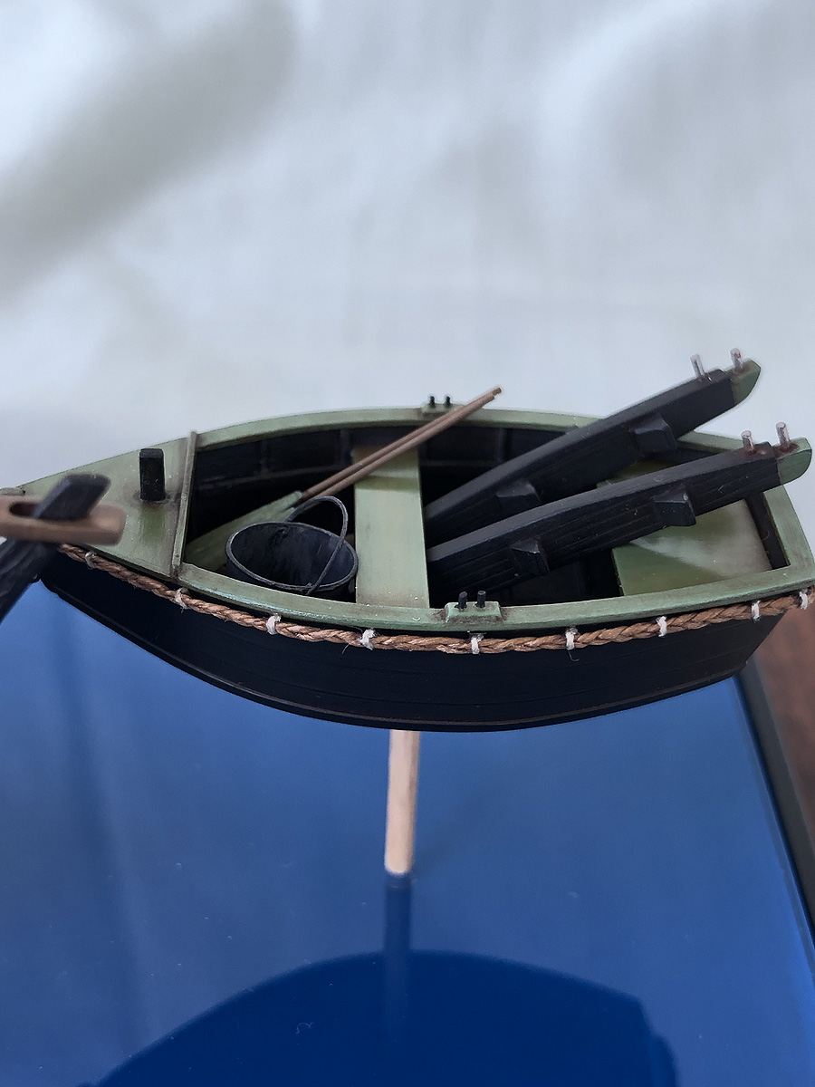 Покраска – всё кистью эмалями Humbrol. Стиль покраски я для себя назвал «в духе старой школы», так как мне хотелось сделать модель именно «как раньше». Красил без грунта, прямо по пластику. Затем без использования лака делалась затирка поверхностей не разбавленной масляной краской, излишки которой стирались бумажной салфеткой. Где-то использовалась классическая смывка, но без промежуточного лакового слоя. Лак на модели вынужденно использовался только на шлюпке – нужно было убрать излишнюю случайную глянцевость. Т.е. применение модельной химии – минимально. Считаю, что задумка удалась, результатом я доволен.