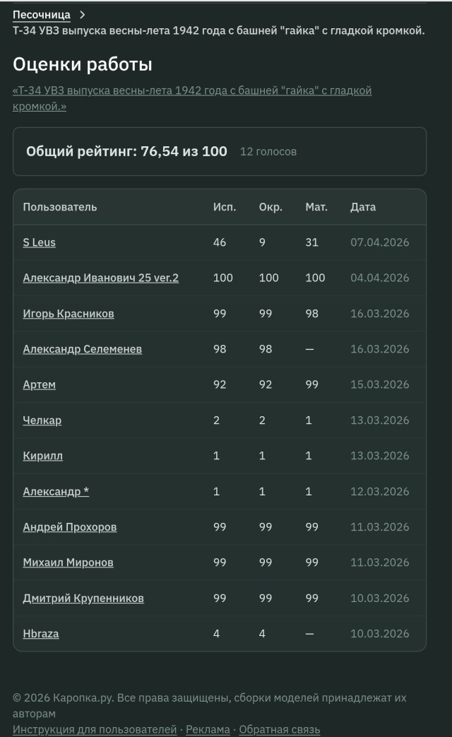 Предоставляю вашему вниманию Т-34 УВЗ выпуска весны-лета 1942 года с башней "гайка" с гладкой кромкой.
