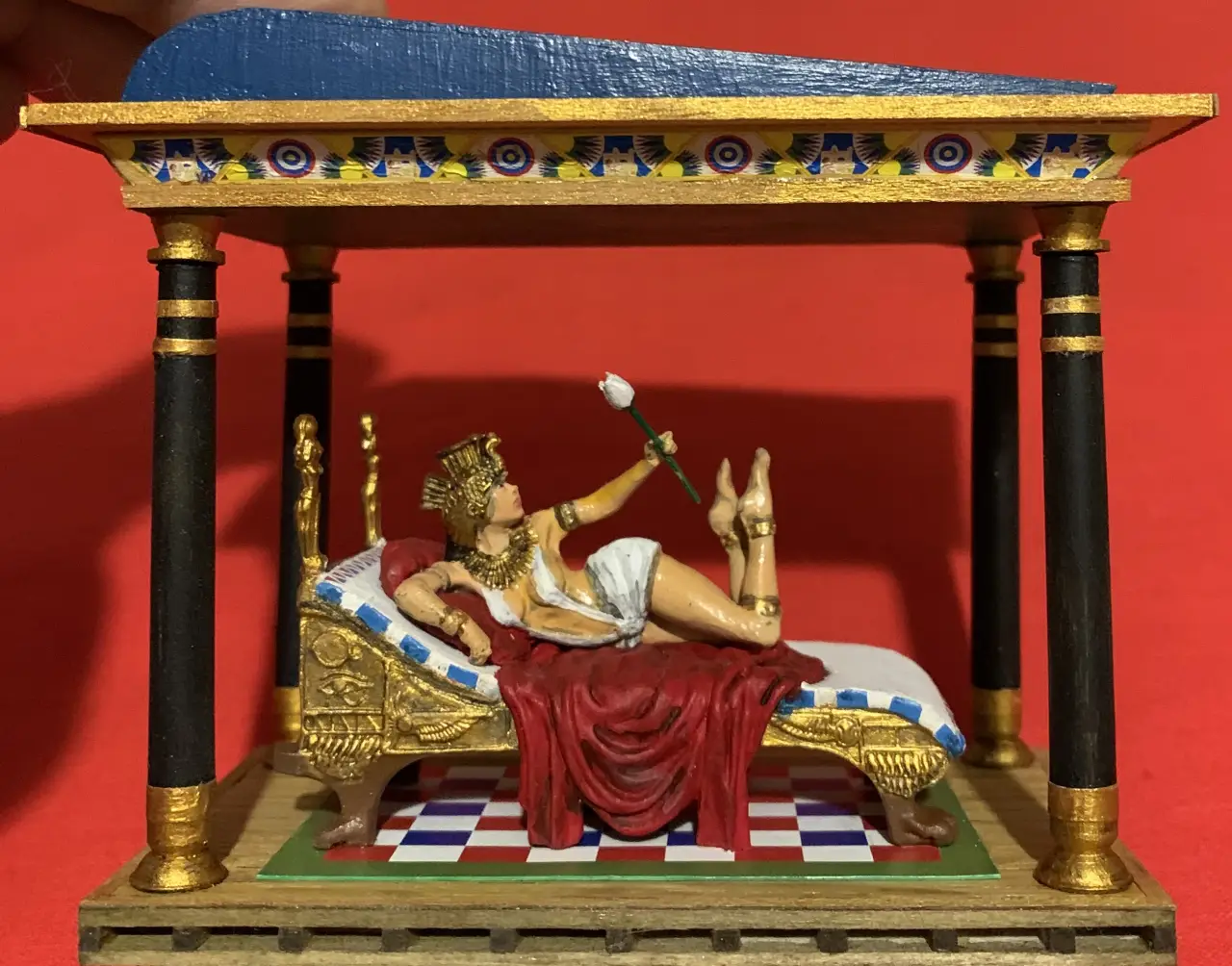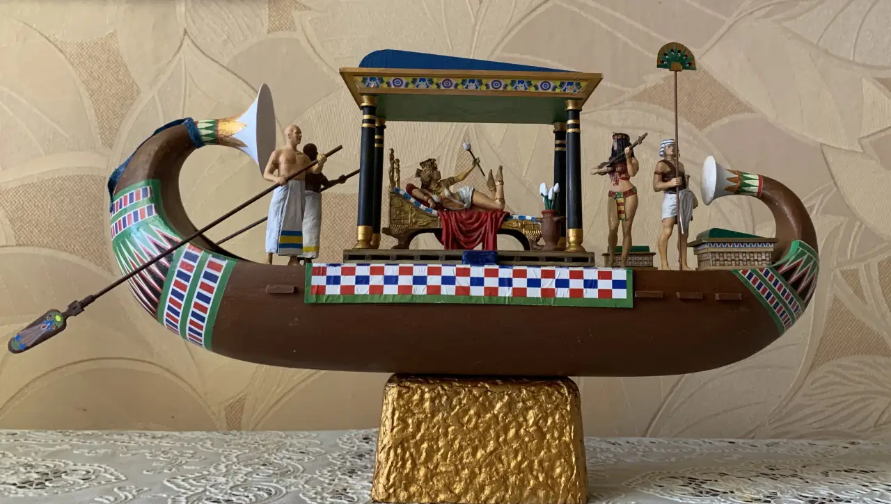 коллекцию самоделок-наглядных пособий для уроков истории в 5-6 класса по истории Древнего мира и Средних веков. Все они были изготовлены для книги "История своими руками", которая планируется к публикации в издательстве АСТ. За несколько лет автором было сделано множество самоделок из самых простых и доступных материалов предназначенных для иллюстрирования тех или иных разделов школьной программы. Ну, а после написания книги все они кроме некоторых особо памятных моделей были переданы школам города Пензы - №6(автор учился там с 1962 по 1972 г.), №47 и №80. Данная модель прогулочной ладьи Клеопатры сделана на основе моделей, найденных в гробнице фараона Тутанхамона и настенных барельефов. Основной материал - палочки размешиватели для кофе, рейки от старых вьетнамских циновок и ручки засохших кисточек. Фигурки выпускаются компанией "Silver Dream Studio" (масштаб 54 мм), но расписывались самим автором. Оконечности в форме распустившихся лотосов изготовлены фирмой "Фальконет" в технологии 3D печати, но можно их слепить и из пластилина, отформовать в парафин или виксинт и отлить из эпоксидной смолы.Раскраска - декали разработаны по эскизам автора фирмой «MAKSIPROF». Подставка из картонной емкости из-под упаковки пылесоса: набита камнями для веса и устойчивости и залита эпоксидкой, после чего раскрашена под "золото".