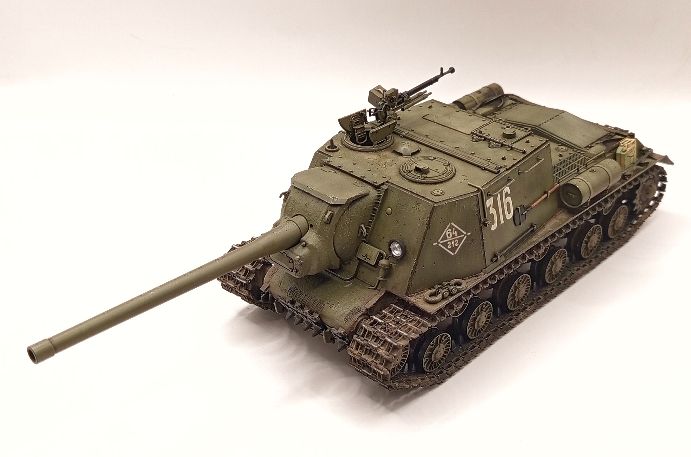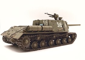 Доброго дня! Очень давно мечтал получить себе в коллекцию знаменитую САУ ИСУ-122. И именно с этим орудием, мне всегда казалось, что именно оно наиболее гармонично смотрится на этой машине. Производитель Тамия, с ней все понятно, сборка прекрасная и легкая, детали буквально сами слипаются без клея и смещений. В порыве модельной страсти упустил момент пропажи одной детали - кронштейна слева от мехвода.