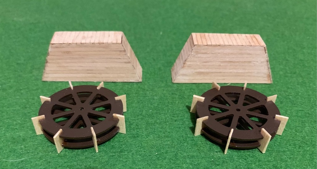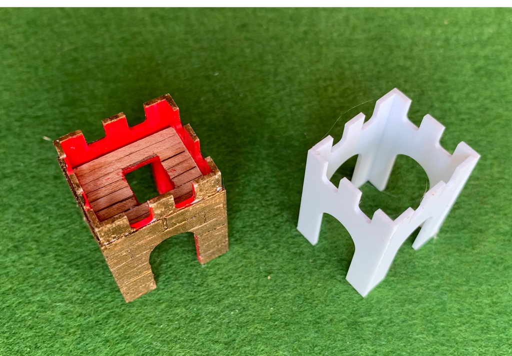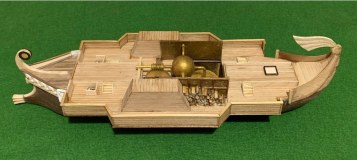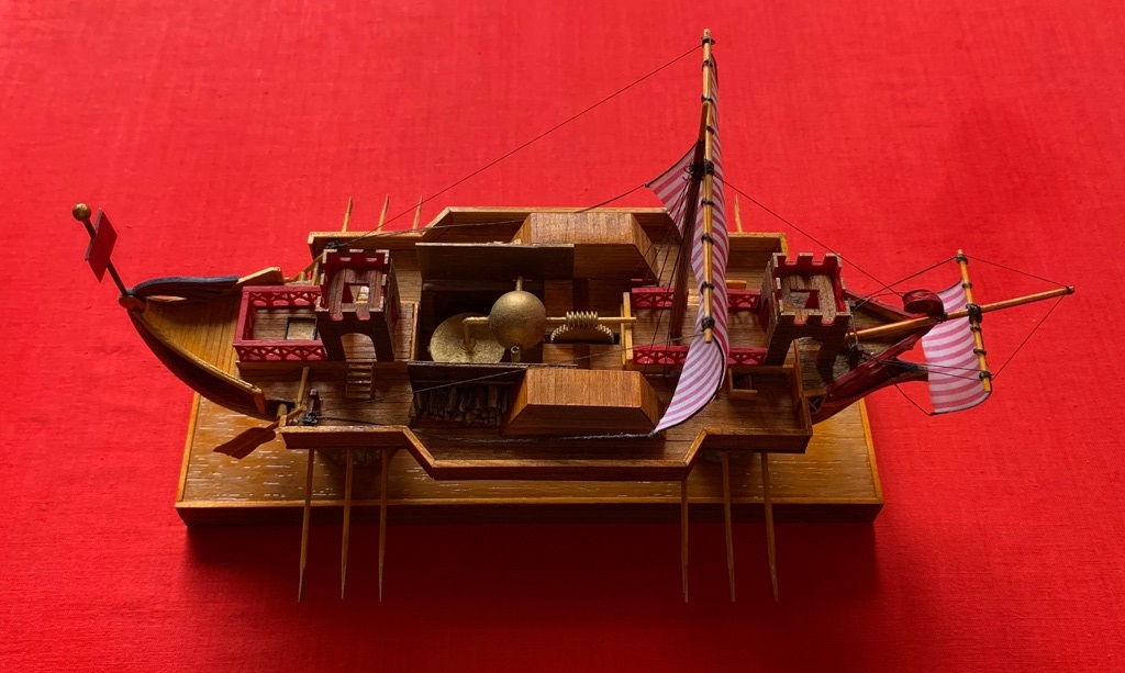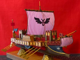 Модель – полностью самоделка. Центральная часть корпуса наборная из палочек-мешалок от кофе и реек, а нос и корма отлиты из гипса в парафиновых формах с пластилиновых моделей. Все деревянные детали – липовые ламели толщиной 1 мм, и рейки из ольхи шириной 2 мм. Отдельные поручни распечатки в 3D. Окраска – масло с воском и акриловые краски, украшение на парусе – термопечать. Боевые башни склеены из деталей из полистирола вырезанных на станке с ЧПУ. Щиты по бортам из картона с переведенными на них декалями. Две опоры подставки – конусы из-под картонных упаковок от куриных яиц заполненные эпоксидной смолой и покрашенные краской «античное золото». Модель предназначена для использования на уроках истории и… физики, причем в одной из школ на юге нашей страны этой моделью очень заинтересовались и тамошний учитель физики задумал ее повторить!