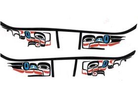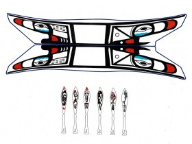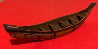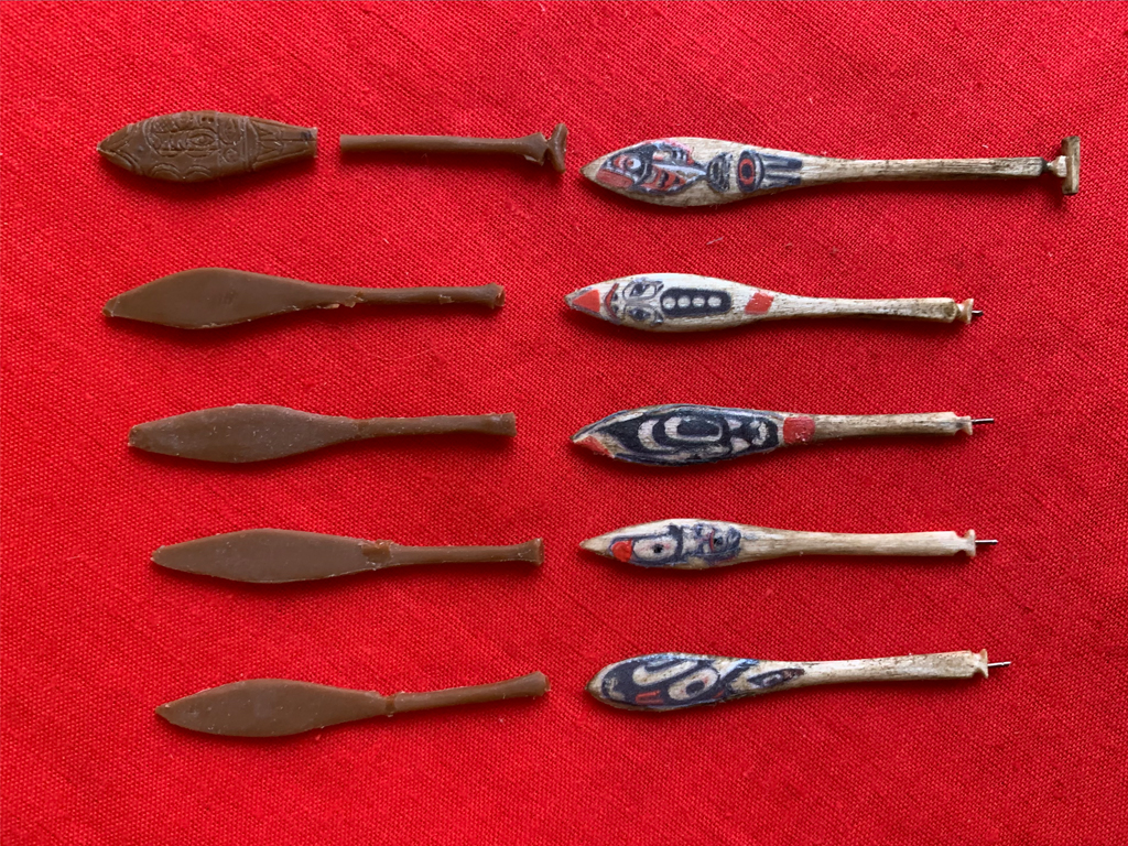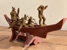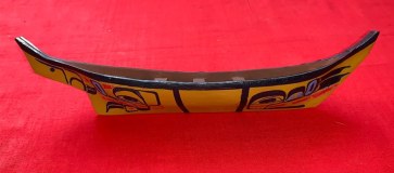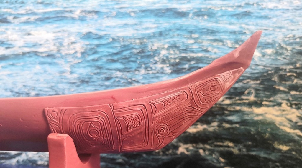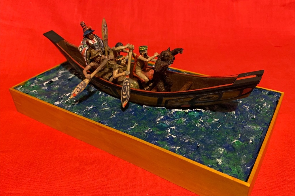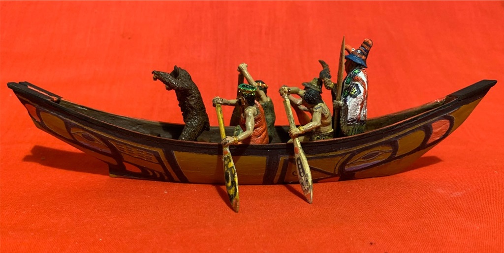 А было так, что для книги «История своими руками» мне понадобились жилище и пирога индейцев тлинкитов с западного побережья Северной Америки. Узнал, что и пирогу, и ее «экипаж» в нашей стране выпускает студия «Человечек» Ивана Костенко. Написал ему о проекте, и он был столь любезен, что прислал мне полный набор фигурок и пирогу. Причем в седалище каждой фигурки был вделан магнит, а второй магнит был вделан в лавку-сиденье пироги, так что когда человечков в нее сажали, они в ней держались очень даже крепко. Поскольку концепция Ивана заключалась в производстве игровых фигурок, то есть сделанных из мягкого пластика, раскрашивать их было довольно тяжело. Но хуже всего лично для меня, поскольку я делал наглядное пособие для уроков, а не просто модель, было то, что в руках у «человечков» были мягкие весла. Их просто невозможно было расписать тлинкитскими узорами. Другой недостаток прятался в сделанной Иваном пироге. Она в отличие от фигурок была жесткой, но вот узоры на ее бортах были выпуклыми и точно также совершенно не годились для раскраски. Кроме того, каное мне хотелось сделать самому, воспользовавшись фотографией из Музея Индейцев в Вашингтоне – см. фотографию на сером фоне. И… каноэ я сделал, сделал по своей традиционной технологии, выгнув детали корпуса из палочек-мешалочек для кофе, чем, кстати, очень удивил Ивана Костенко. Раскрасить это каноэ вручную было также невозможно чисто физически, и я заказал для него термодекали по образцу раскраски каноэ из США. Второй вариант – декали традиционные, но их использовать не пришлось. Также были сделаны термодекали и на весла. Пришлось у «мягких тлинкитов» весла из рук вырезать, делать новые весла из палочек для мороженого, печатать на них рисунок с помощью термодекалей, и… давать их в руки раскрашенным тлинкитам, закрепляя в руках миниатюрными стержнями из проволоки 0,5 мм при помощи суперклея. Готовая пирога с «экипажем»: воины, вождь и жрец, одетый в шкуры медведя, была выставлена на подиум, склеенный из ученических линеек, и наполненный «водой» из папье-маше. А само это папье-маше есть не что иное, как размоченные в горячей воде упаковки из-под куриных яиц, с пропиткой из клея ПВА. Оказывается из них можно получить очень даже неплохое море!