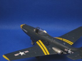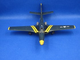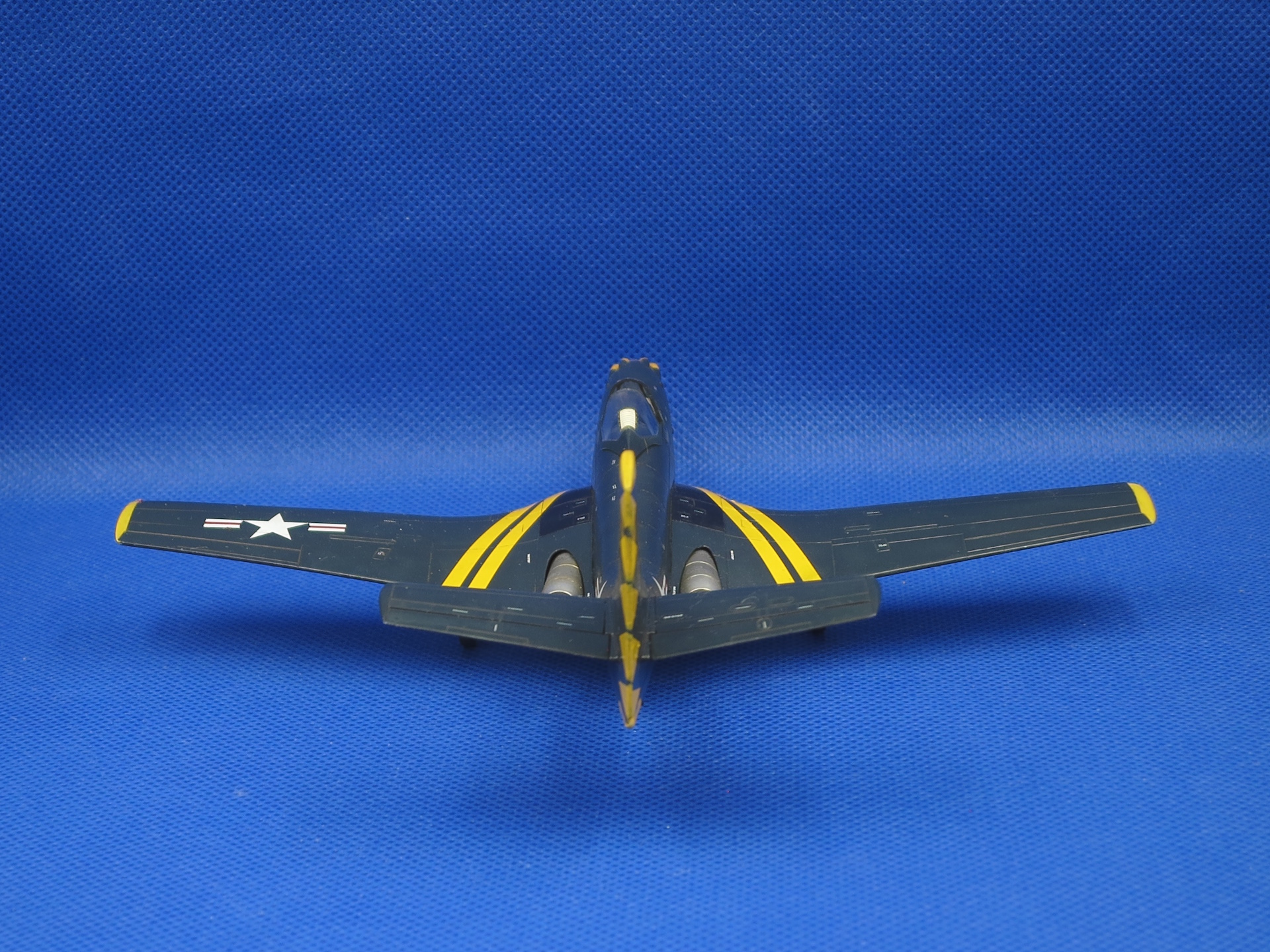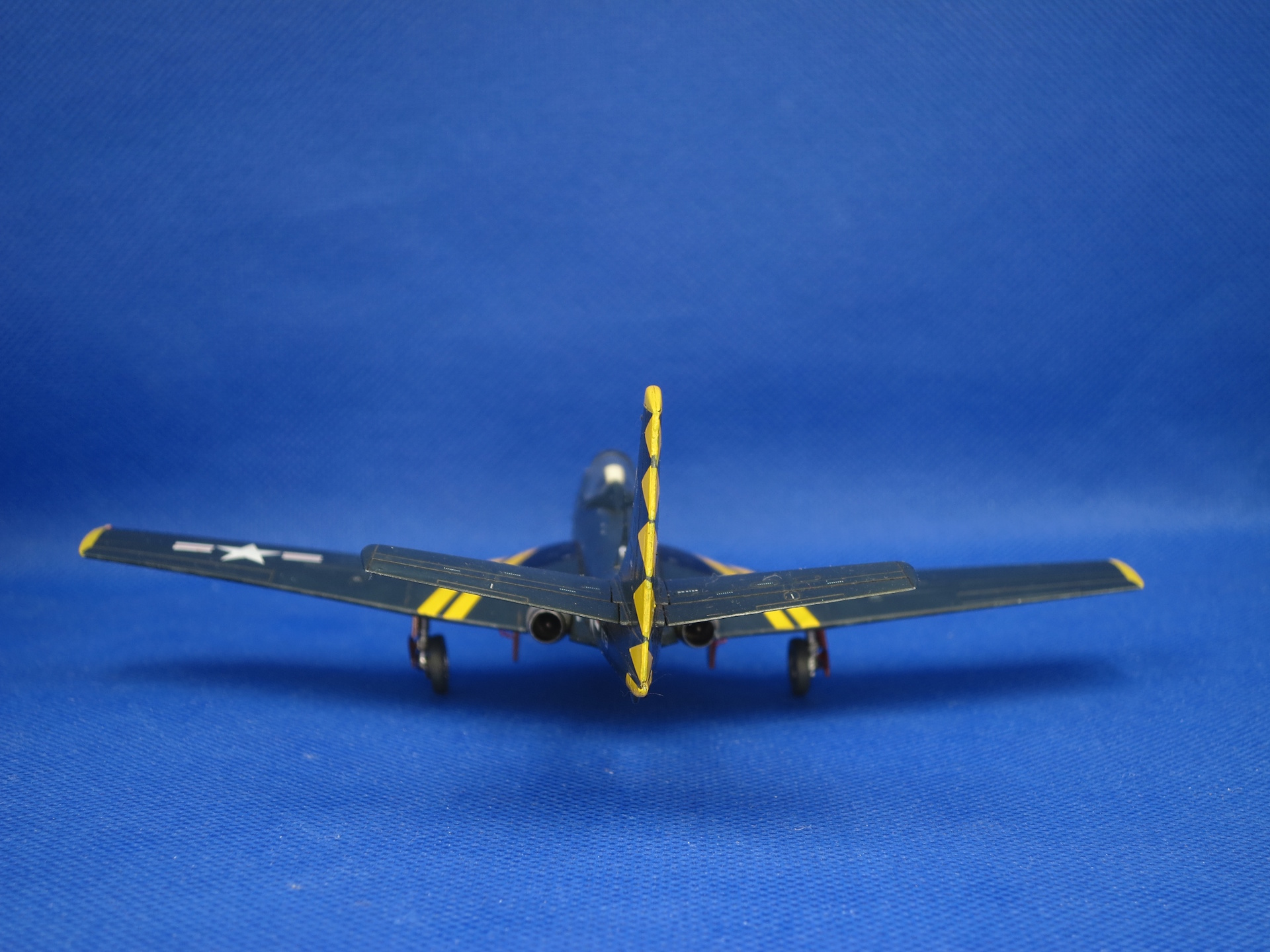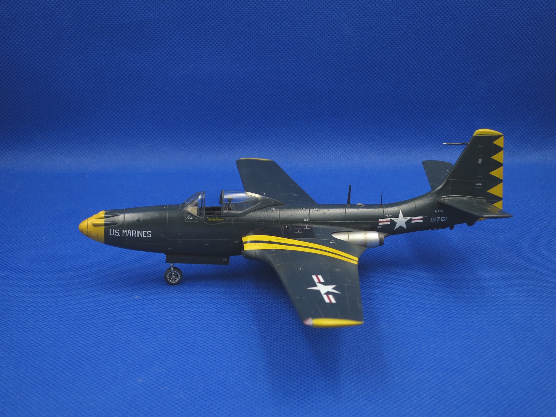 Окраска традиционно, gunze night blue. Этот цвет дает как раз чуть разные оттенки при разном освещении. Т.к. уныло-синий аппарат не очень хотелось, постарался собрать что-нибудь более яркое, как раз Special Hobby дает вариант из пилотажной эскадрильи Flying Leathernecks (VMF-122, US Marine Corps). В сочетании с желтым достаточно интересно получилось, как по мне.
